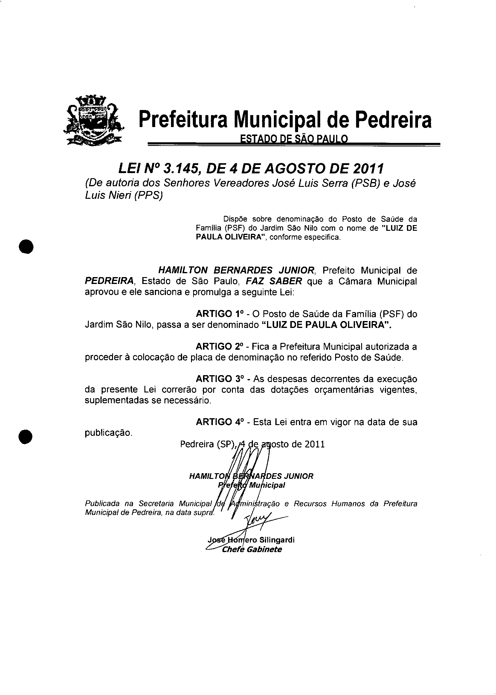 Ementa: Dispõe sobre denominação do Posto de Saúde da Família (PSF) do Jardim São Nilo com o nome de "LUIZ DE PAULA OLIVEIRA", conforme especifica.