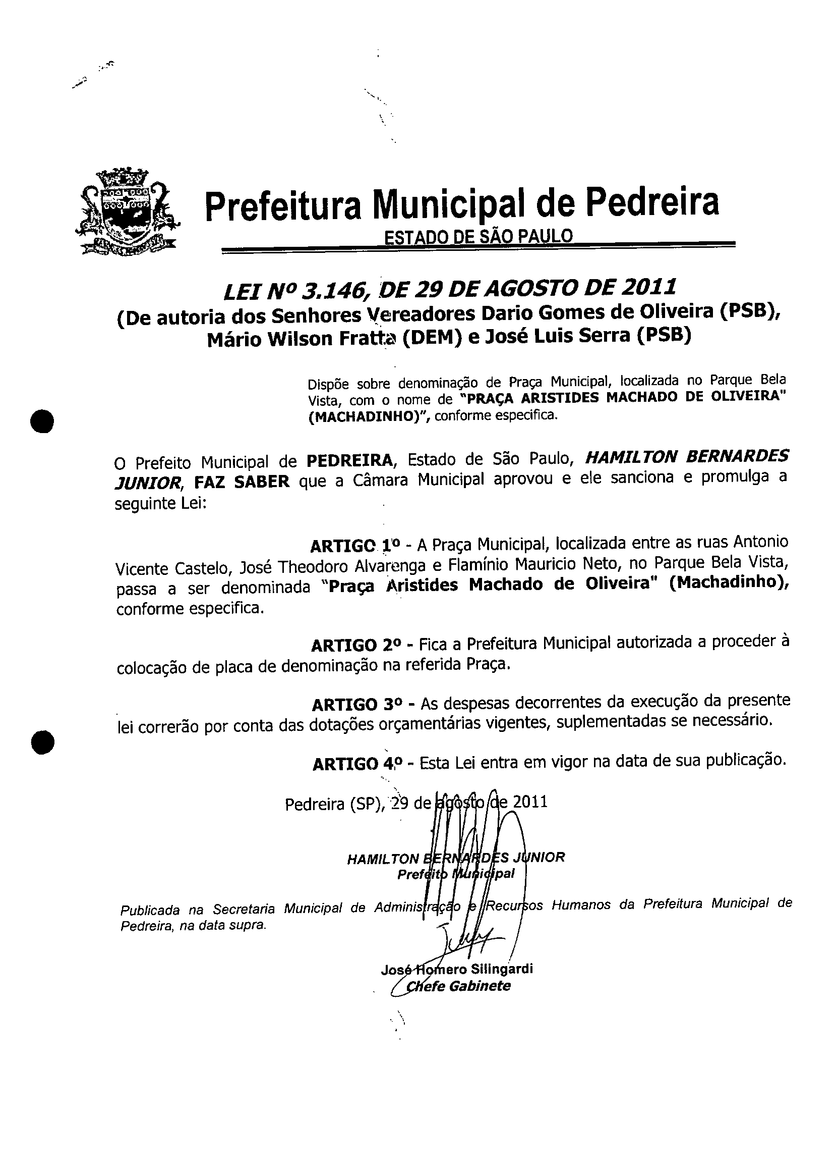 Lei Municipal - N° 3146 de 29/08/2011