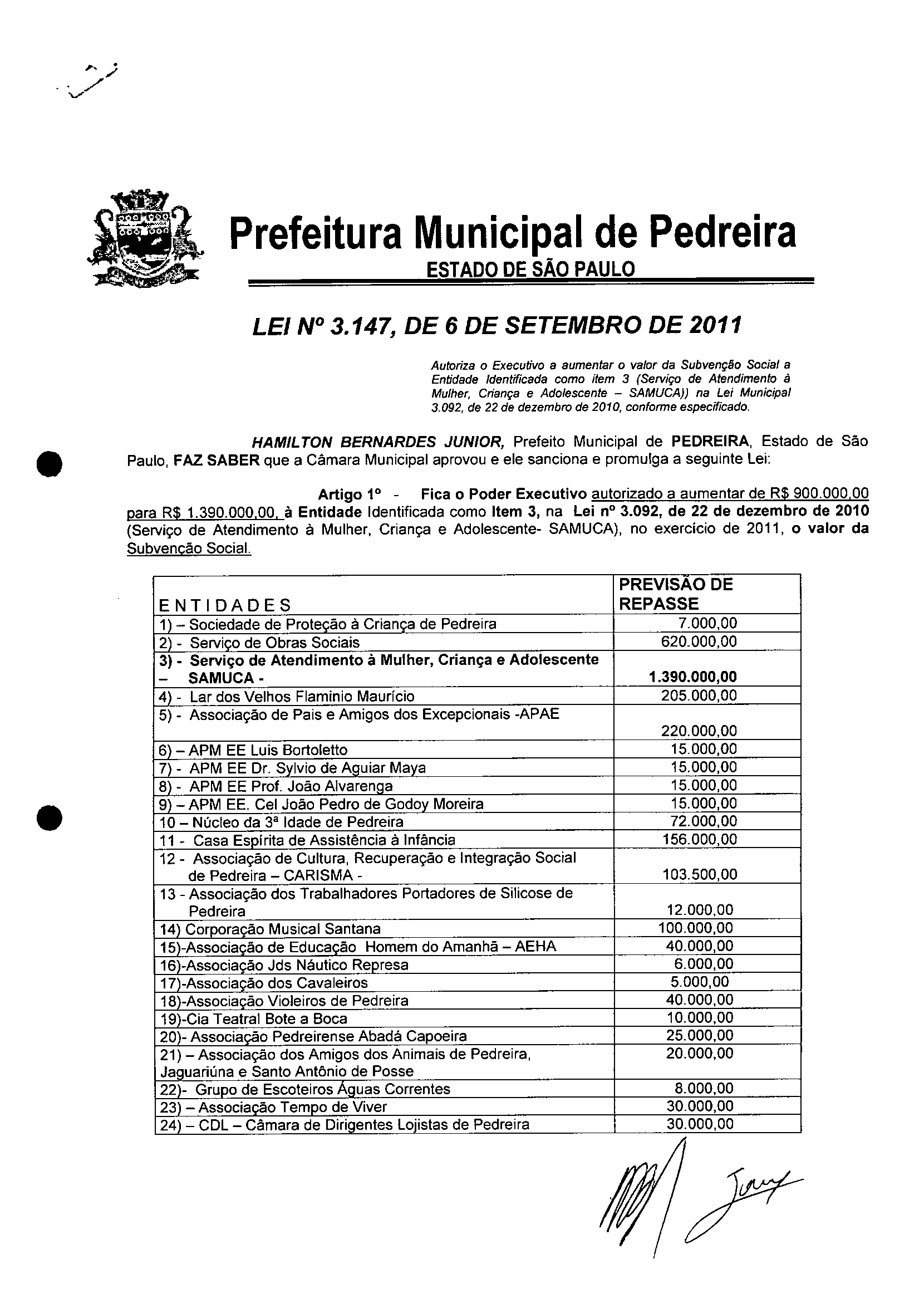 Ementa: Autoriza o Executivo a aumentar o valor da Subvenção Social a Entidade Identificada como item 3 (Serviço de Atendimento à Mulher, Criança e Adolescente -SAMUCA) na Lei Municipal 3.092, de 22 de dezembro de 2010, conforme especificado.