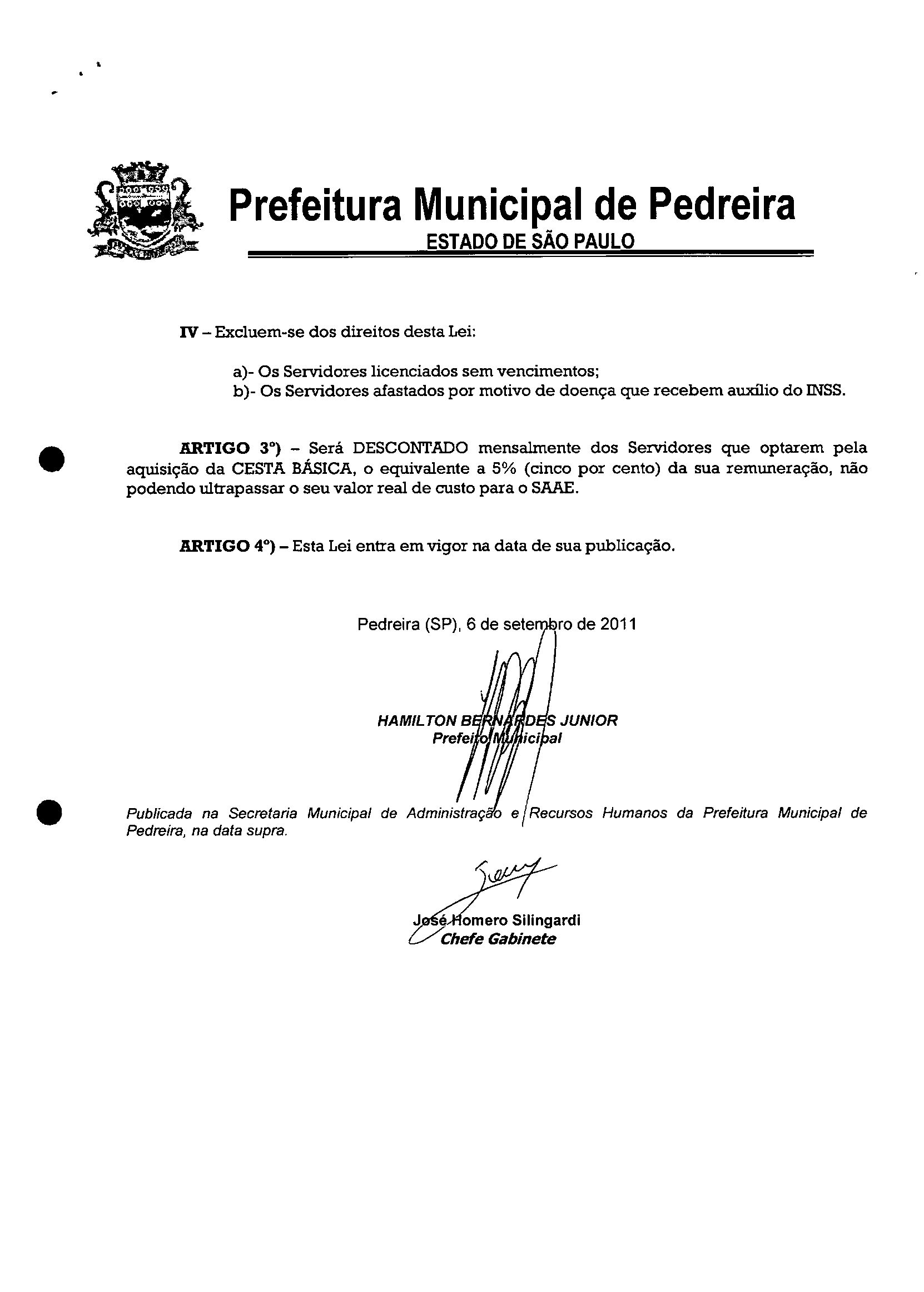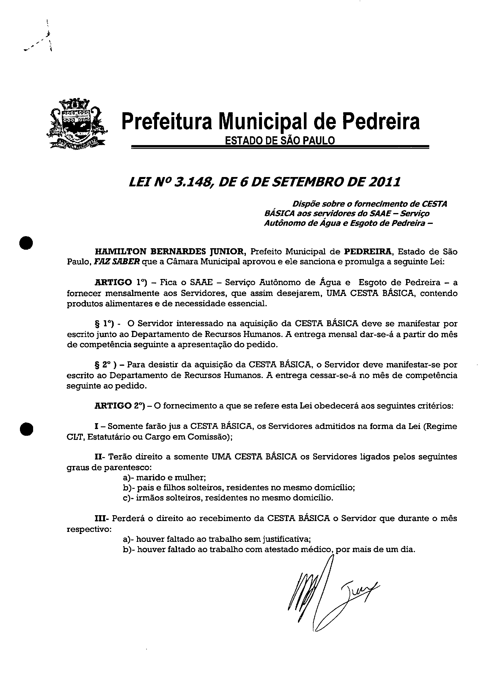 Ementa: Dispõe sobre o fomecimento de CESTA BASICA aos setvidores do SAAE -Serviço , Autônomo de Agua e Esgoto de Pedreira