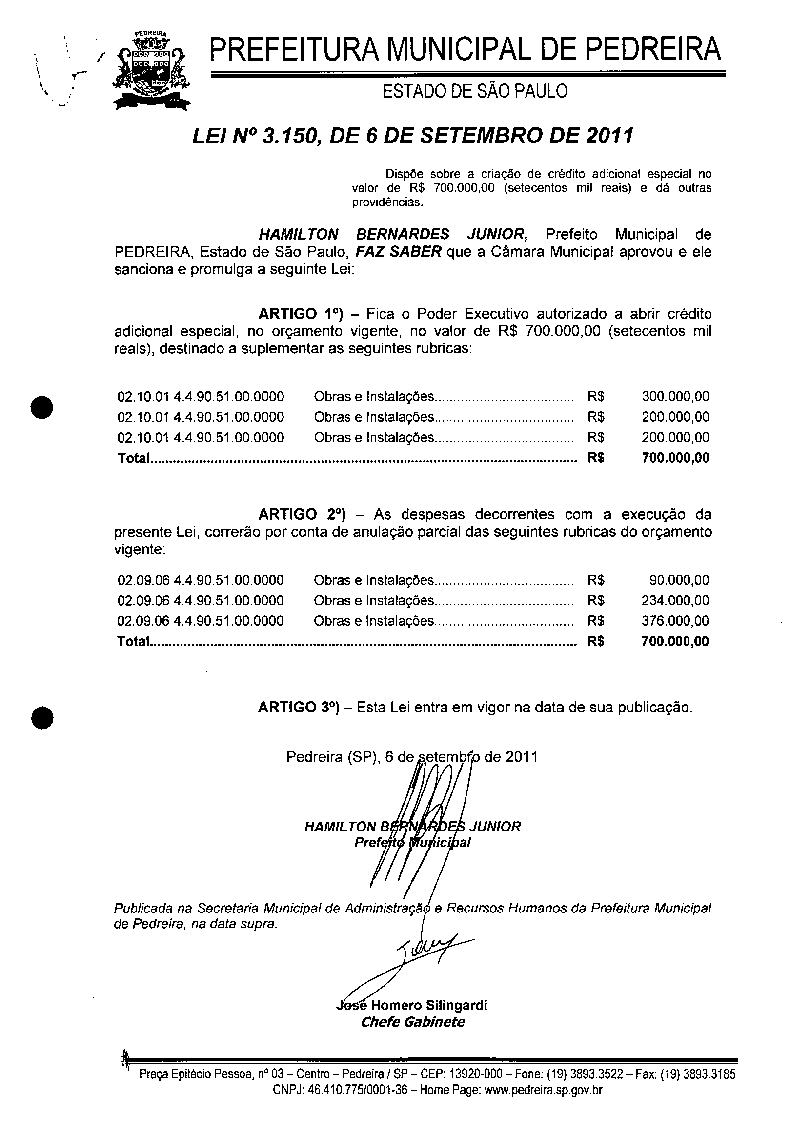 Lei Municipal - N° 3150 de 06/09/2011