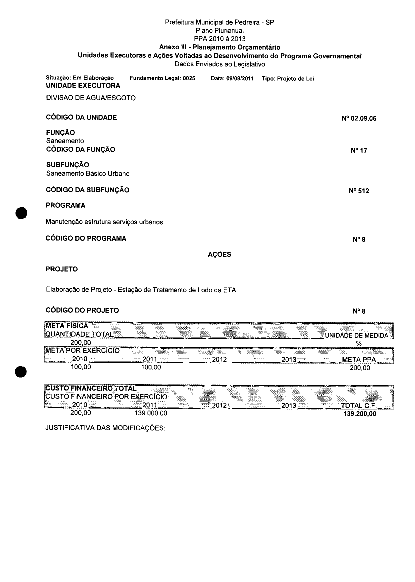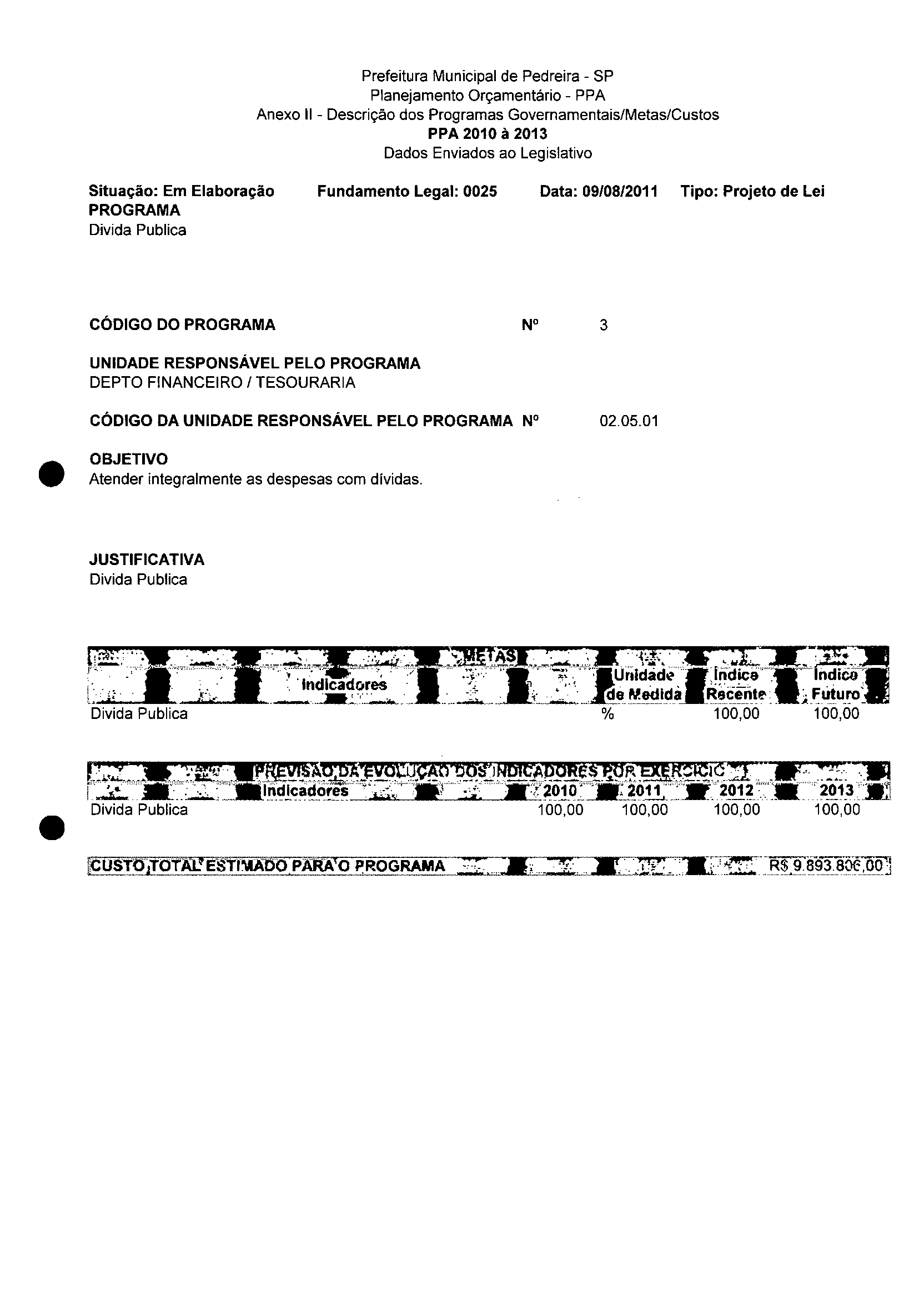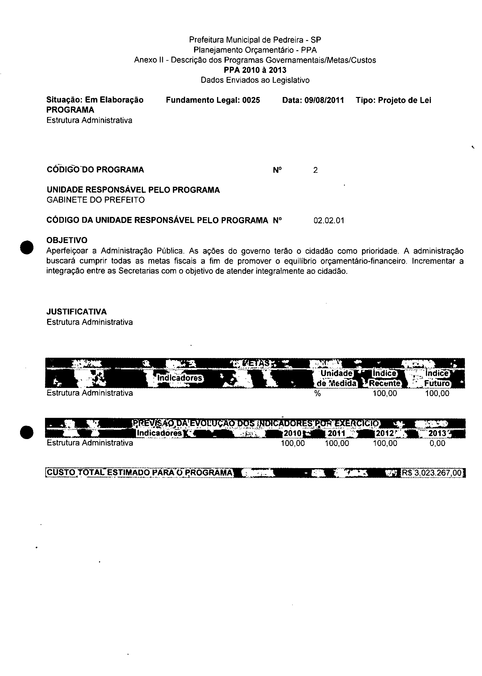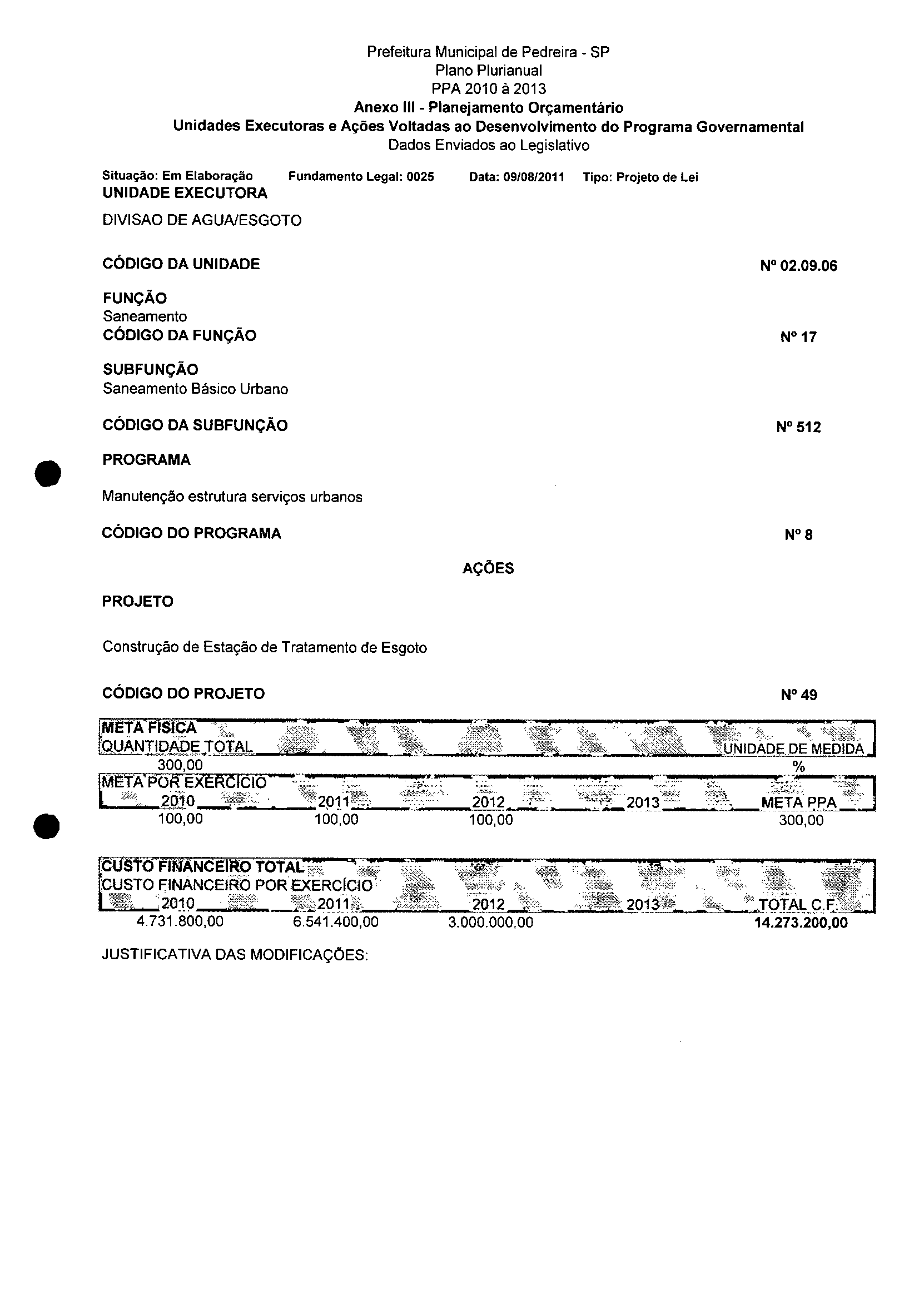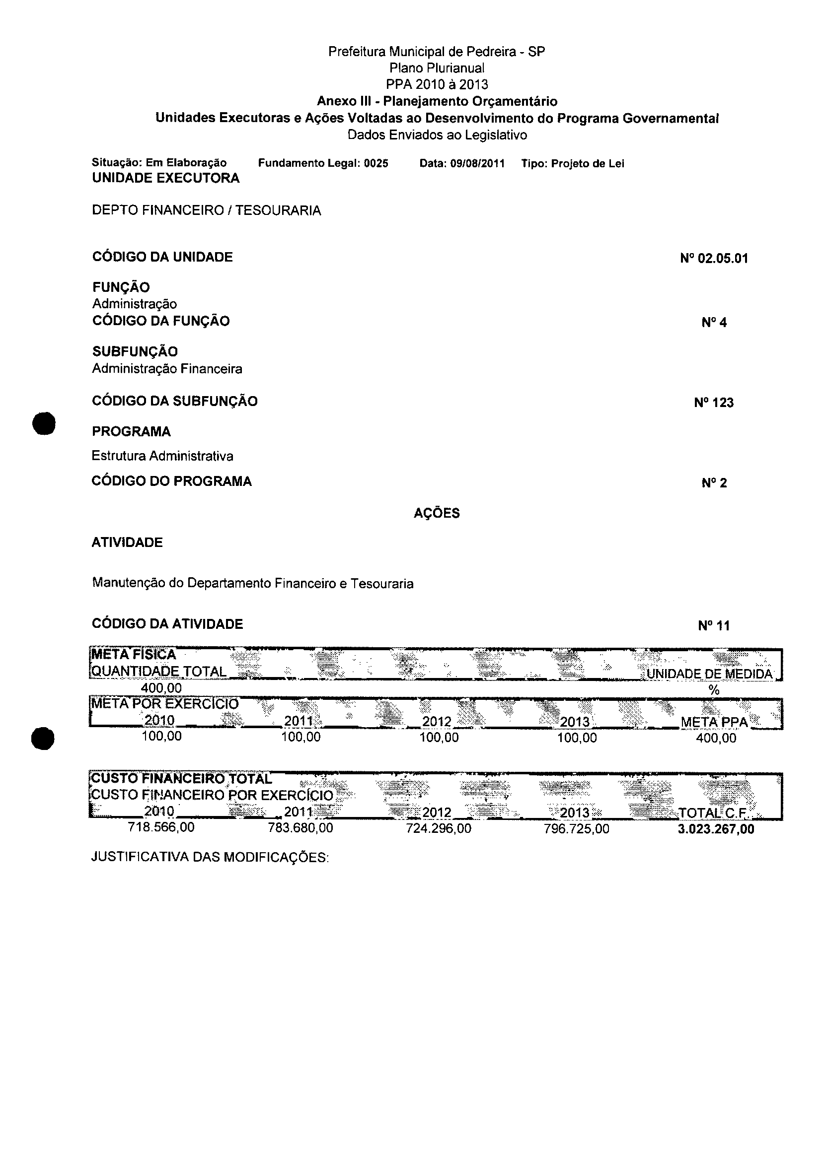 Ementa: Dispõe sobre a alteração dos anexos II e III -da Lei nº 2977, de 5 de novembro de 2009 -Plano Plurianual para o Quadriênio de 2010/2013 e a alteração dos anexos V e VI -da Lei n° 3040, de 10 de junho de 2010 -Lei de Diretrizes Orçamentárias para o exercício de 2011.