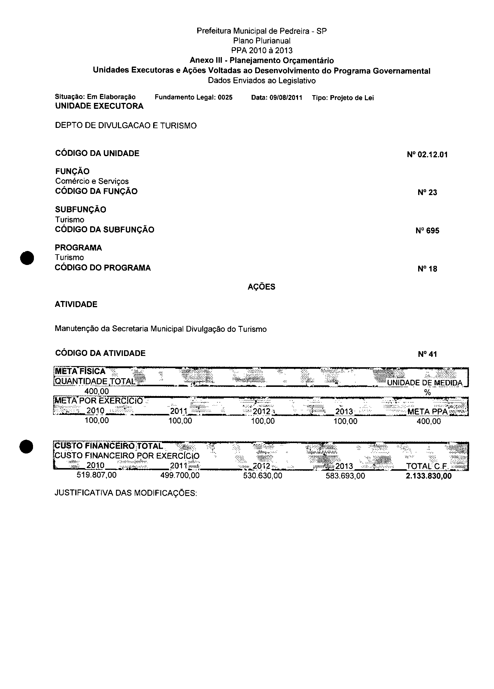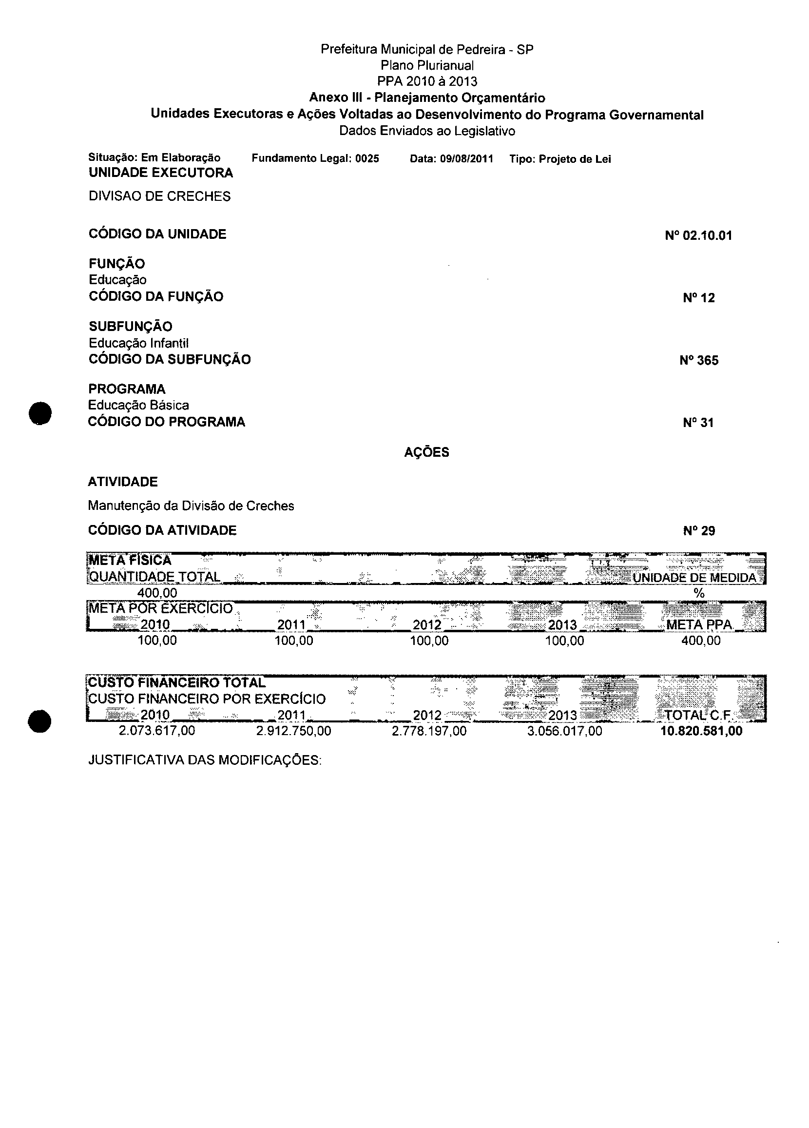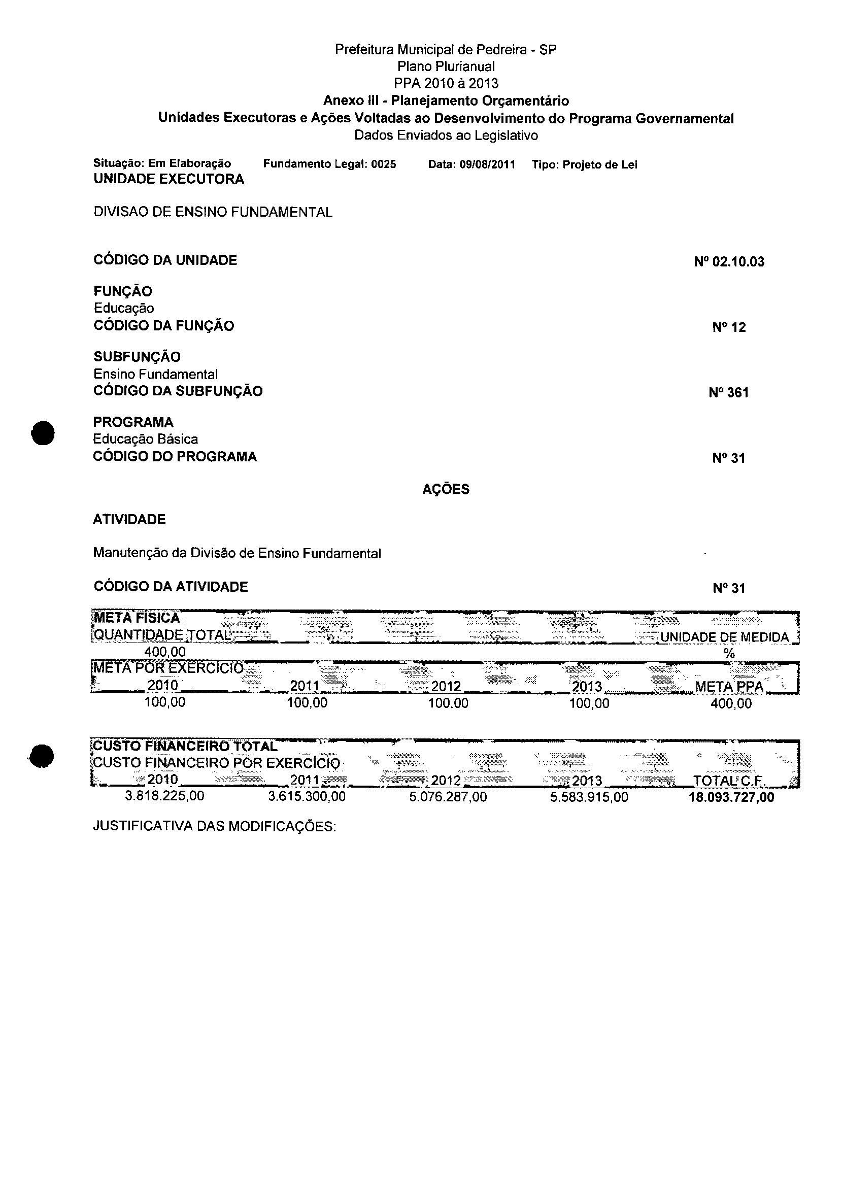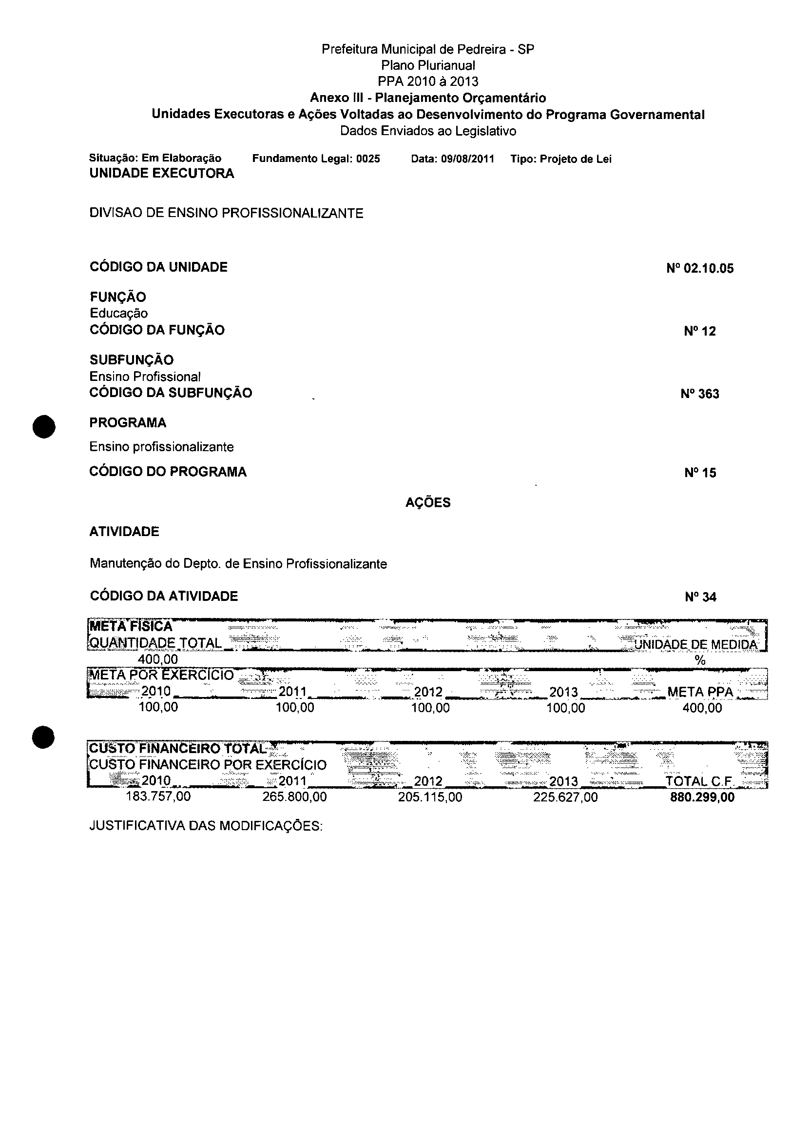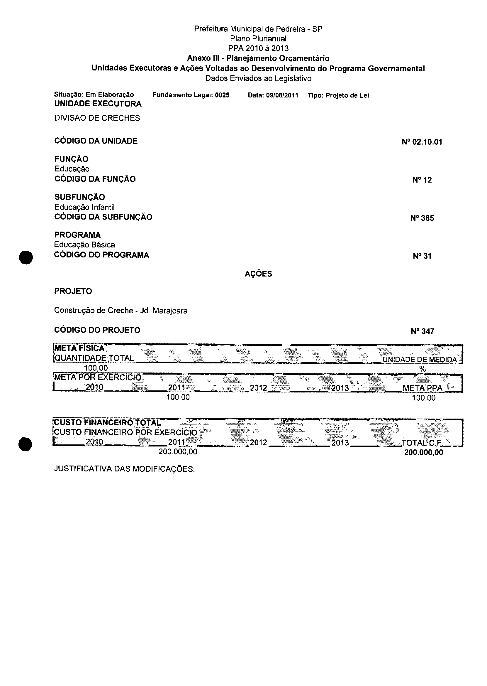 Ementa: Dispõe sobre a alteração dos anexos II e III -da Lei nº 2977, de 5 de novembro de 2009 -Plano Plurianual para o Quadriênio de 2010/2013 e a alteração dos anexos V e VI -da Lei n° 3040, de 10 de junho de 2010 -Lei de Diretrizes Orçamentárias para o exercício de 2011.