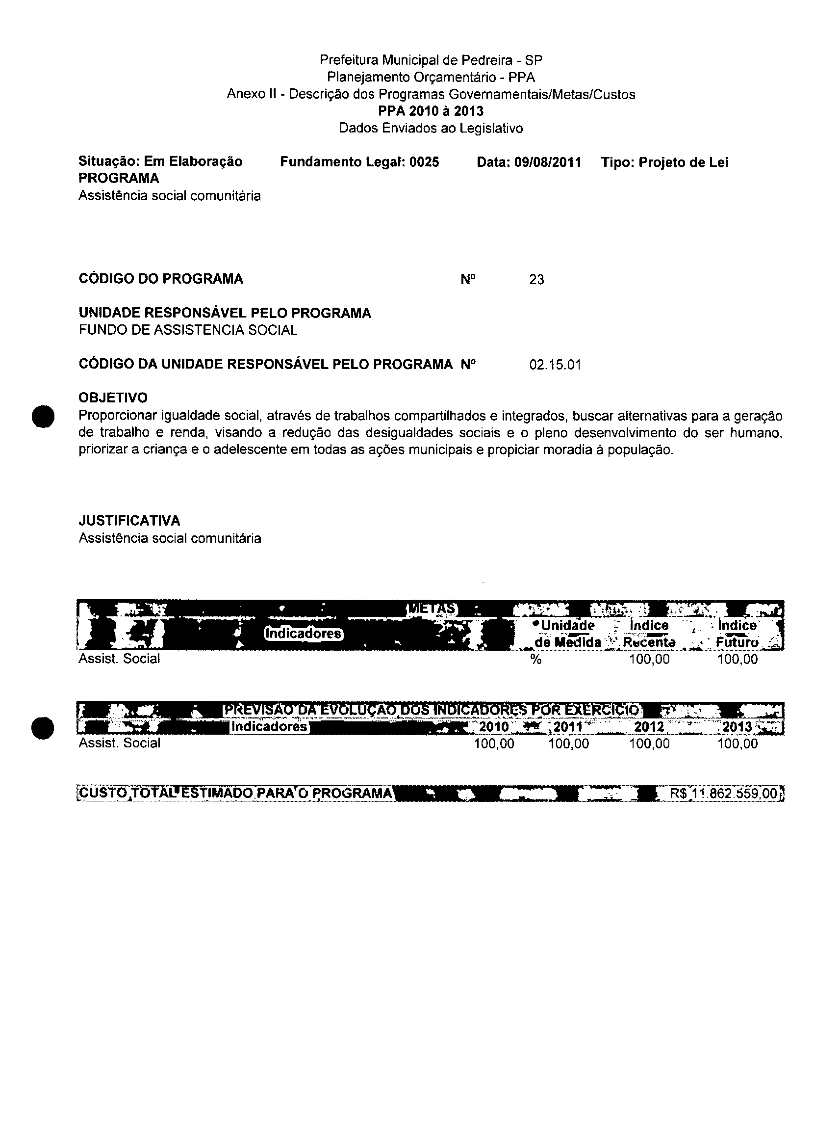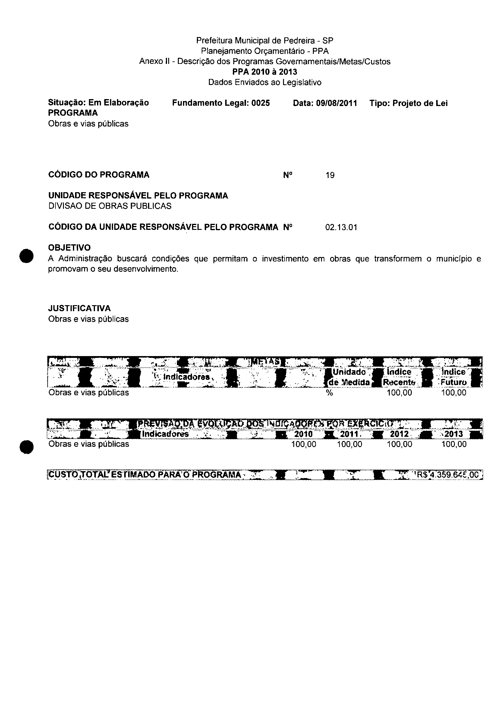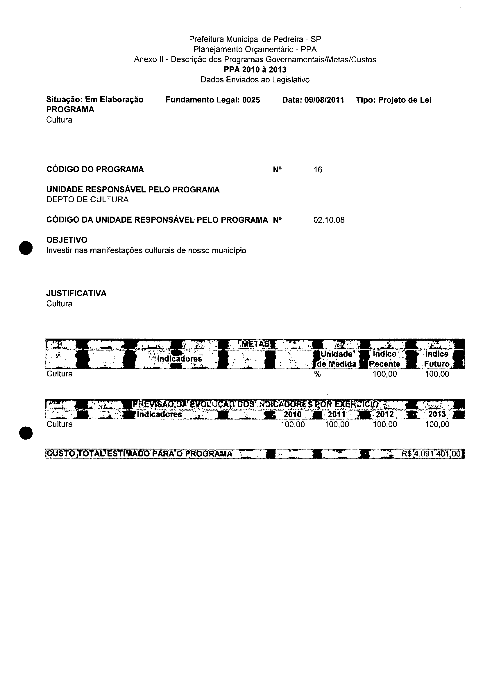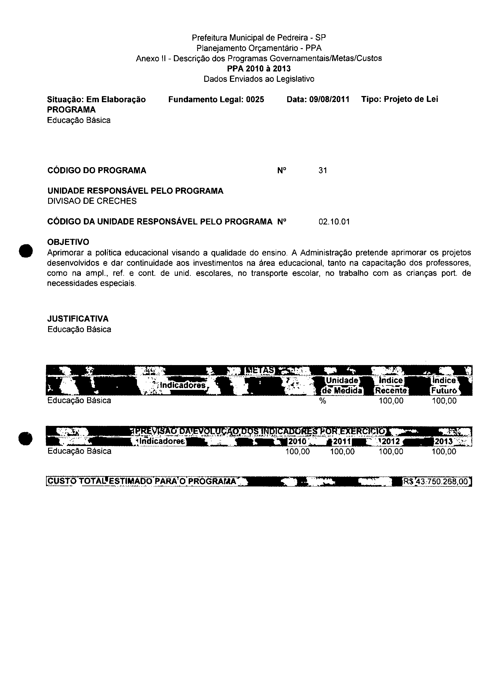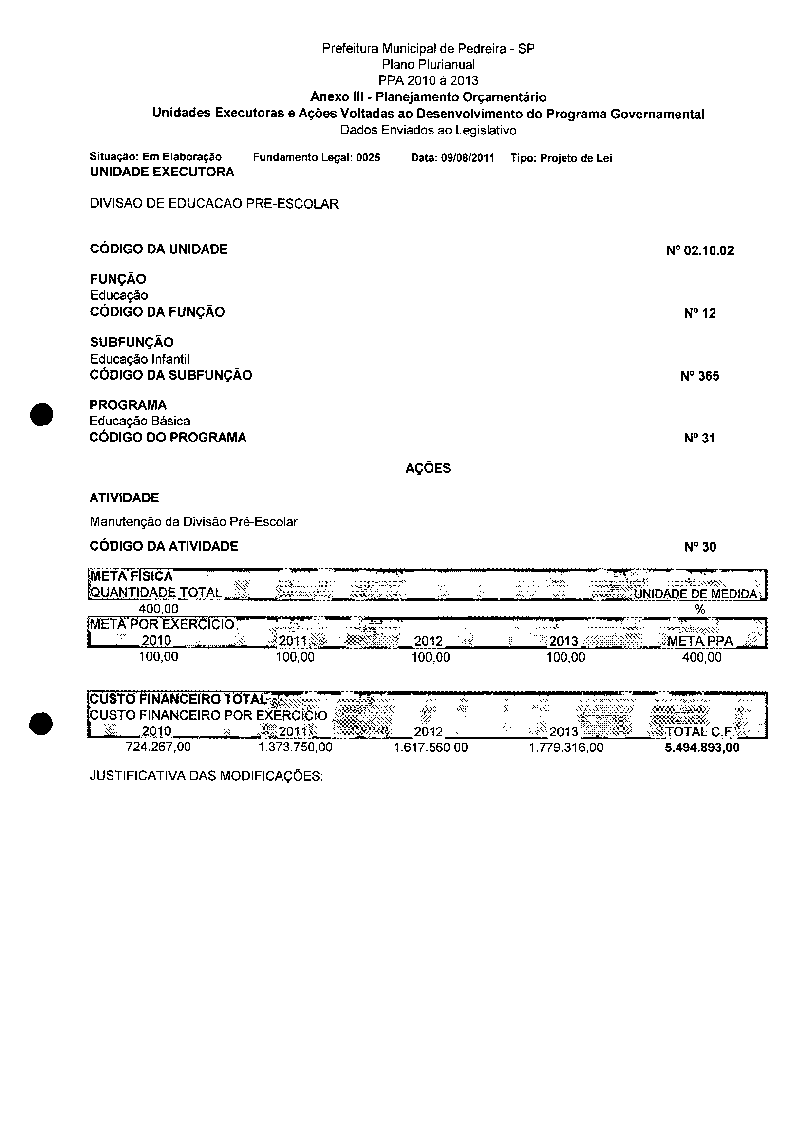 Ementa: Dispõe sobre a alteração dos anexos II e III -da Lei nº 2977, de 5 de novembro de 2009 -Plano Plurianual para o Quadriênio de 2010/2013 e a alteração dos anexos V e VI -da Lei n° 3040, de 10 de junho de 2010 -Lei de Diretrizes Orçamentárias para o exercício de 2011.