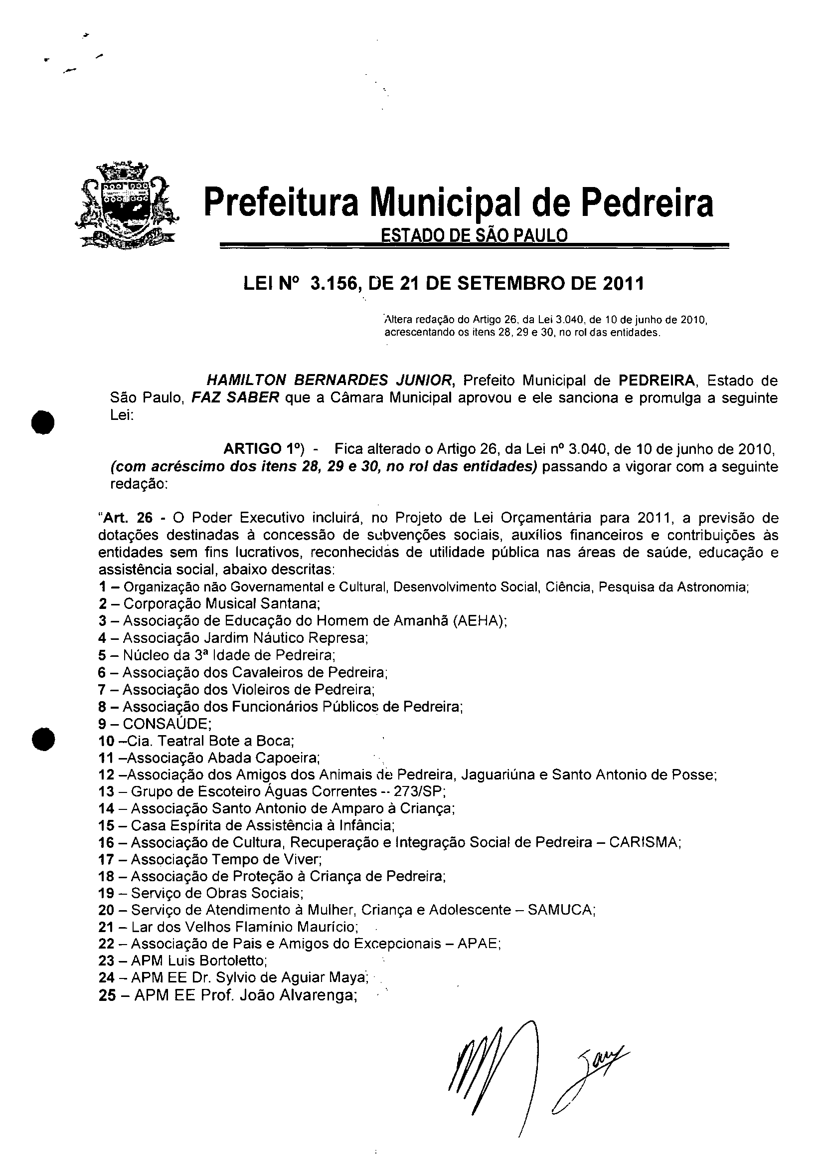 Ementa: Altera redação do Artigo 26, da Lei 3.040, de 10 de junho de 2010, acrescentando os itens 28, 29 e 30, no rol das entidades.