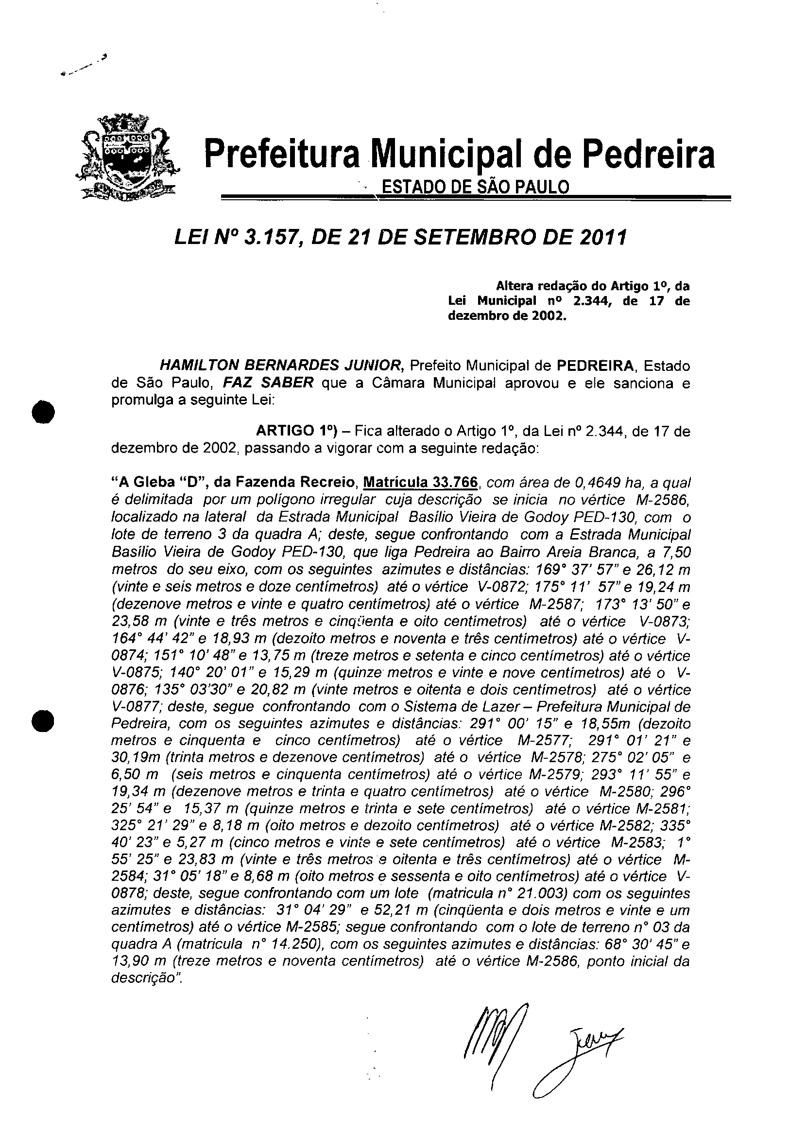 Ementa: Altera redação do Artigo 1°, da lei Municipal nº 2.344, de 17 de dezembro de 2002.