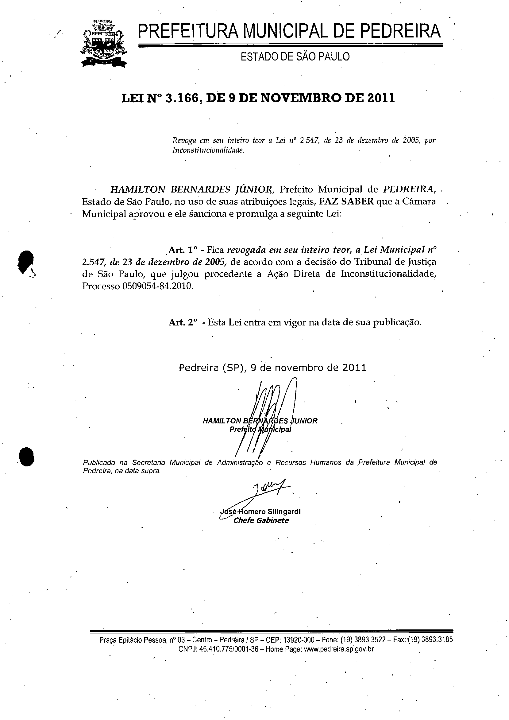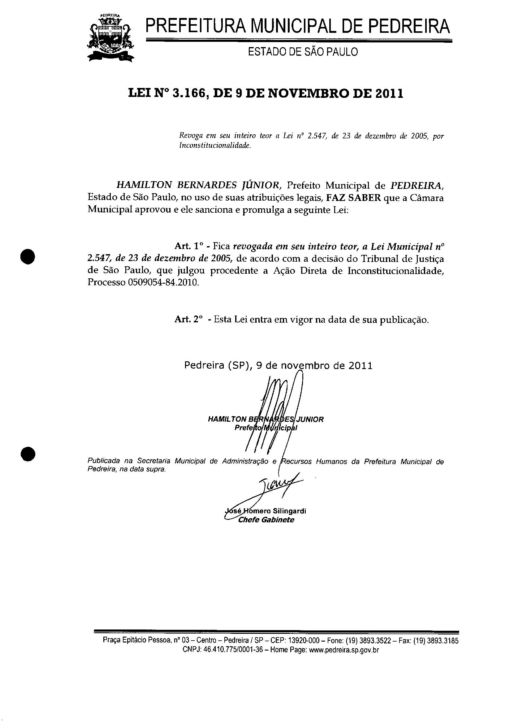 Lei Municipal - N° 3166 de 09/11/2011