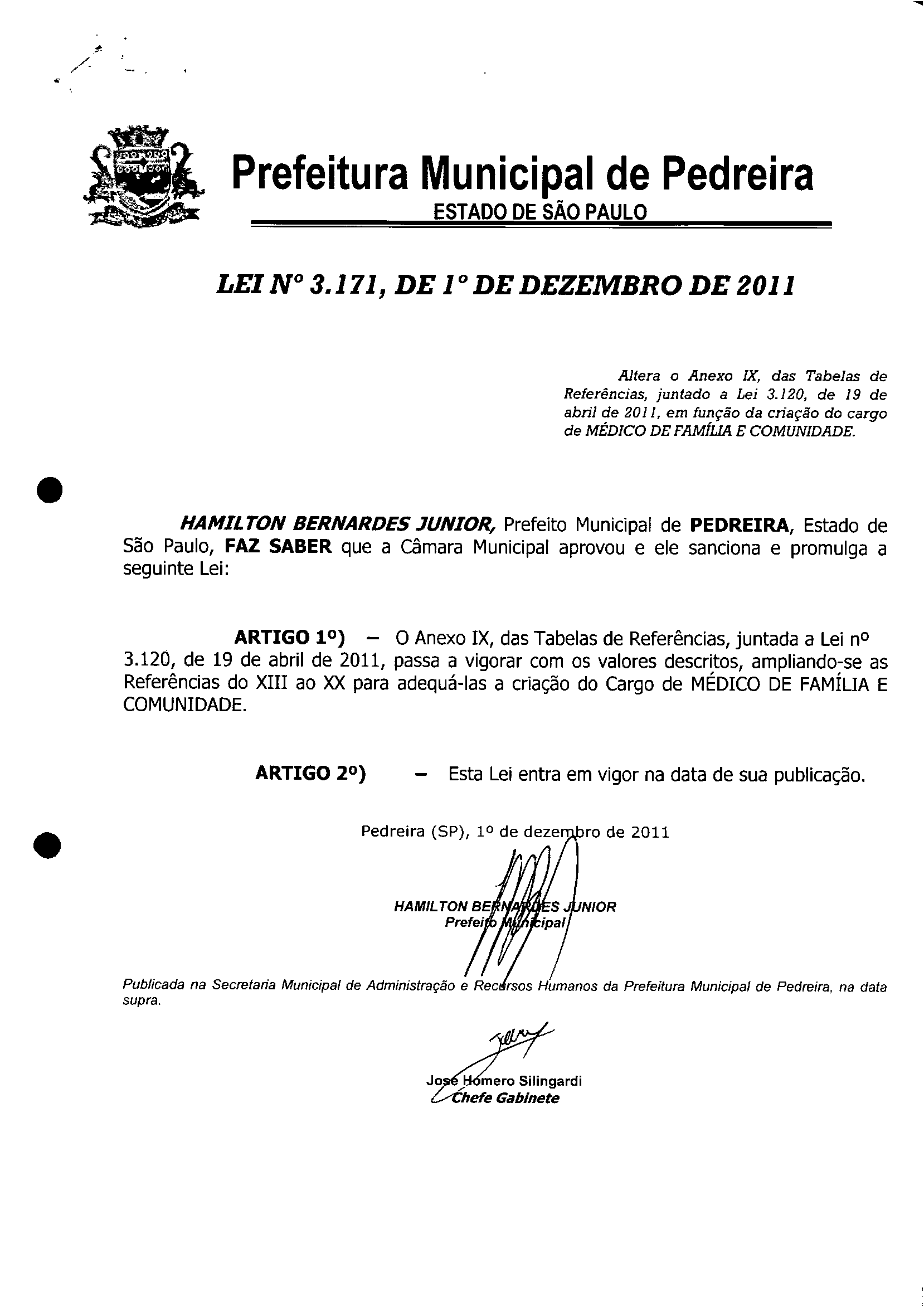 Lei Municipal - N° 3171 de 01/12/2011