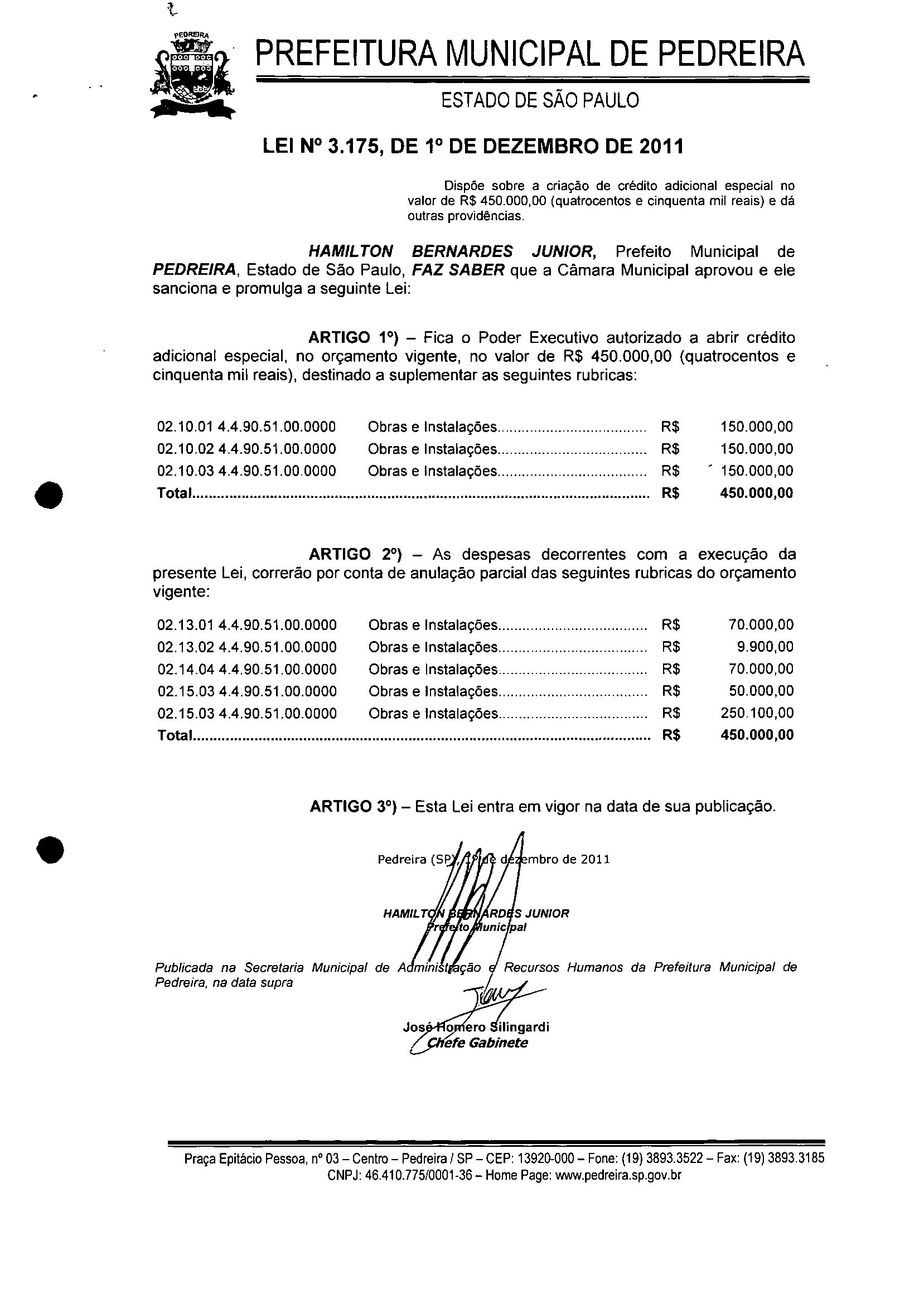 Ementa: Dispõe sobre a criação de crédito adicional especial no valor de R$ 450.000,00 (quatrocentos e cinquenta mil reais) e dá outras providências.