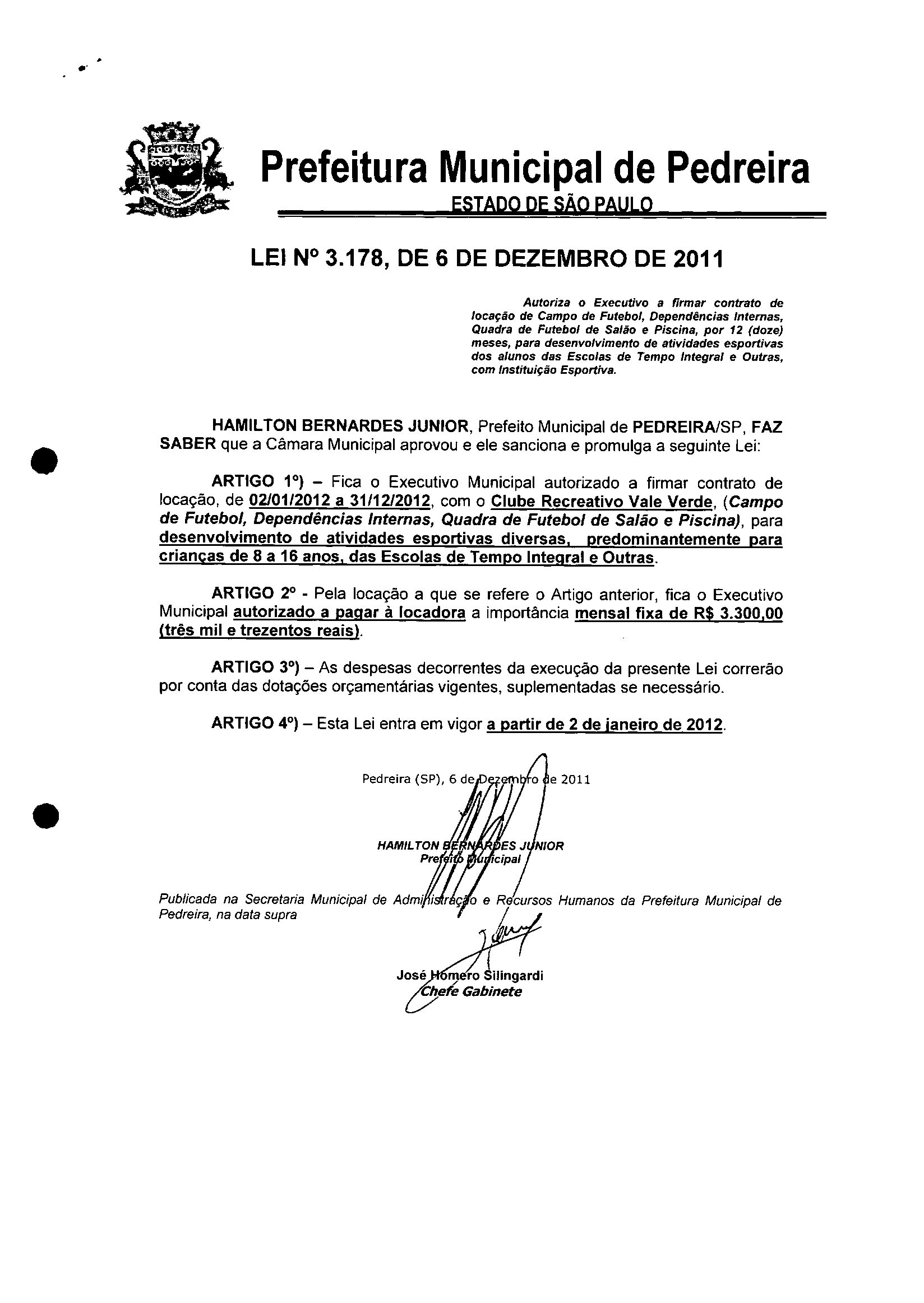 Ementa: Autoriza o Executivo a firmar contrato de locação de Campo de Futebol, Dependências Internas, Quadra de Futebol de Salão e Piscina, por 12 (doze) meses, para desenvolvimento de atividades esportivas dos alunos das Escolas de Tempo Integral e Outras. com Instituição Esportiva.