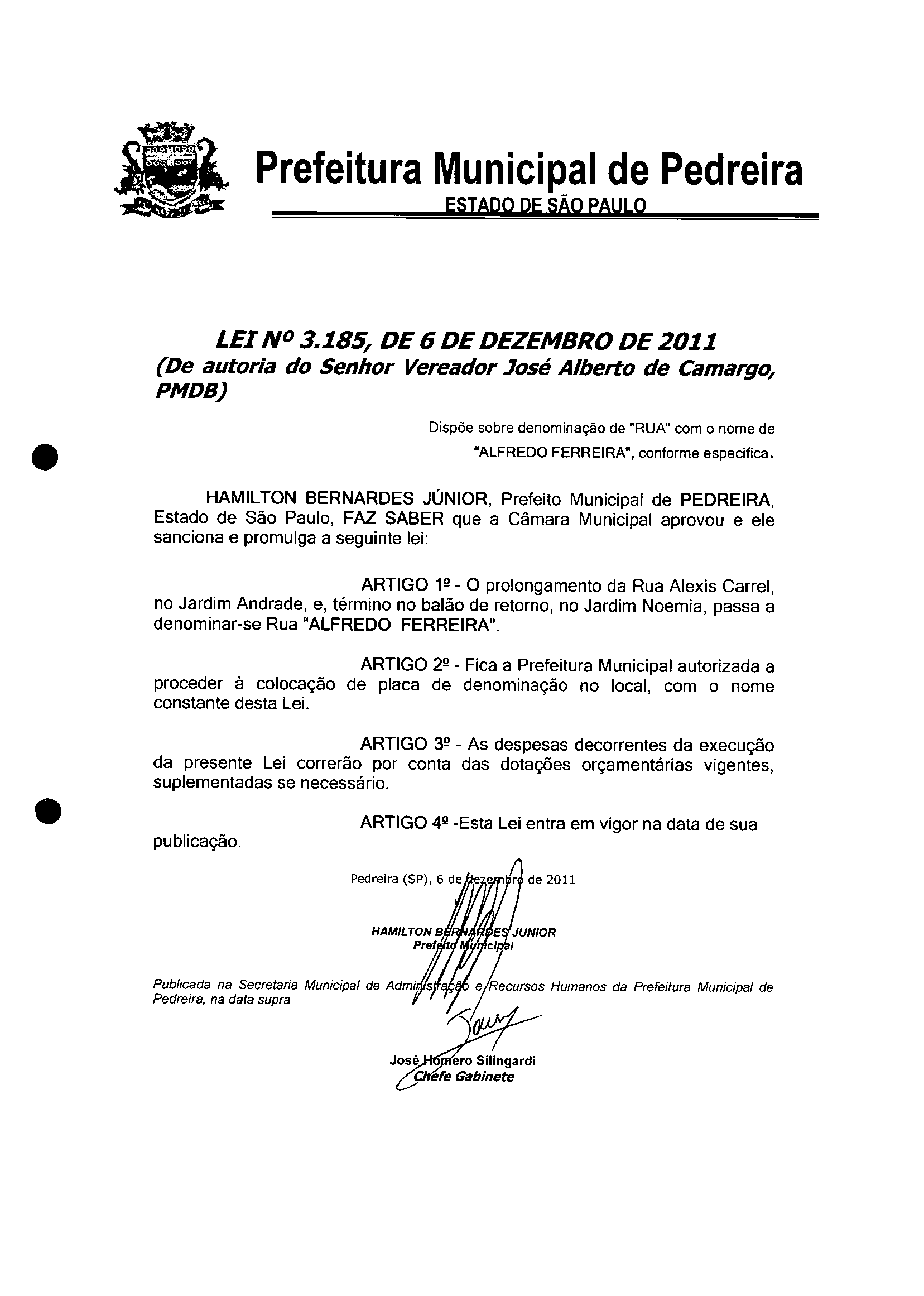 Lei Municipal - N° 3185 de 06/12/2011
