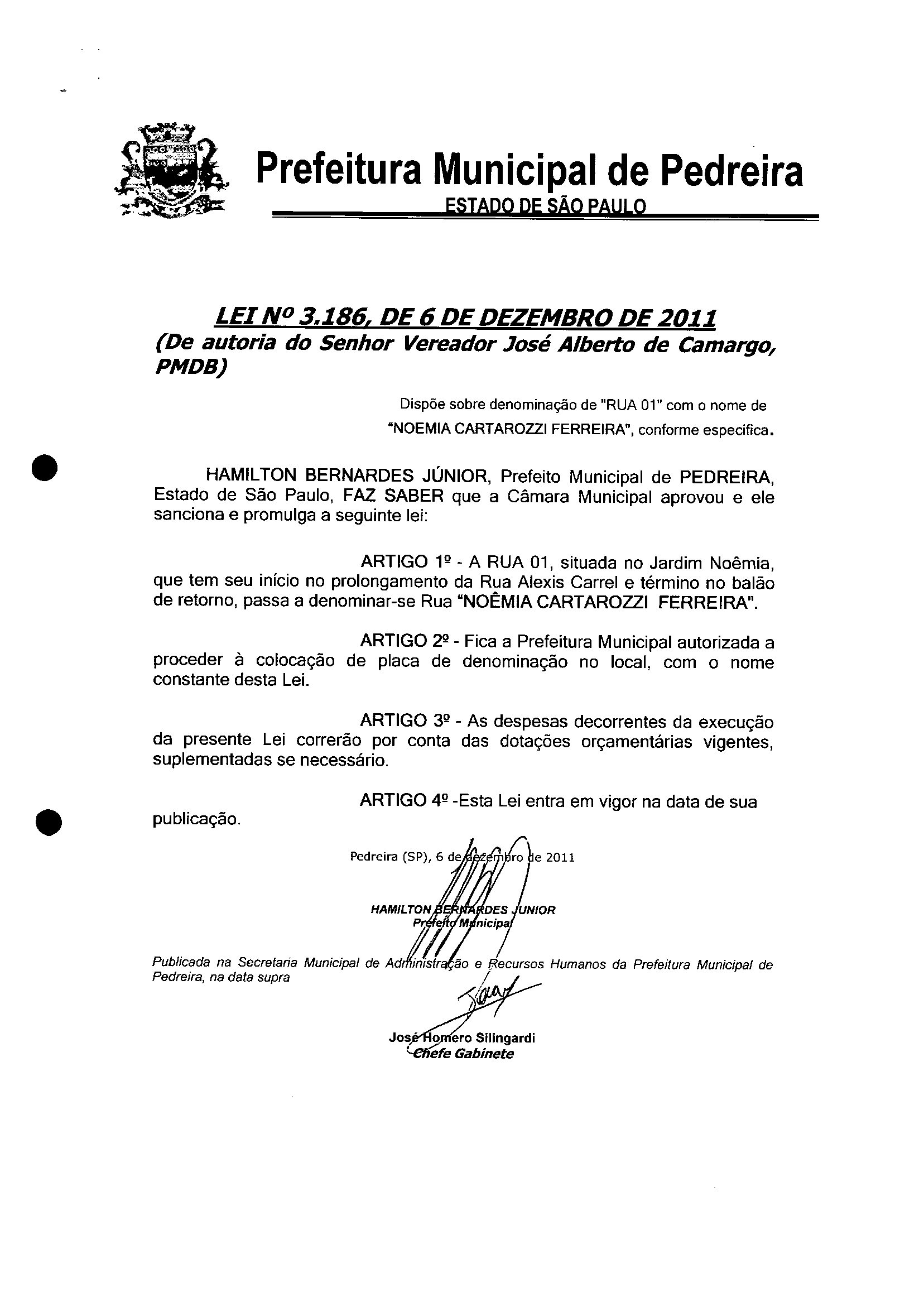 Lei Municipal - N° 3186 de 06/12/2011