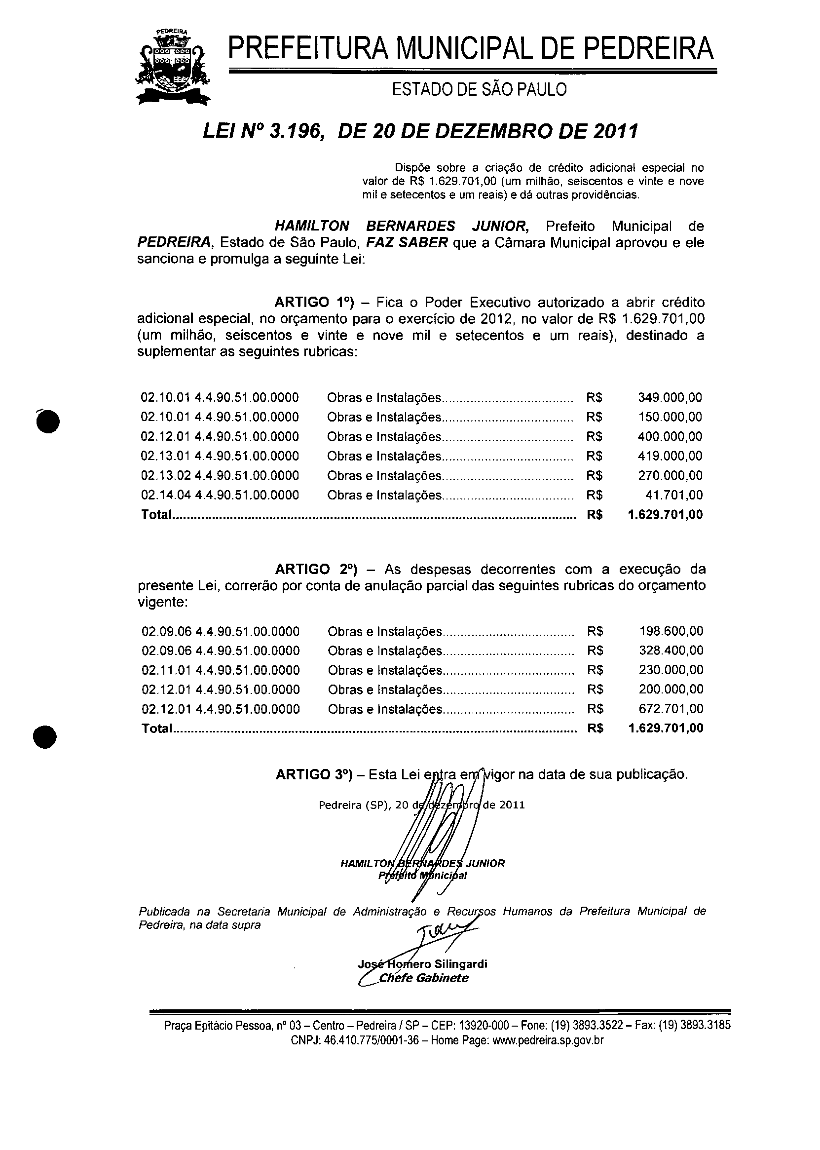 Lei Municipal - N° 3196 de 20/12/2011