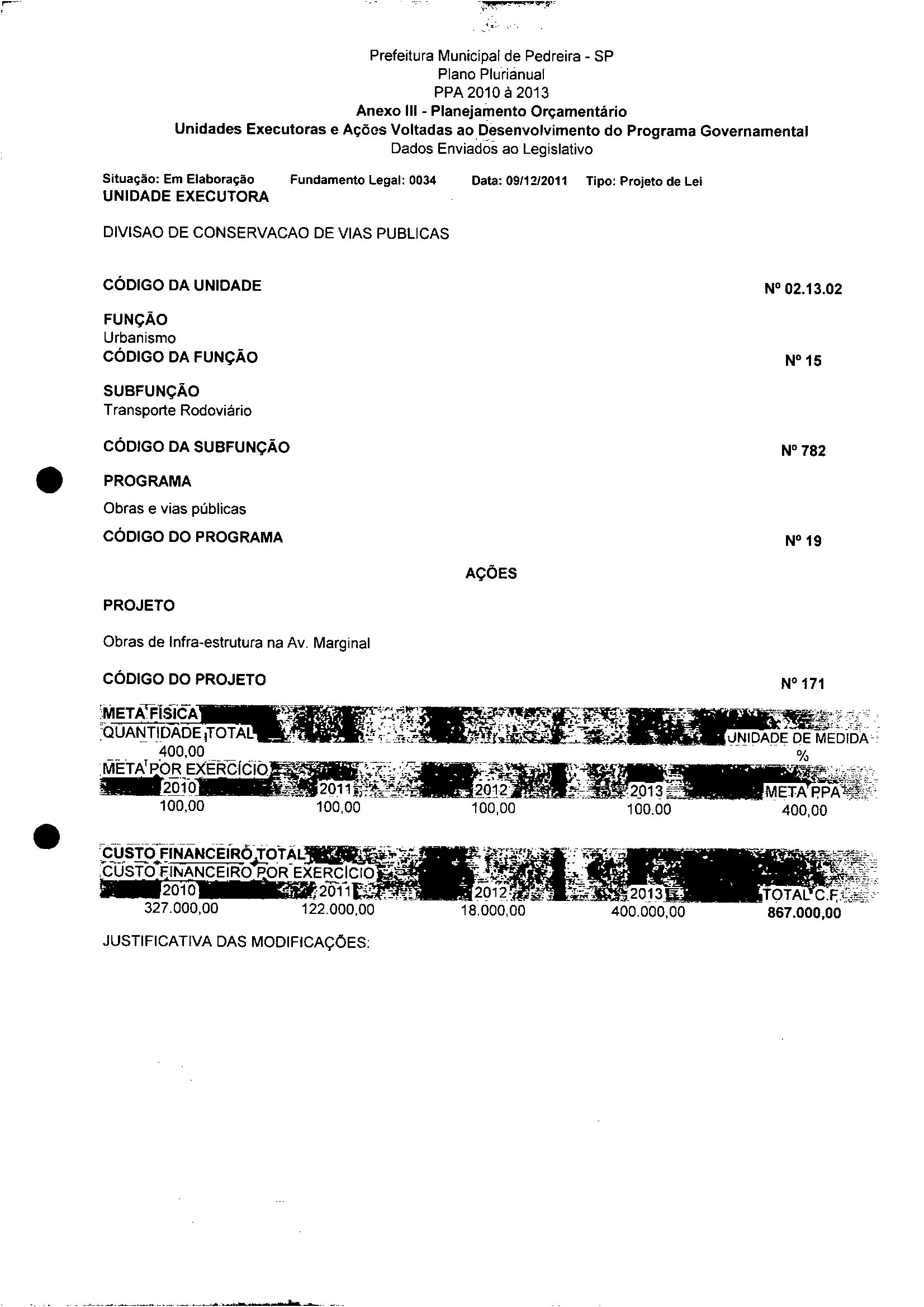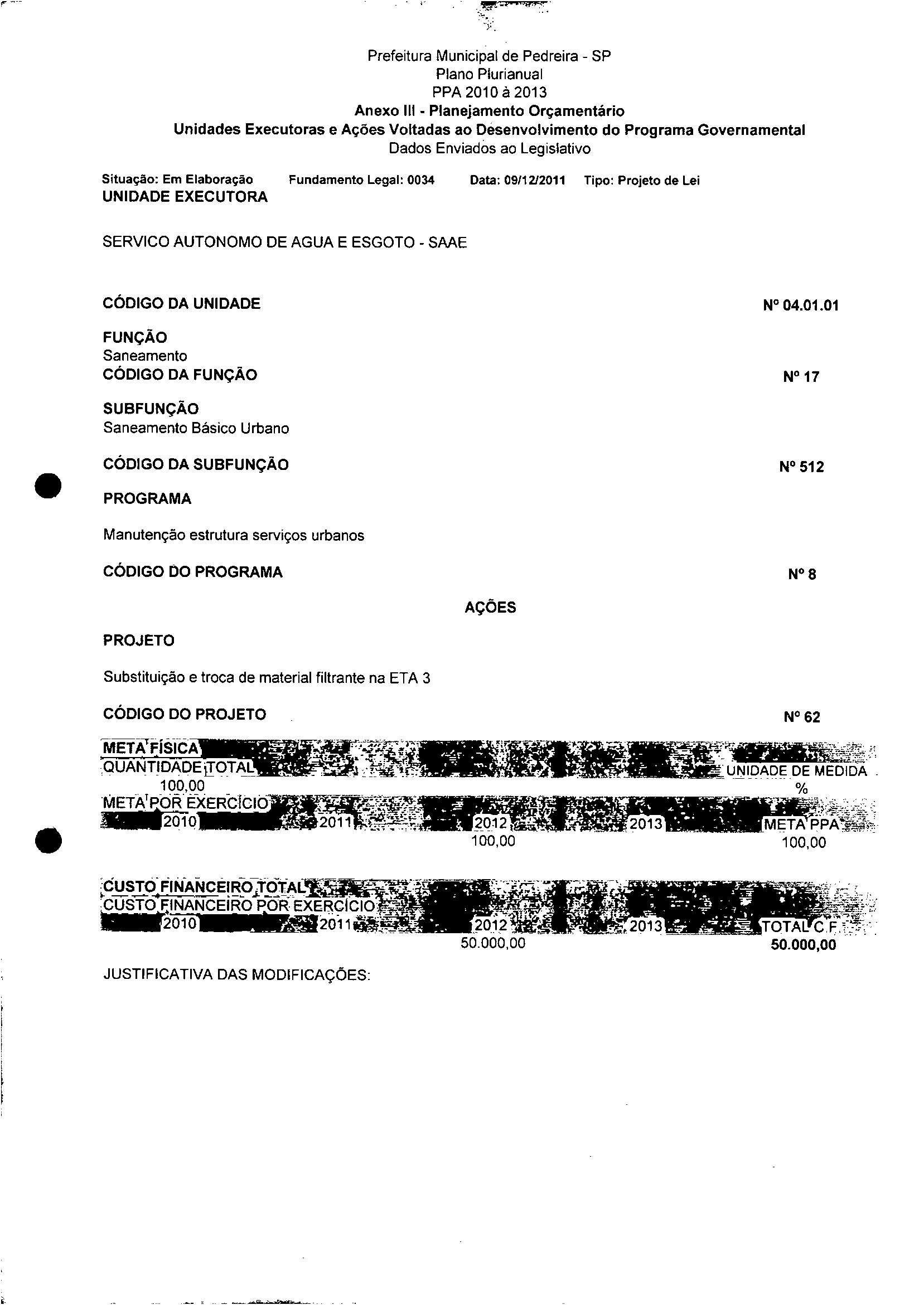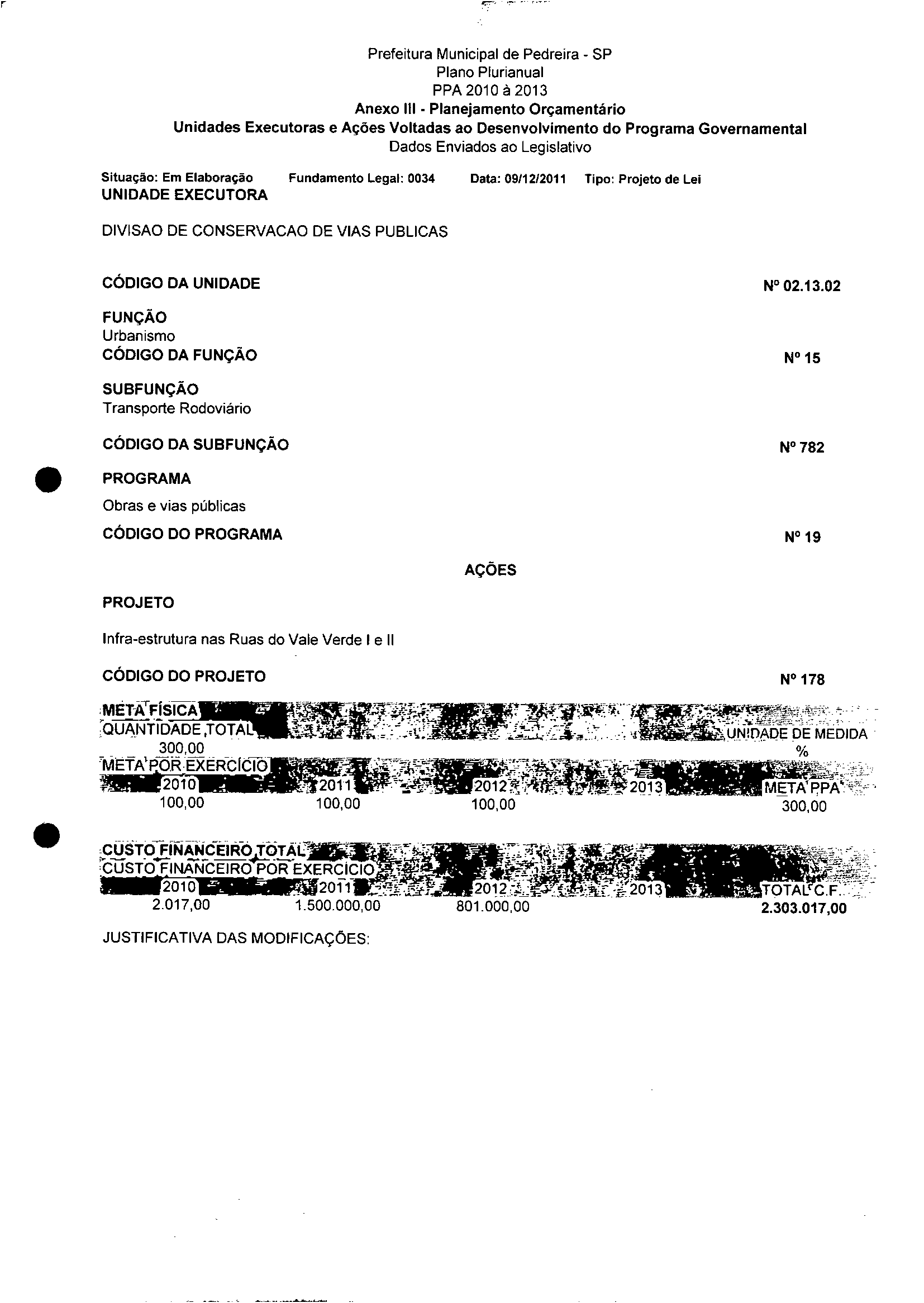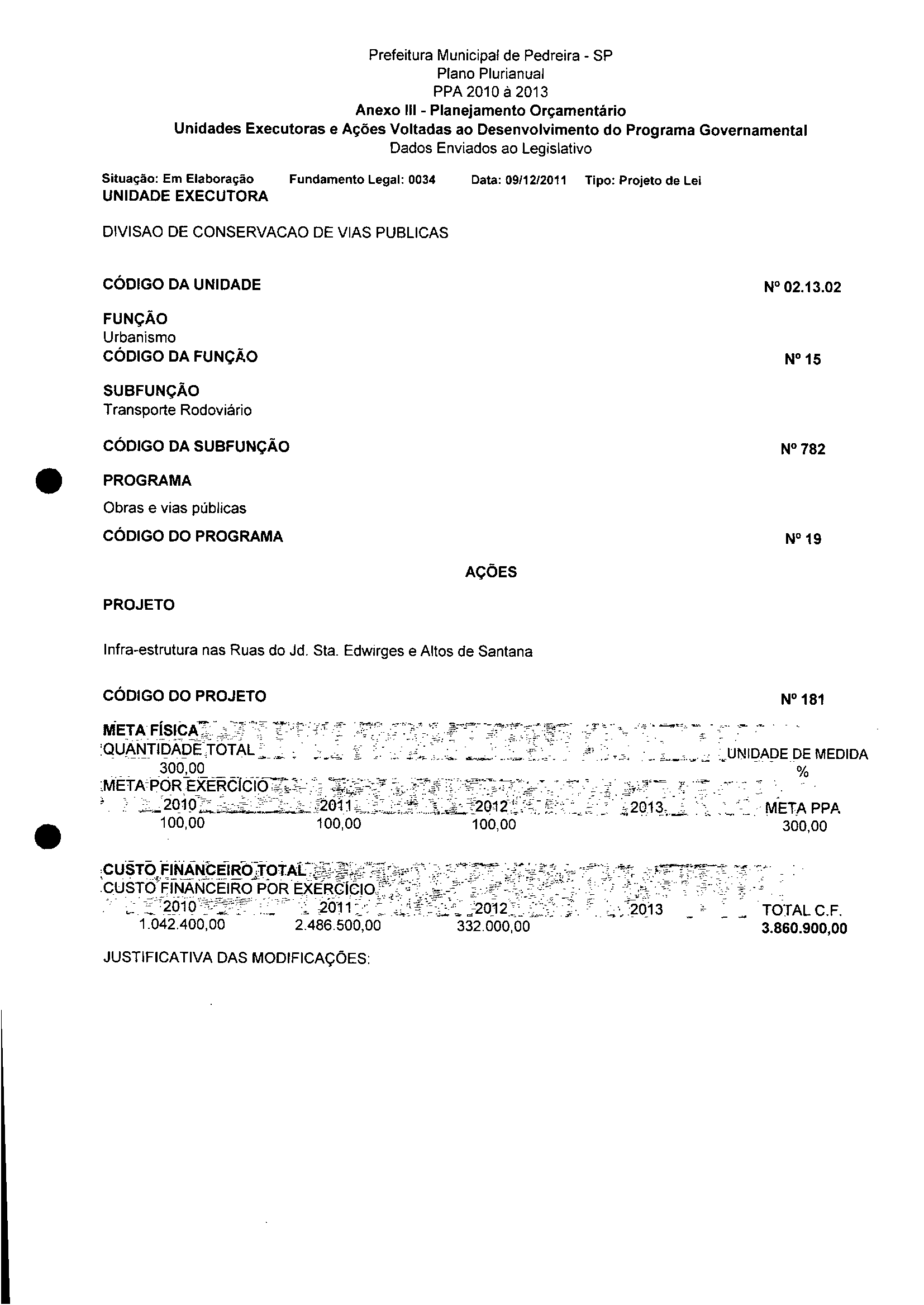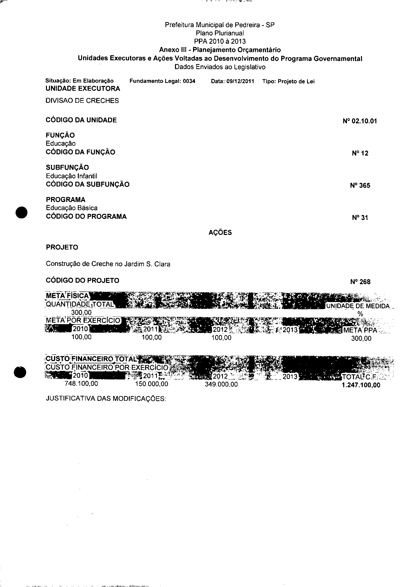 Ementa: Dispõe sobre a alteração dos anexos II e III -da Lei nº 2.977, de 5 de novembro de 2009 -Plano Plurianual para o Quadriênio de 2010/2013 e a alteração dos anexos Ve VI-da Lei nº 3.138, de 27 de junho de 2011 -Lei de Diretrizes Orçamentárias para o exercicio de 2012.