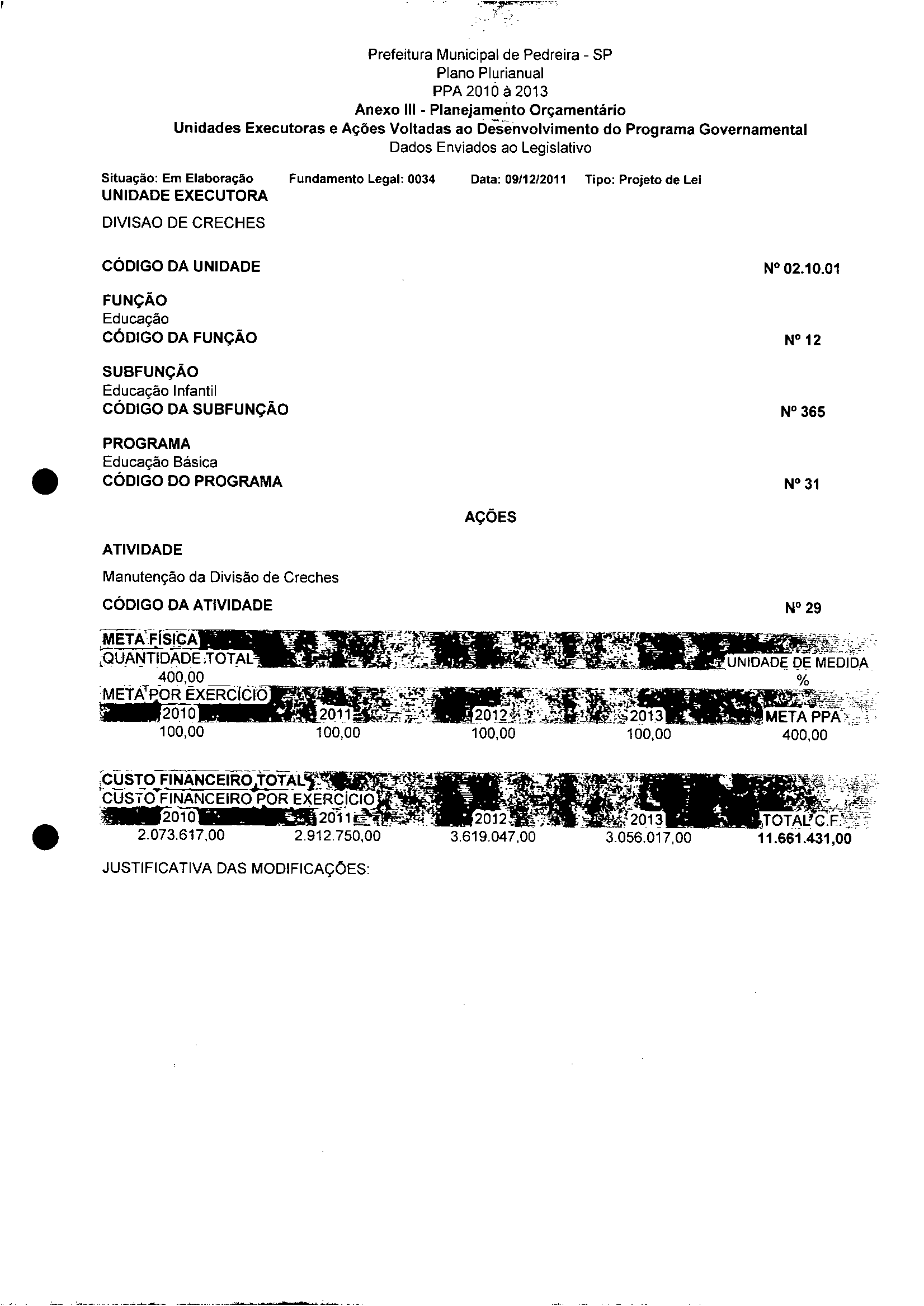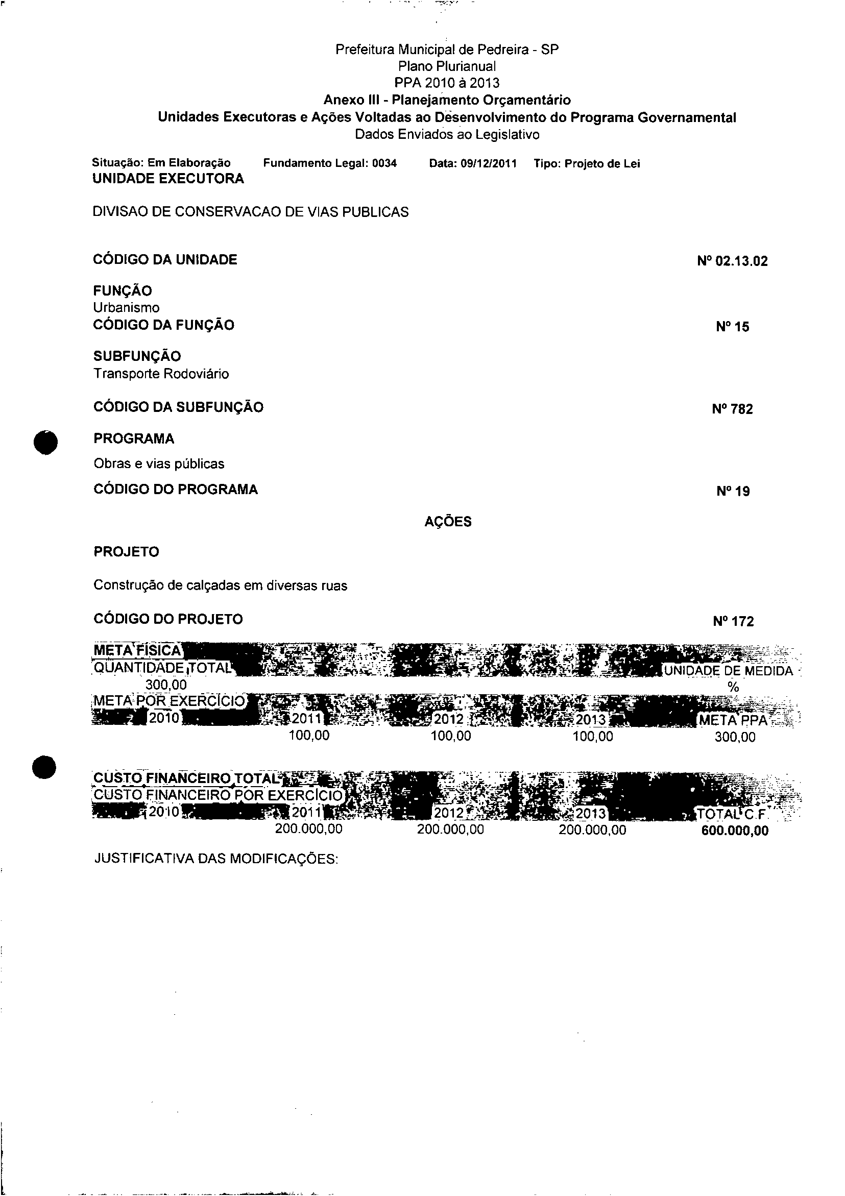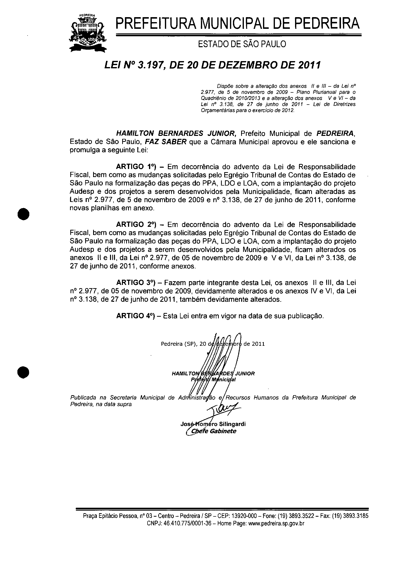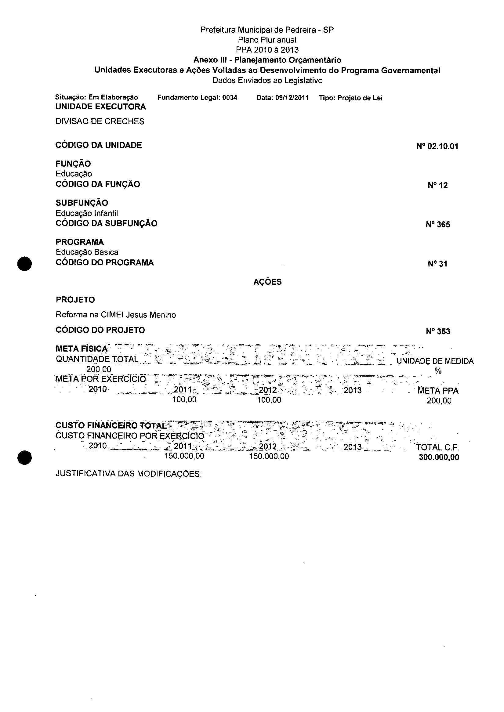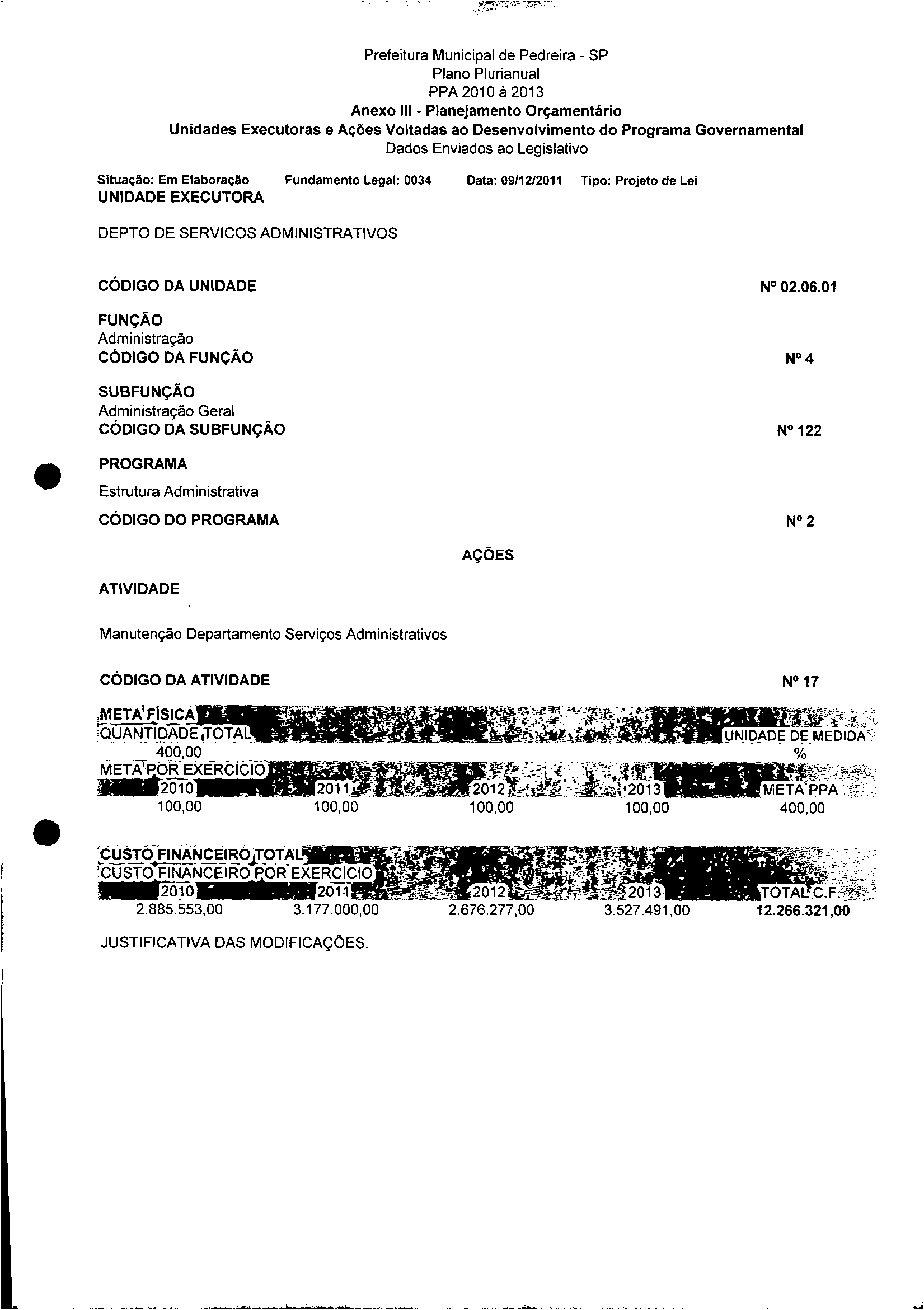 Ementa: Dispõe sobre a alteração dos anexos II e III -da Lei nº 2.977, de 5 de novembro de 2009 -Plano Plurianual para o Quadriênio de 2010/2013 e a alteração dos anexos Ve VI-da Lei nº 3.138, de 27 de junho de 2011 -Lei de Diretrizes Orçamentárias para o exercicio de 2012.