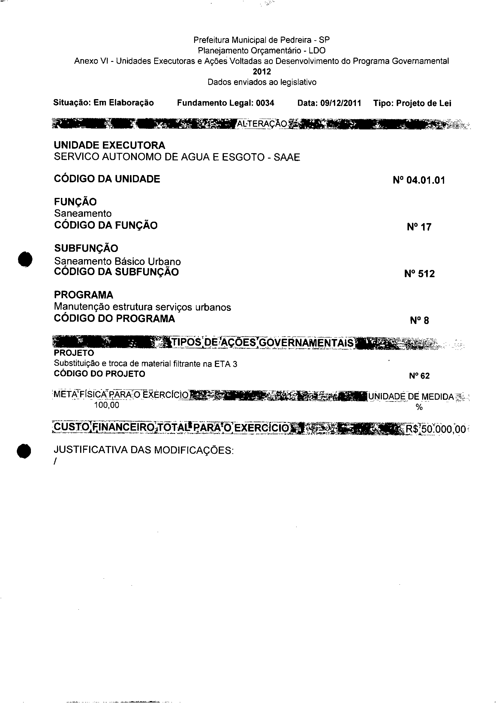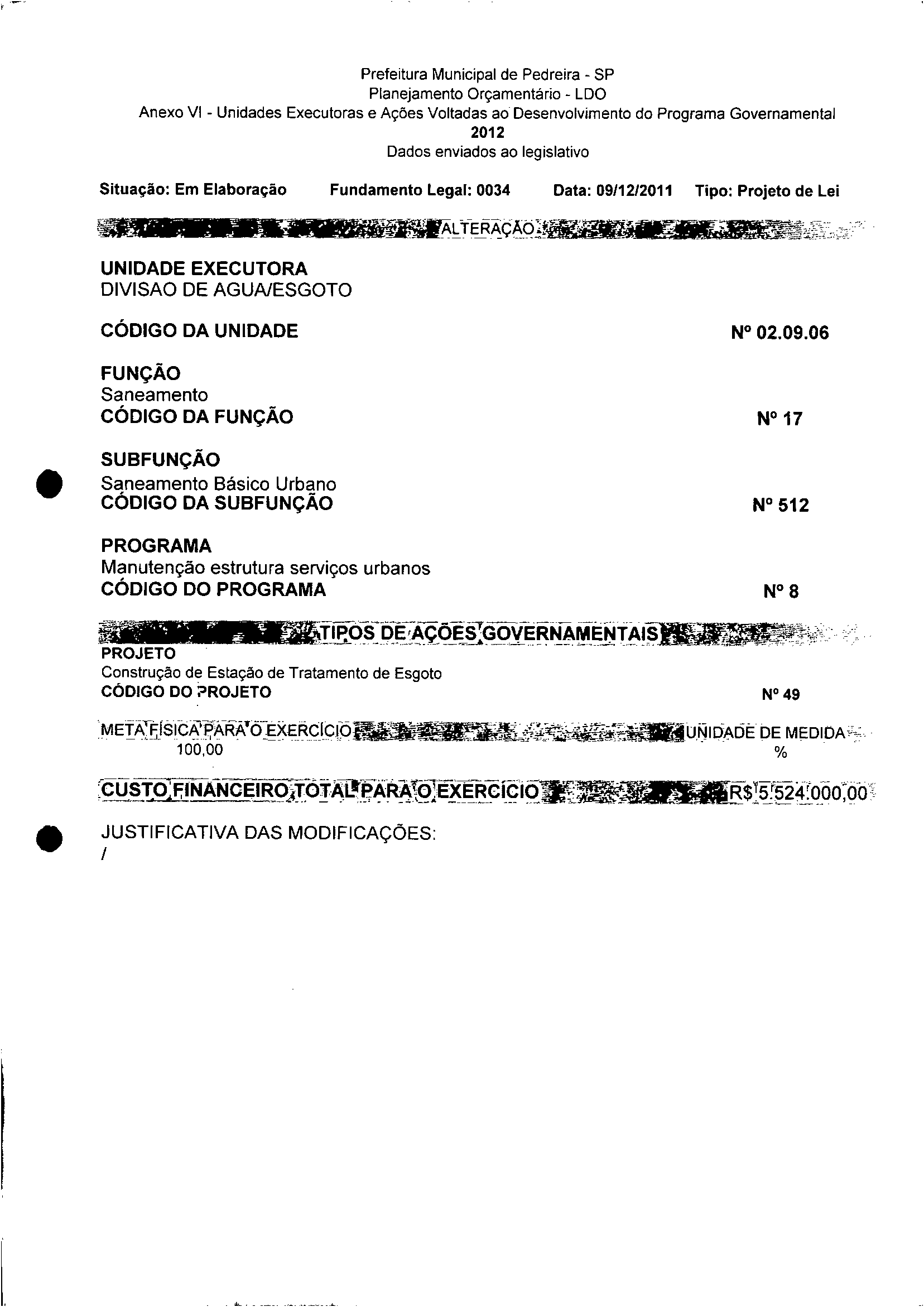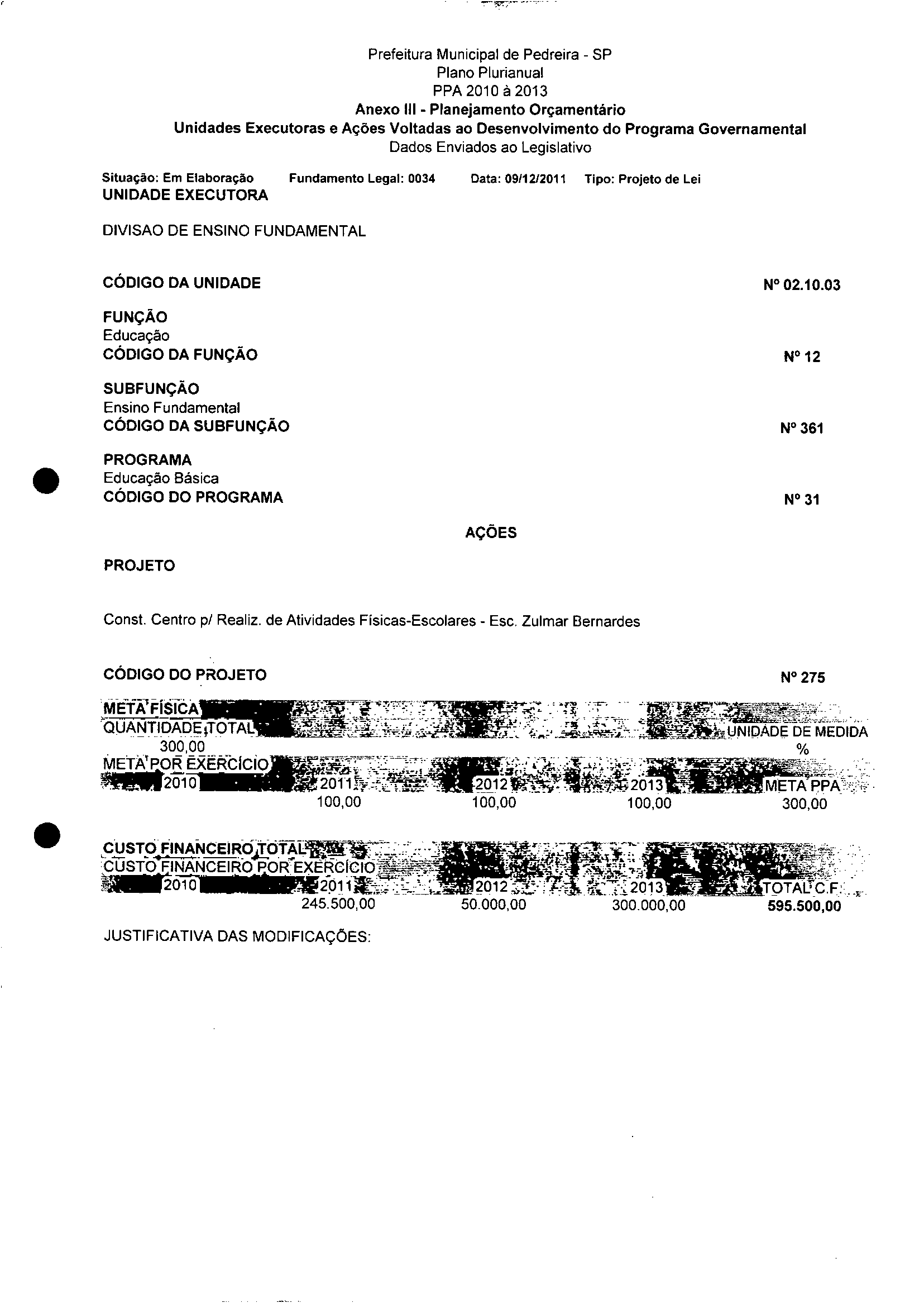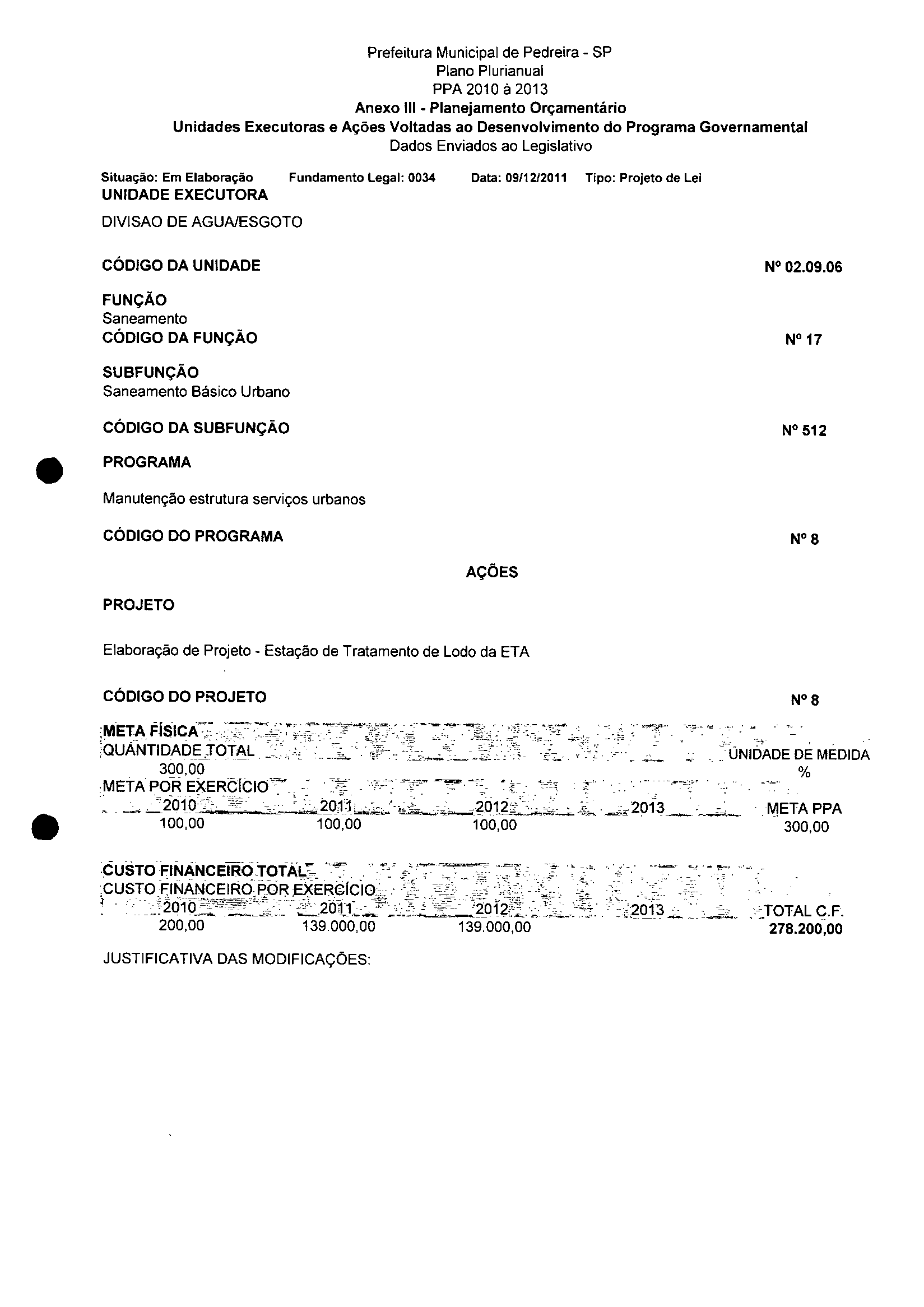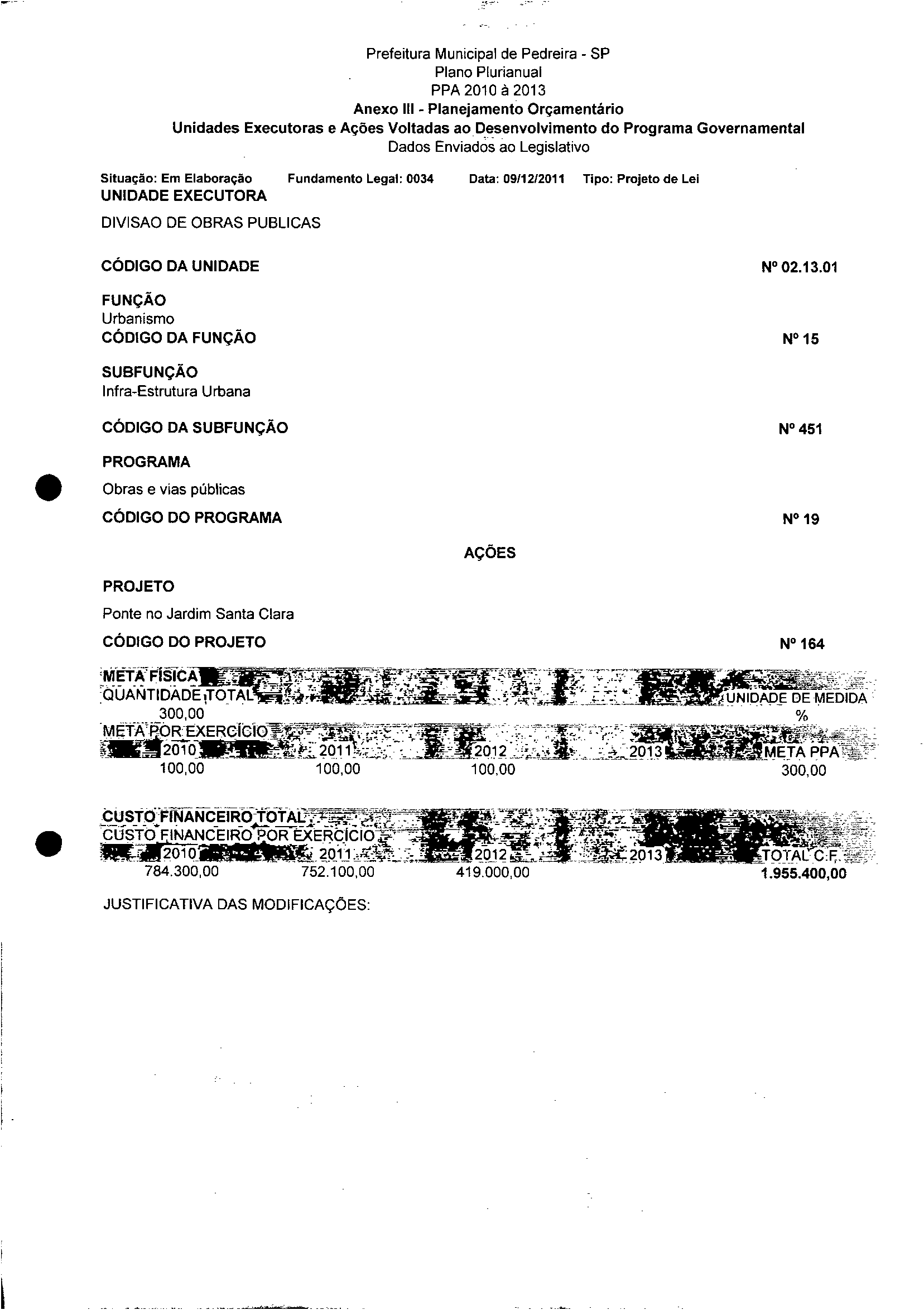 Ementa: Dispõe sobre a alteração dos anexos II e III -da Lei nº 2.977, de 5 de novembro de 2009 -Plano Plurianual para o Quadriênio de 2010/2013 e a alteração dos anexos Ve VI-da Lei nº 3.138, de 27 de junho de 2011 -Lei de Diretrizes Orçamentárias para o exercicio de 2012.