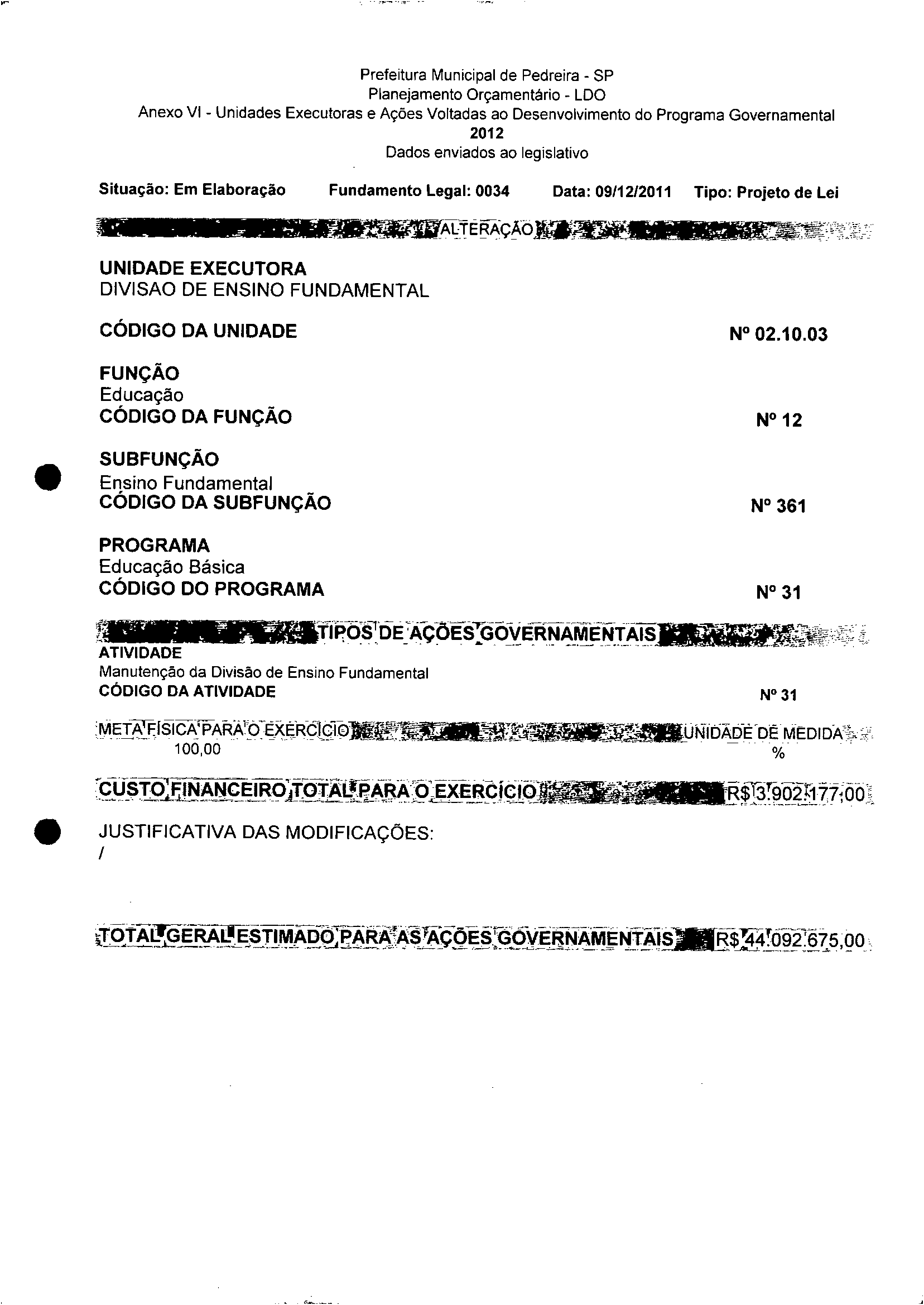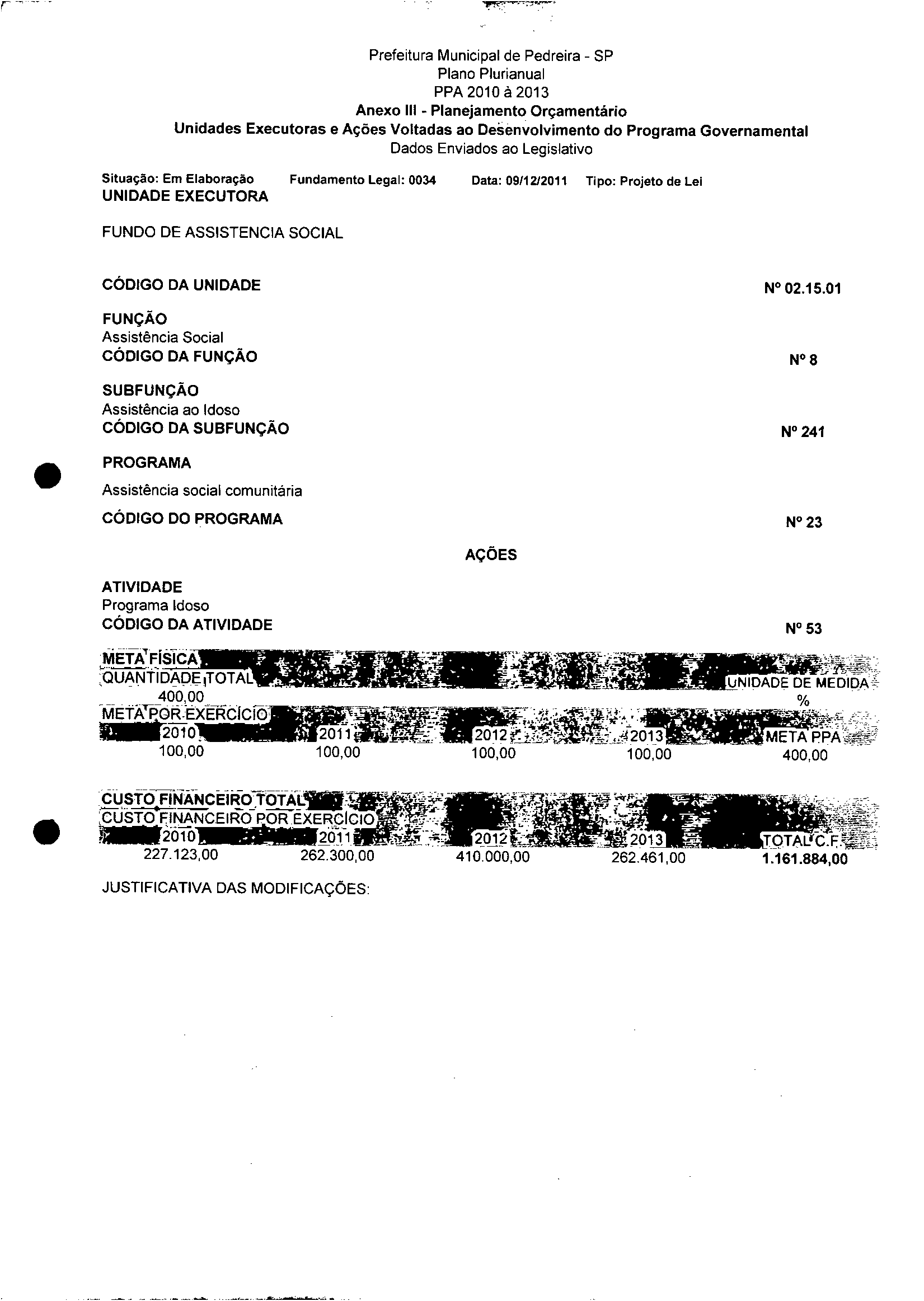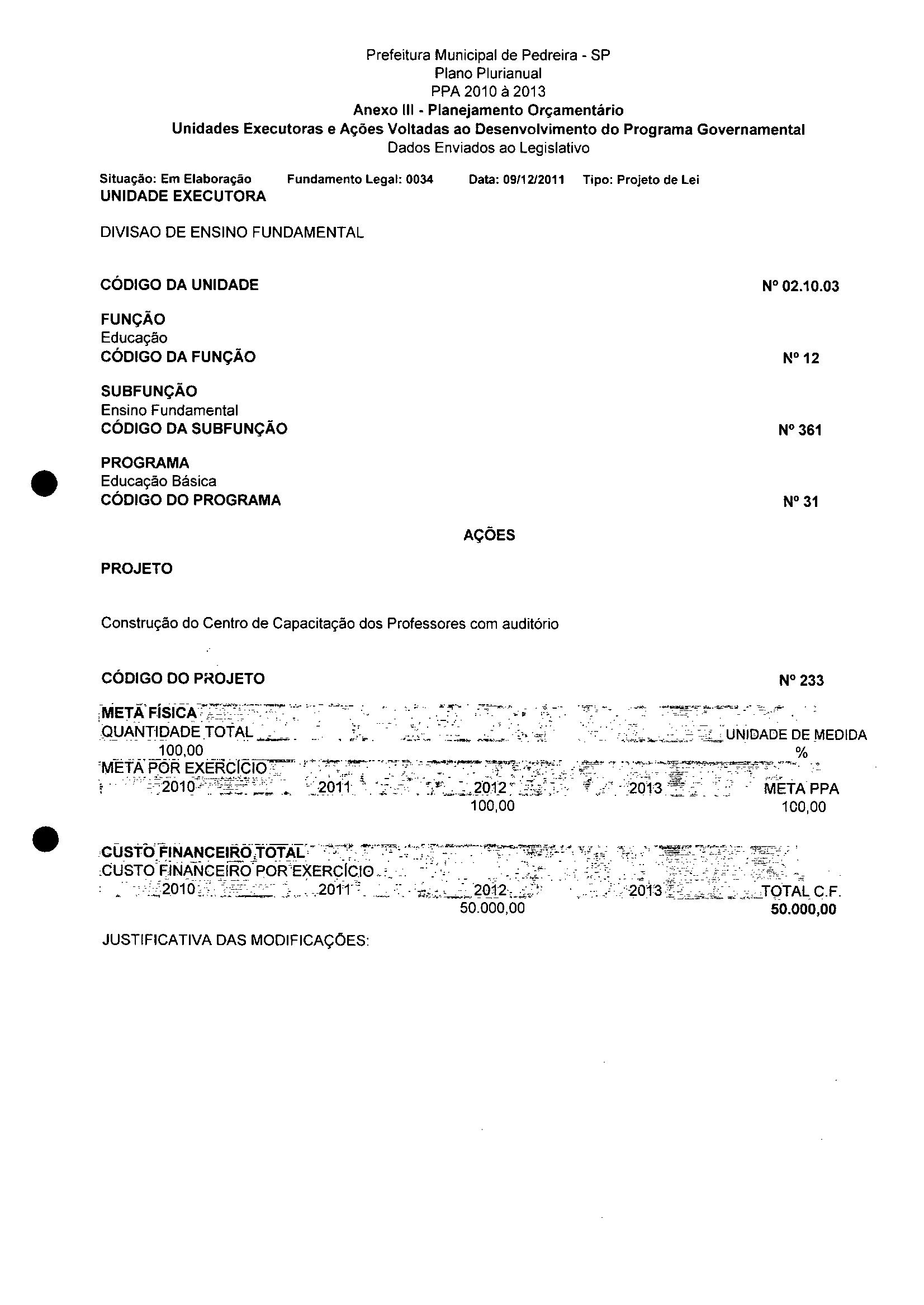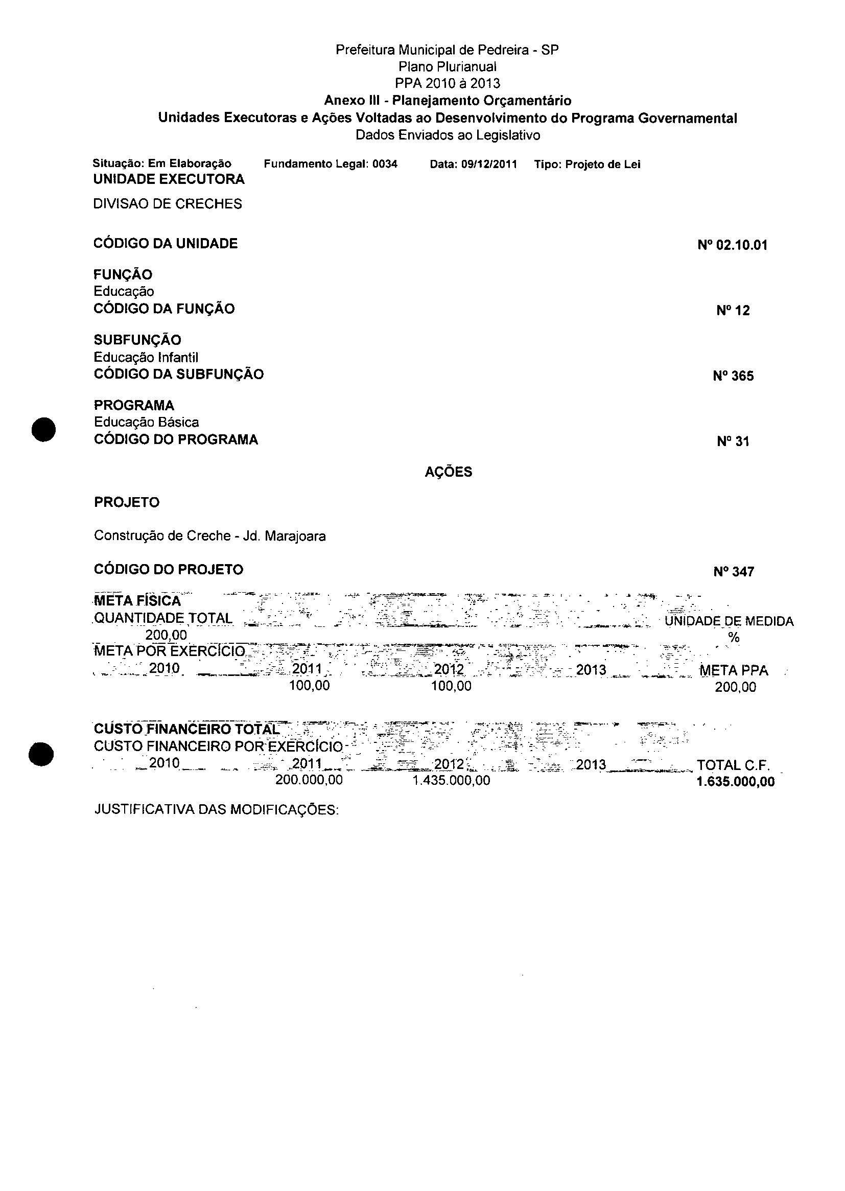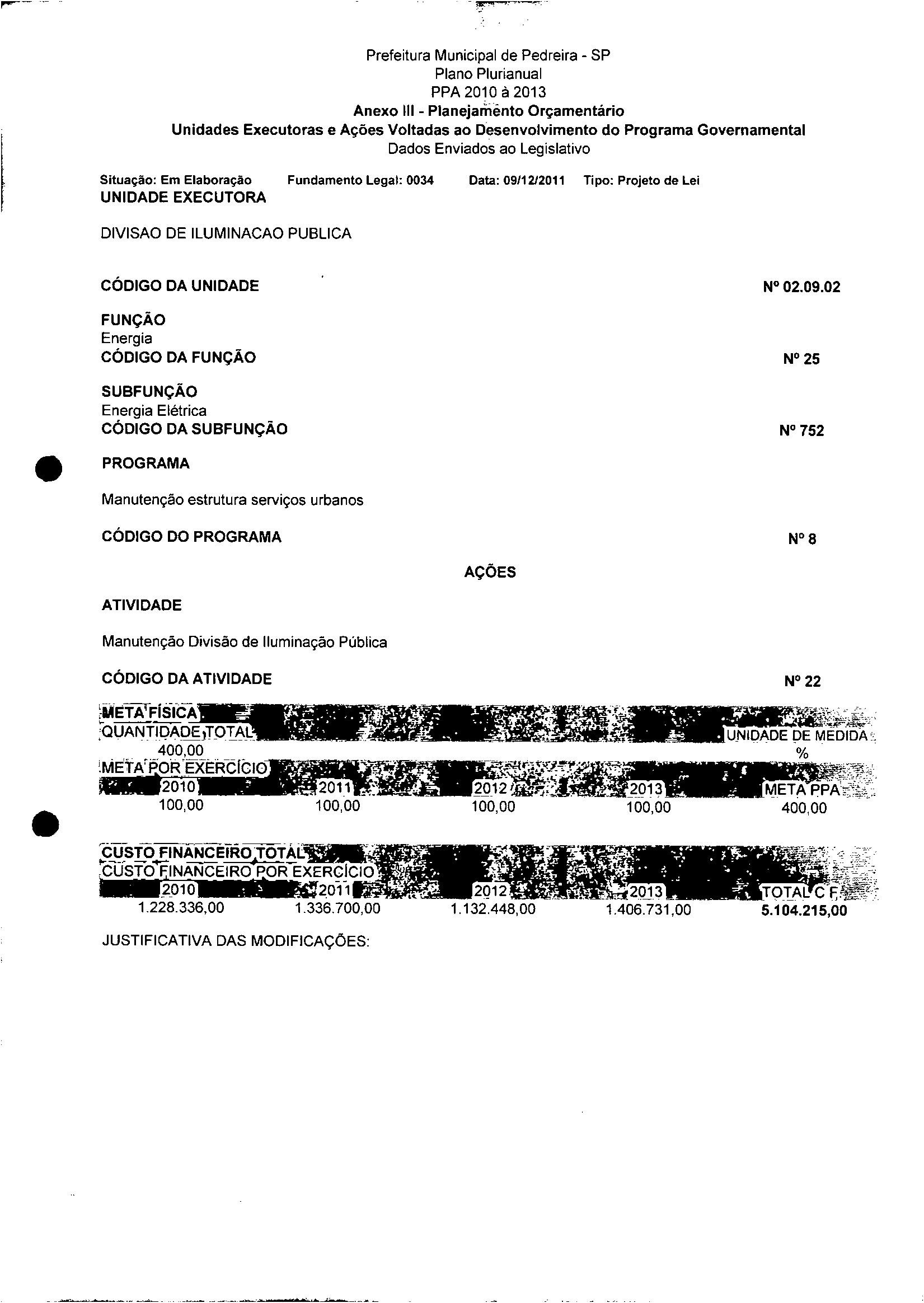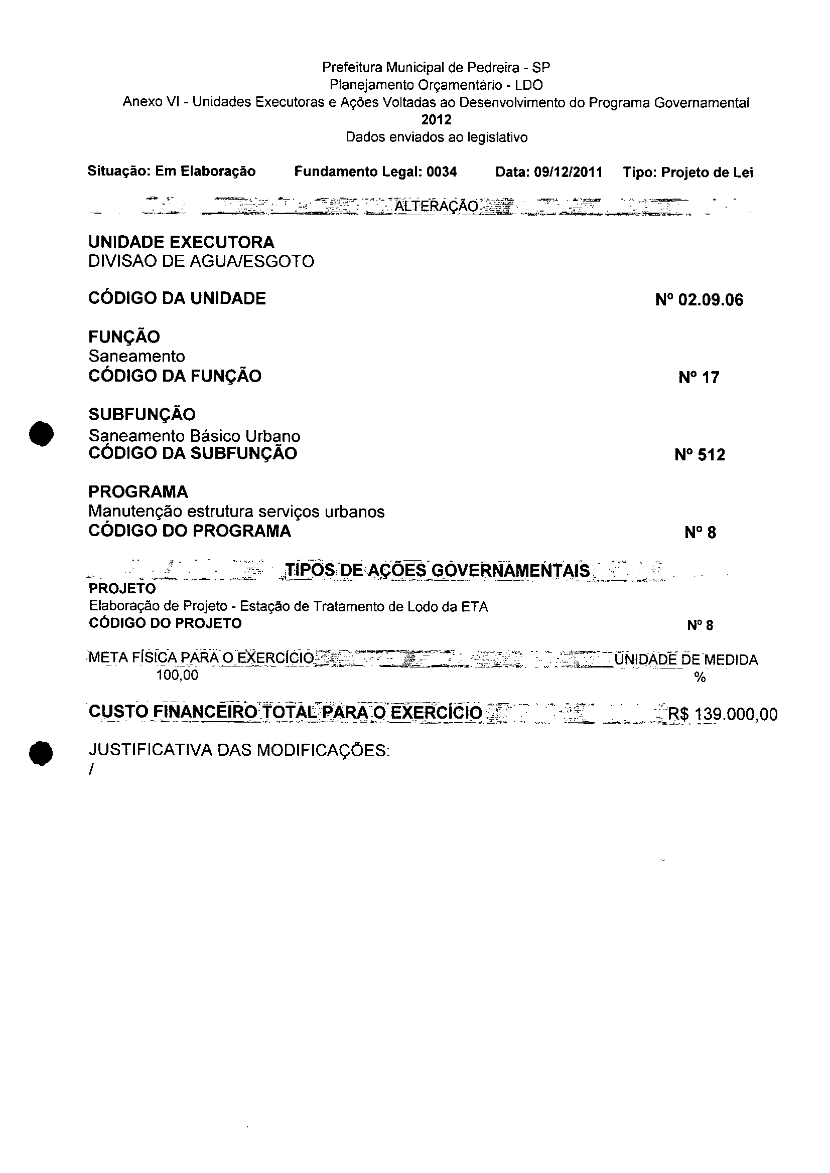 Ementa: Dispõe sobre a alteração dos anexos II e III -da Lei nº 2.977, de 5 de novembro de 2009 -Plano Plurianual para o Quadriênio de 2010/2013 e a alteração dos anexos Ve VI-da Lei nº 3.138, de 27 de junho de 2011 -Lei de Diretrizes Orçamentárias para o exercicio de 2012.