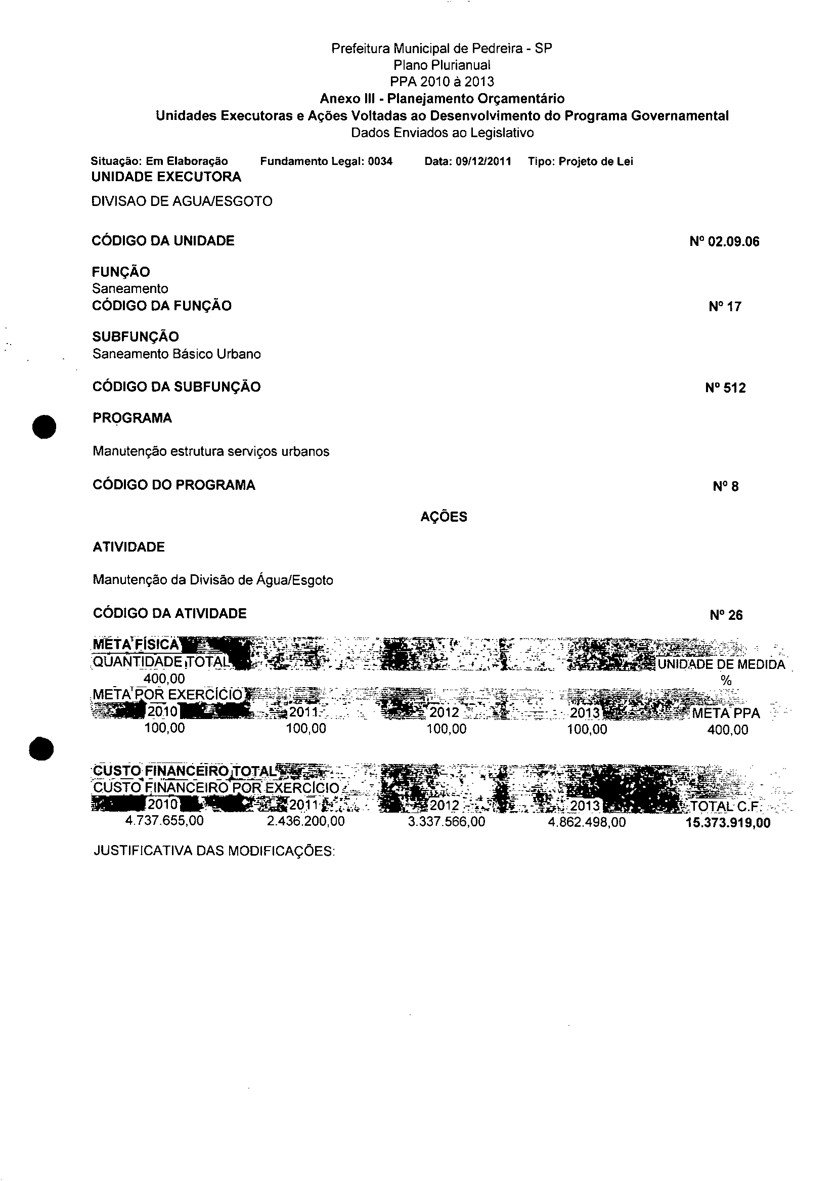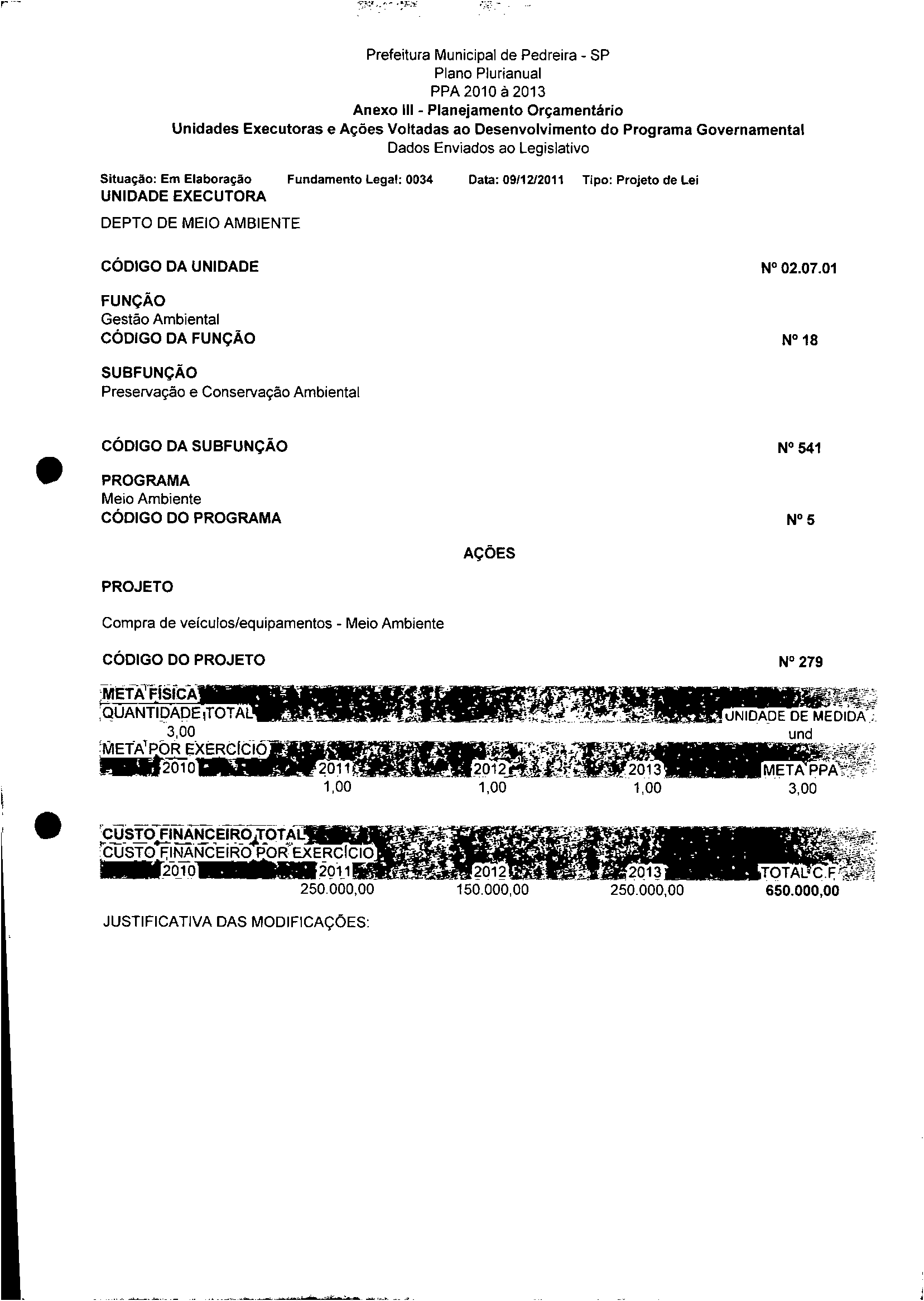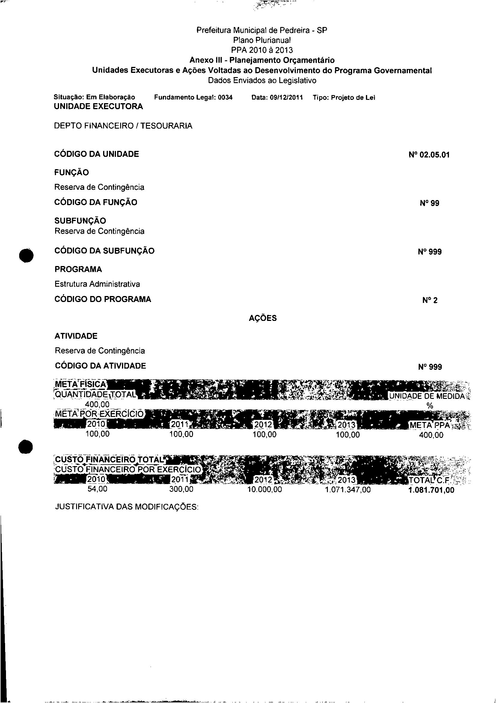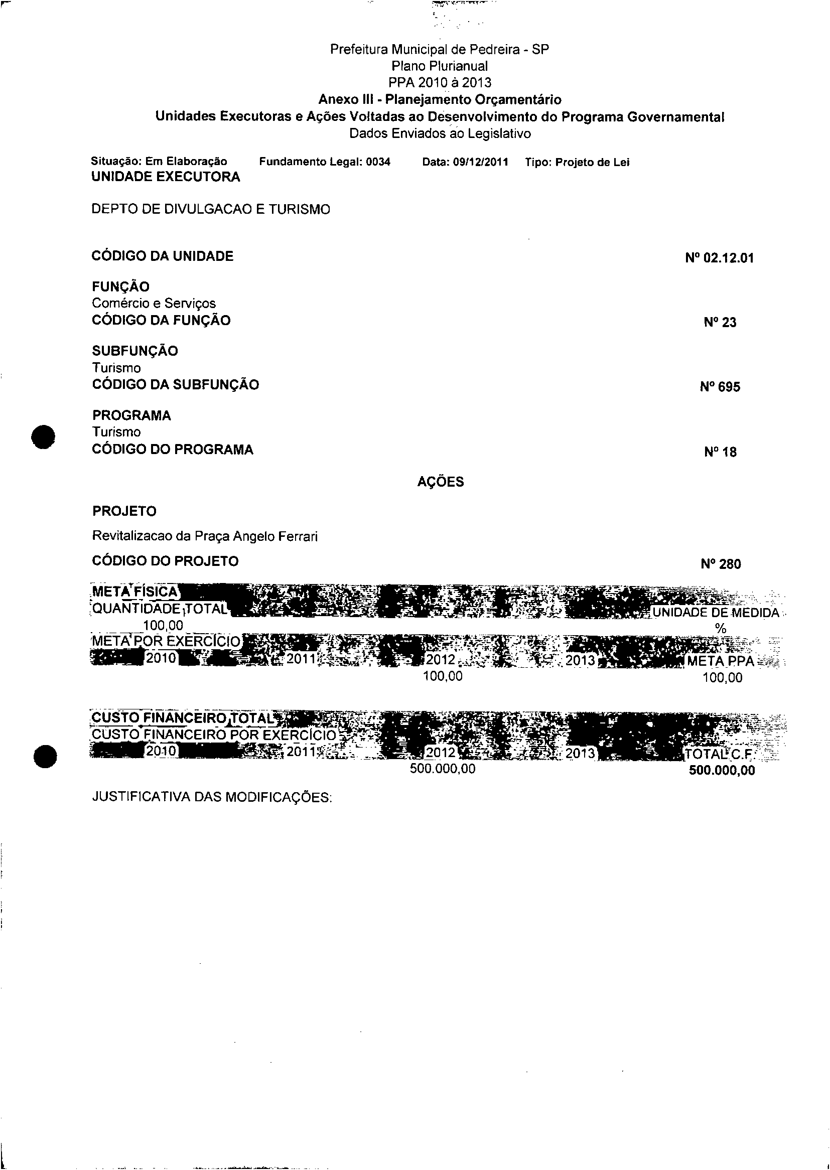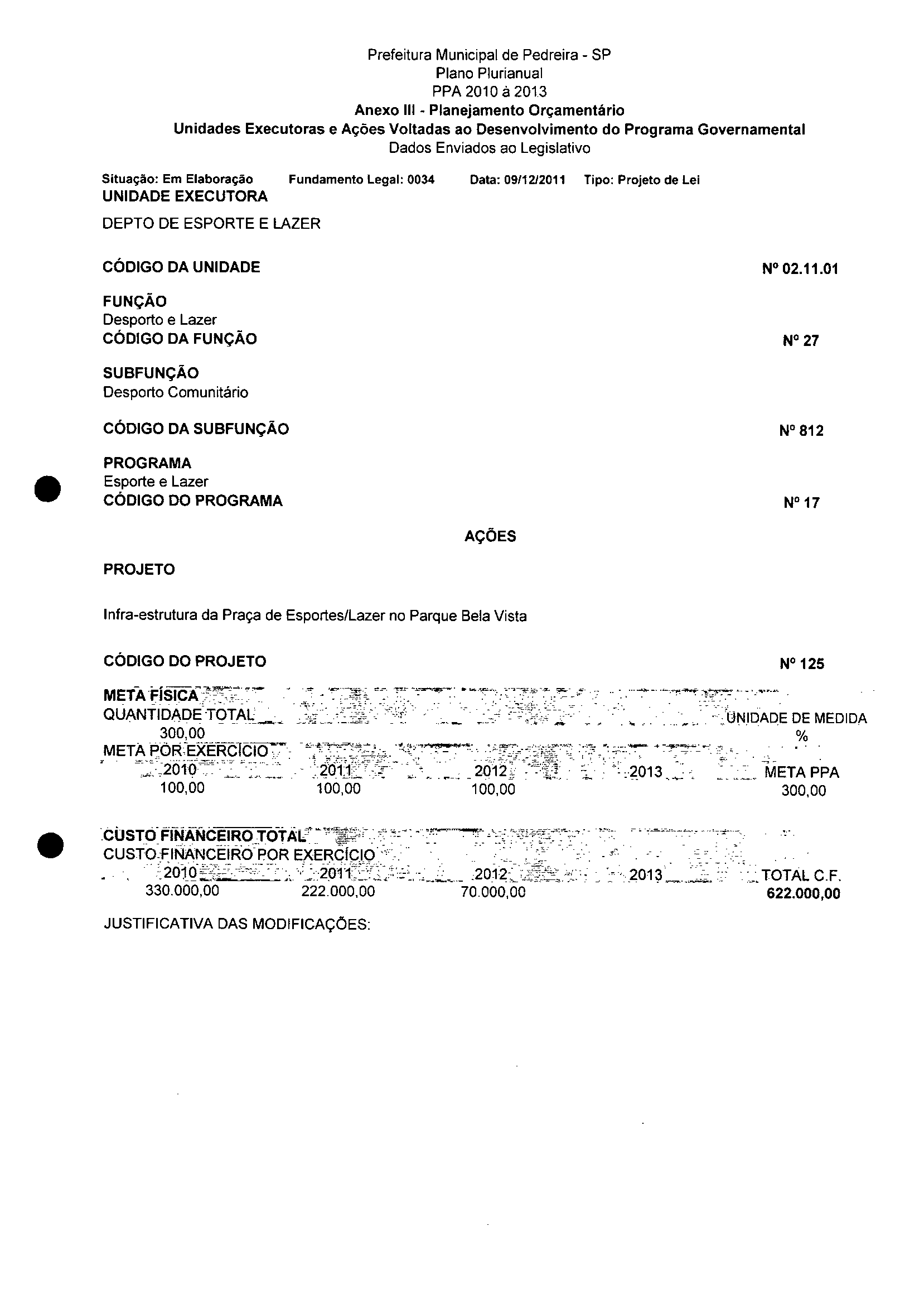 Ementa: Dispõe sobre a alteração dos anexos II e III -da Lei nº 2.977, de 5 de novembro de 2009 -Plano Plurianual para o Quadriênio de 2010/2013 e a alteração dos anexos Ve VI-da Lei nº 3.138, de 27 de junho de 2011 -Lei de Diretrizes Orçamentárias para o exercicio de 2012.