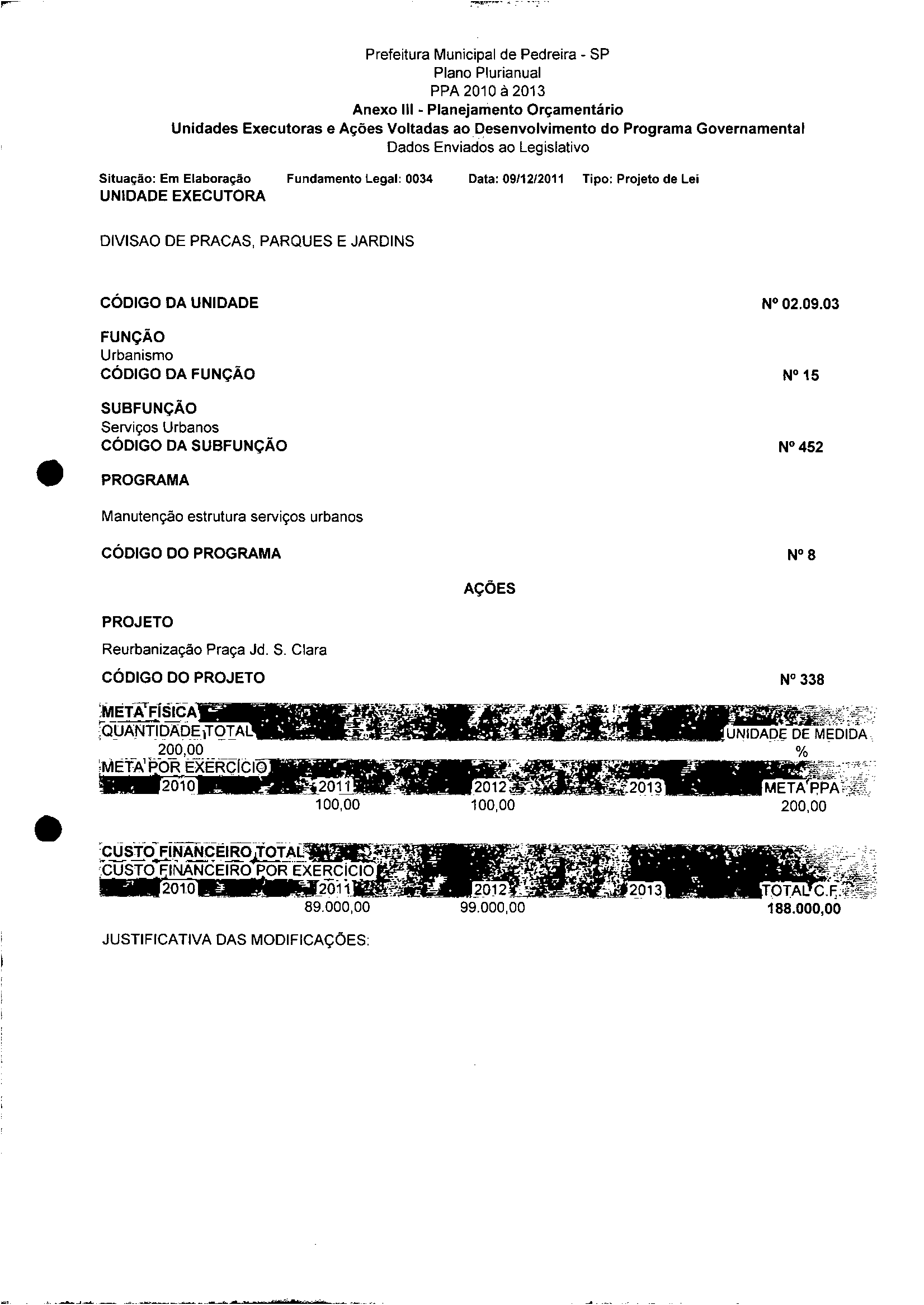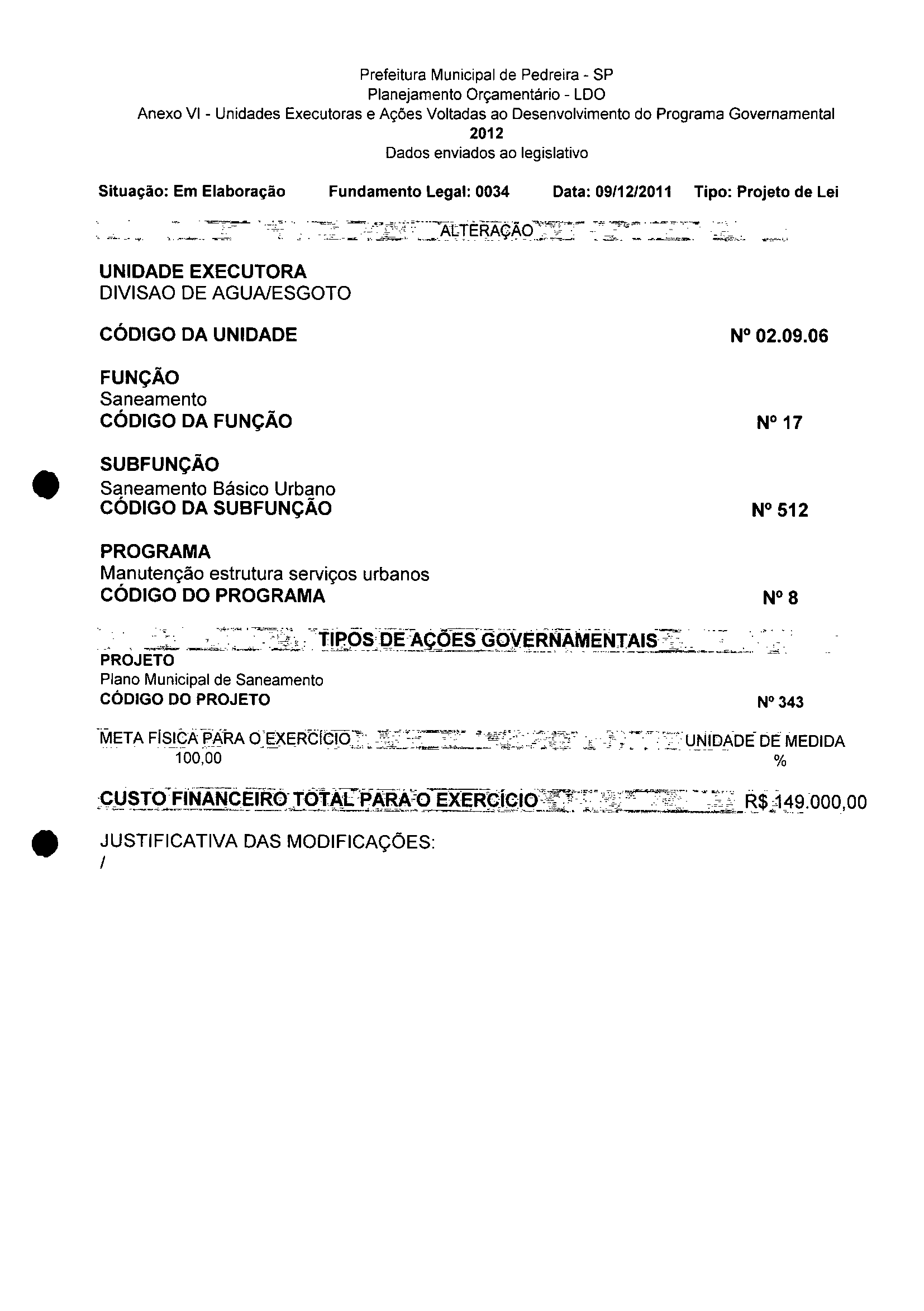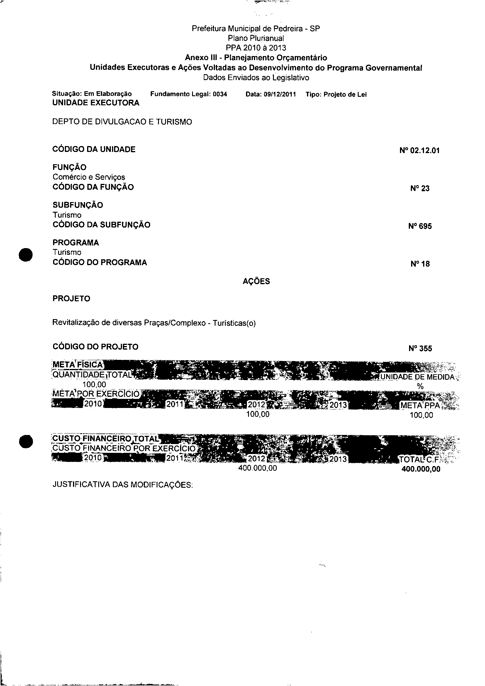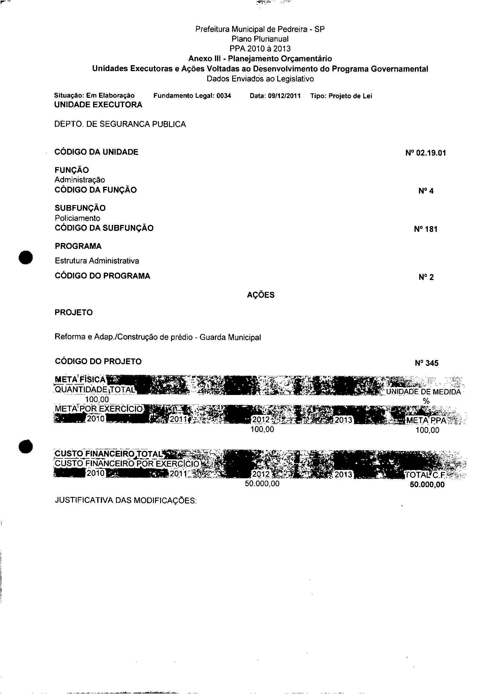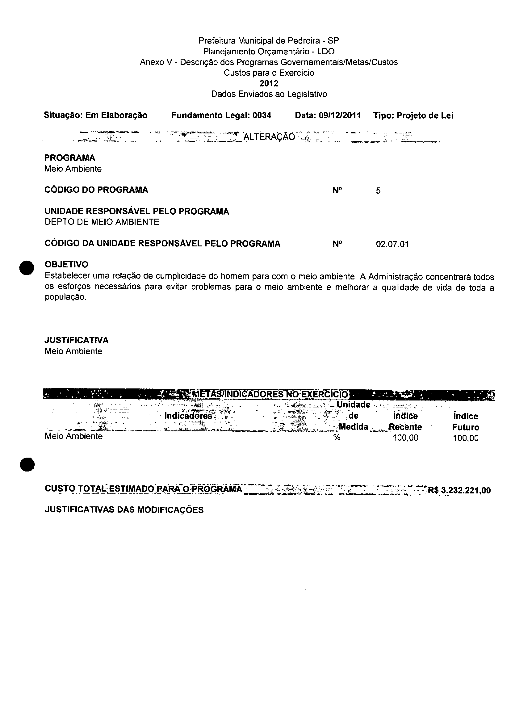 Ementa: Dispõe sobre a alteração dos anexos II e III -da Lei nº 2.977, de 5 de novembro de 2009 -Plano Plurianual para o Quadriênio de 2010/2013 e a alteração dos anexos Ve VI-da Lei nº 3.138, de 27 de junho de 2011 -Lei de Diretrizes Orçamentárias para o exercicio de 2012.