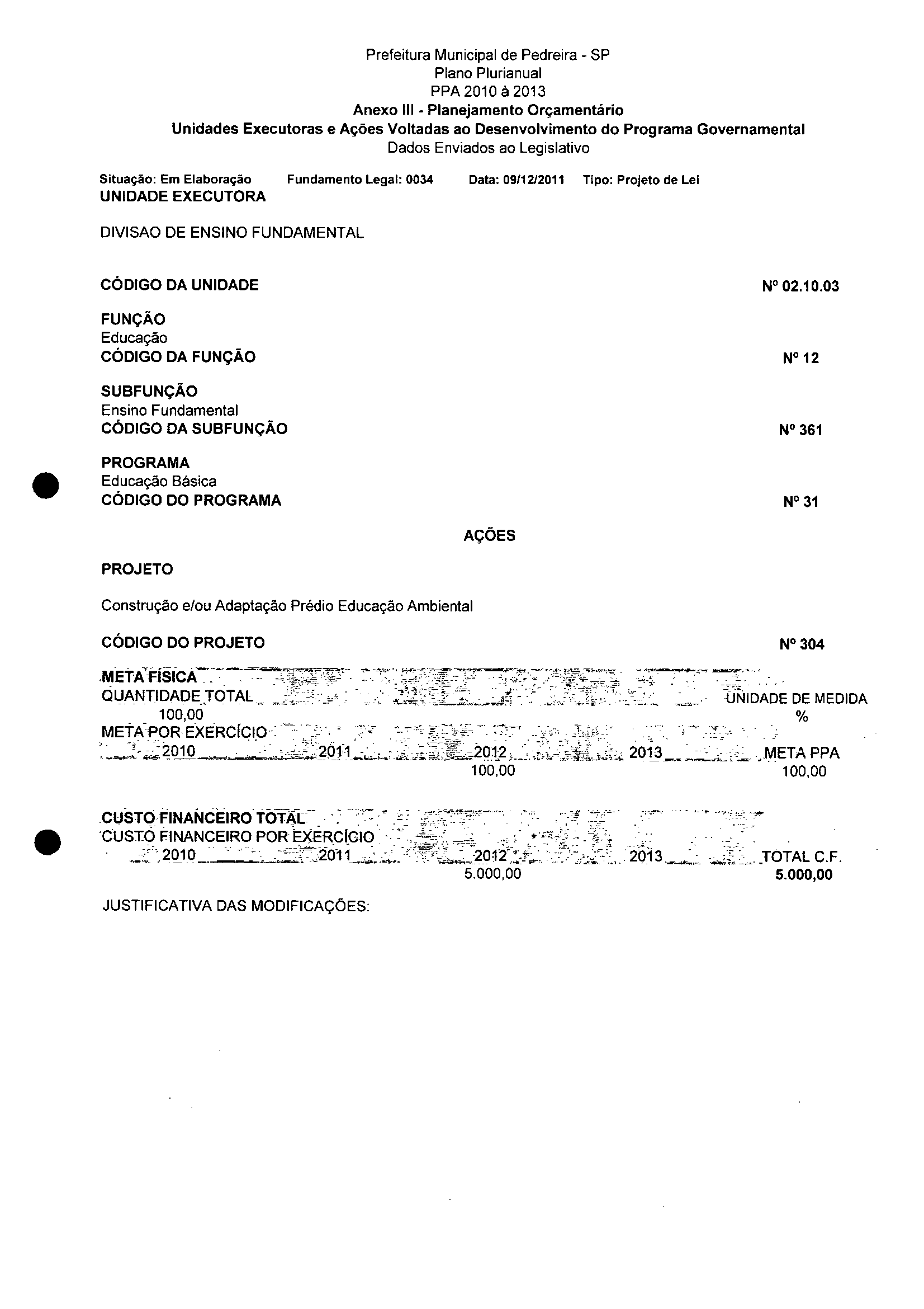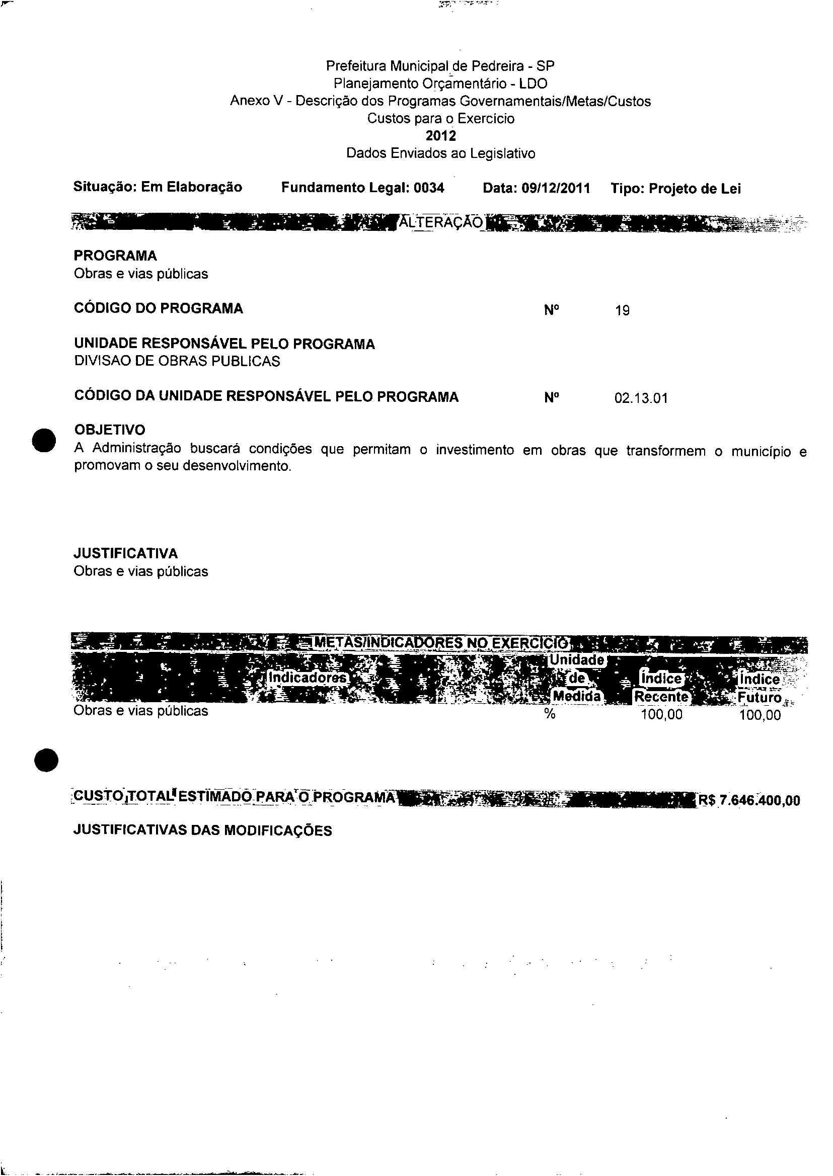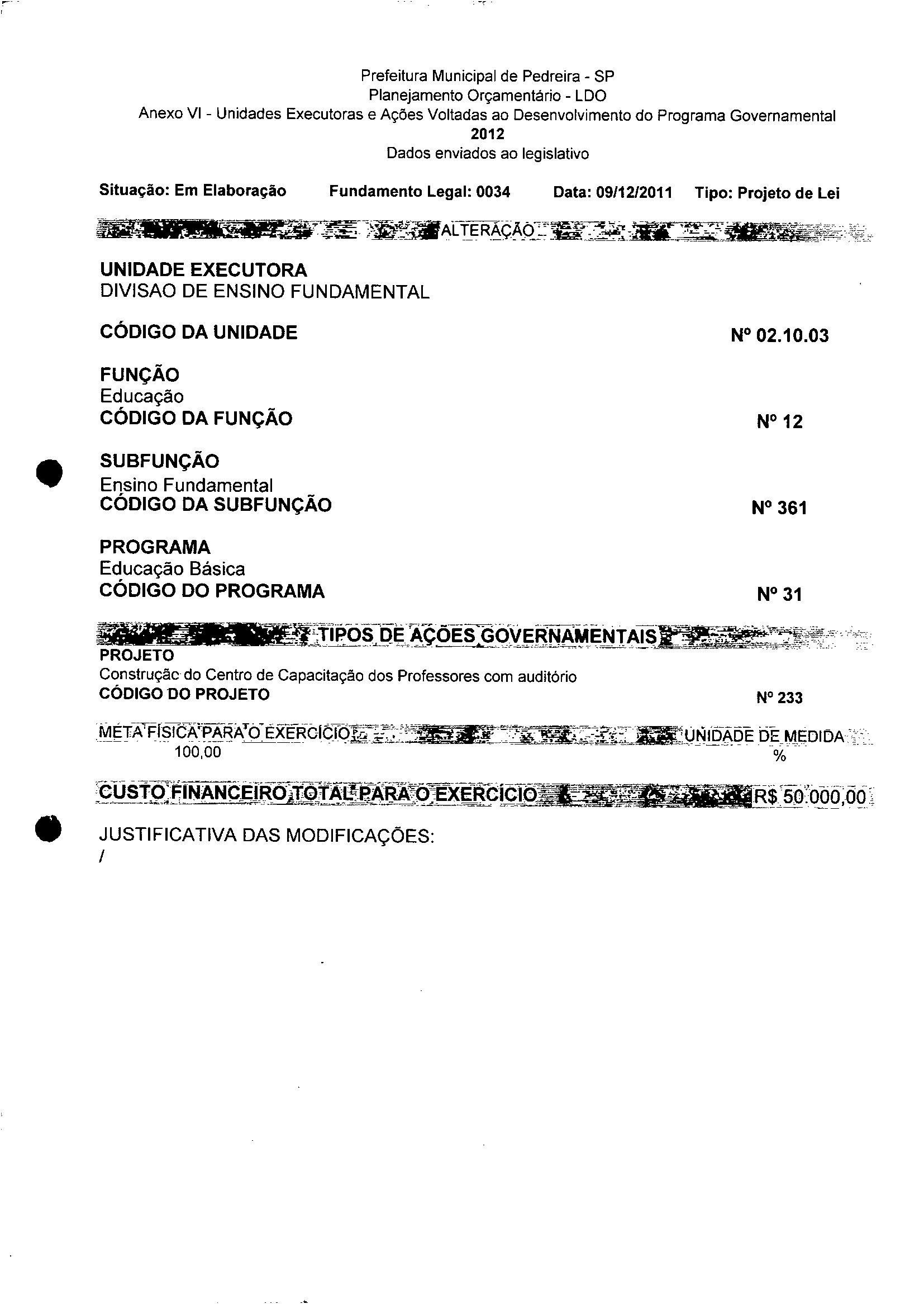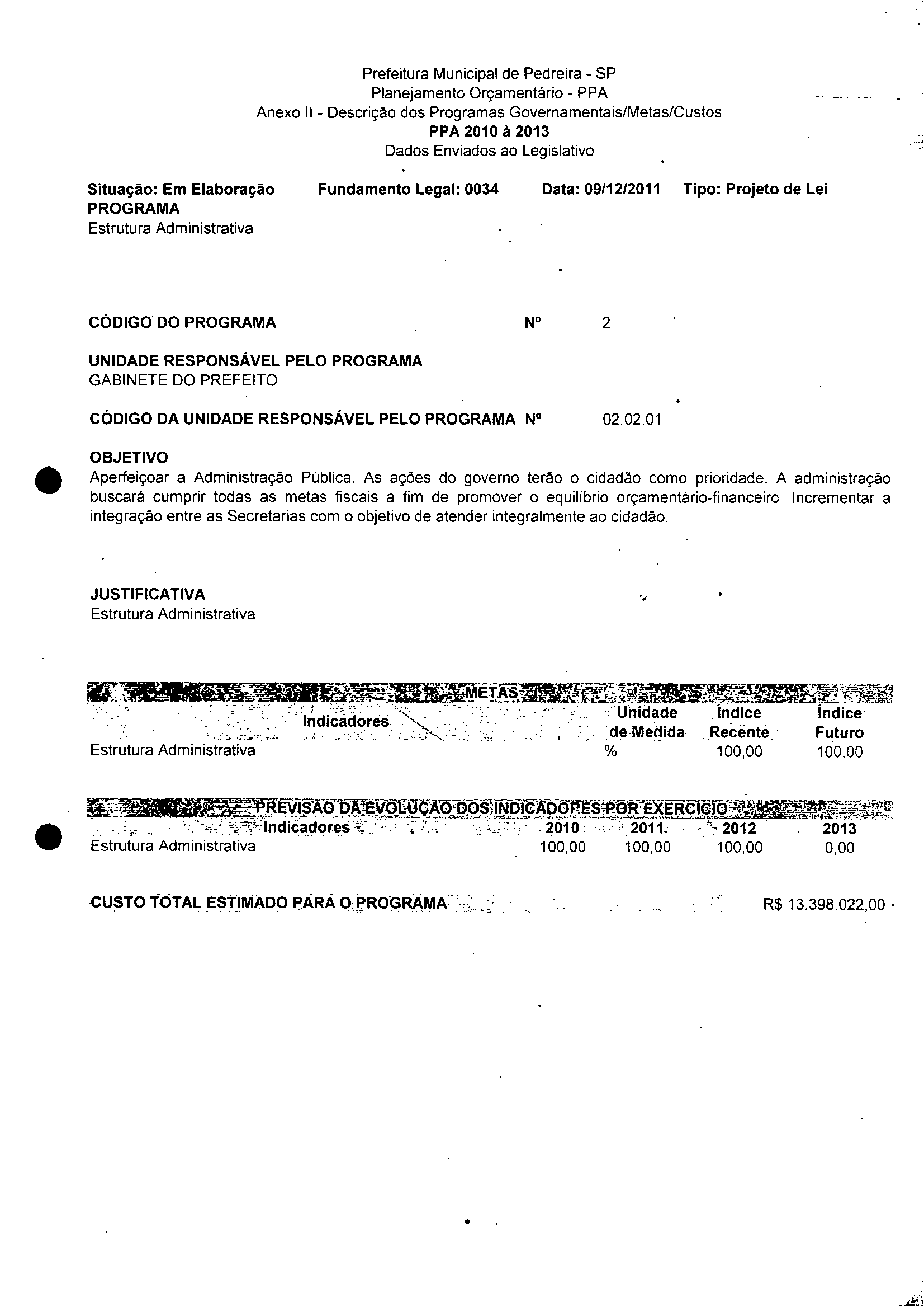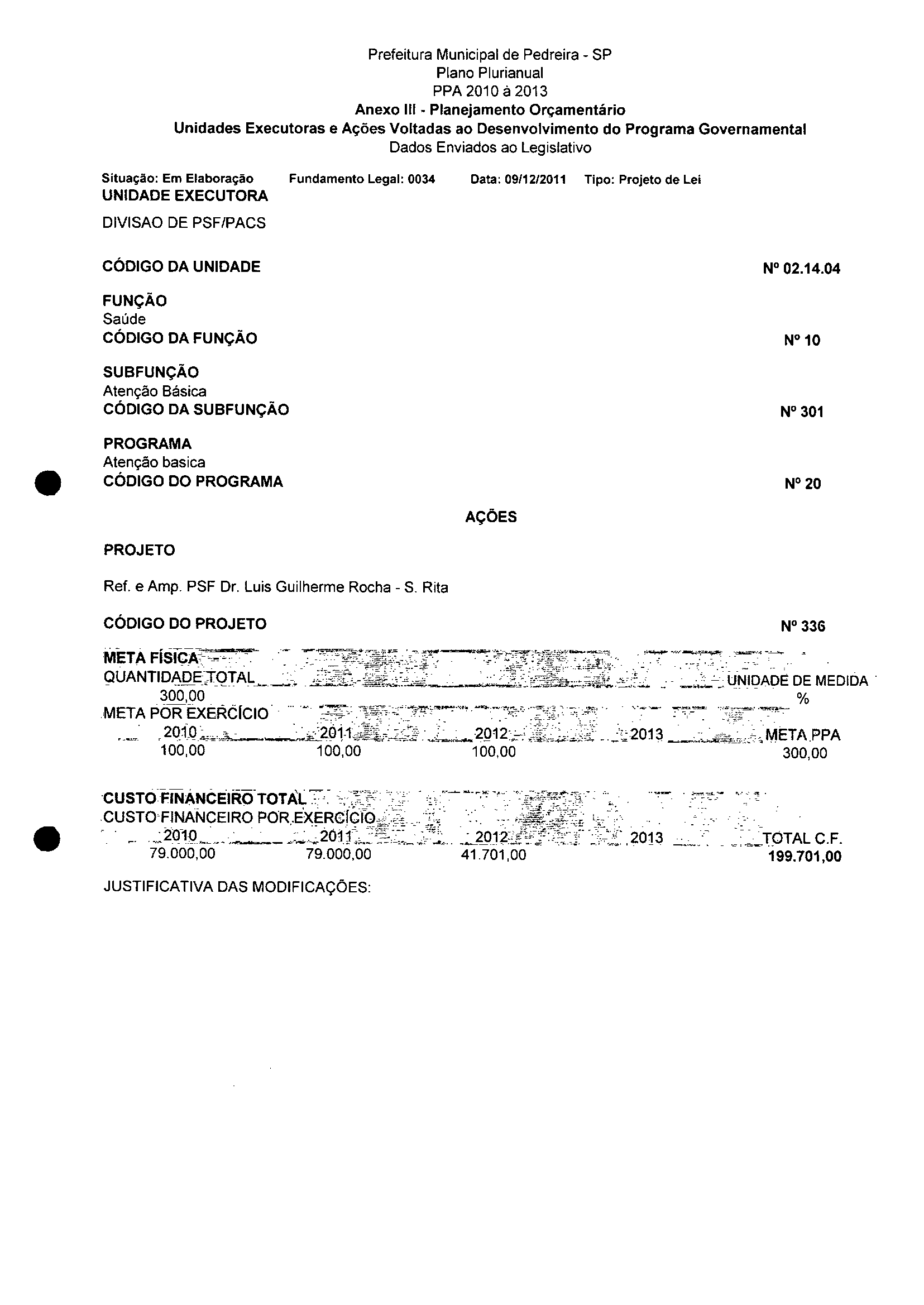 Ementa: Dispõe sobre a alteração dos anexos II e III -da Lei nº 2.977, de 5 de novembro de 2009 -Plano Plurianual para o Quadriênio de 2010/2013 e a alteração dos anexos Ve VI-da Lei nº 3.138, de 27 de junho de 2011 -Lei de Diretrizes Orçamentárias para o exercicio de 2012.