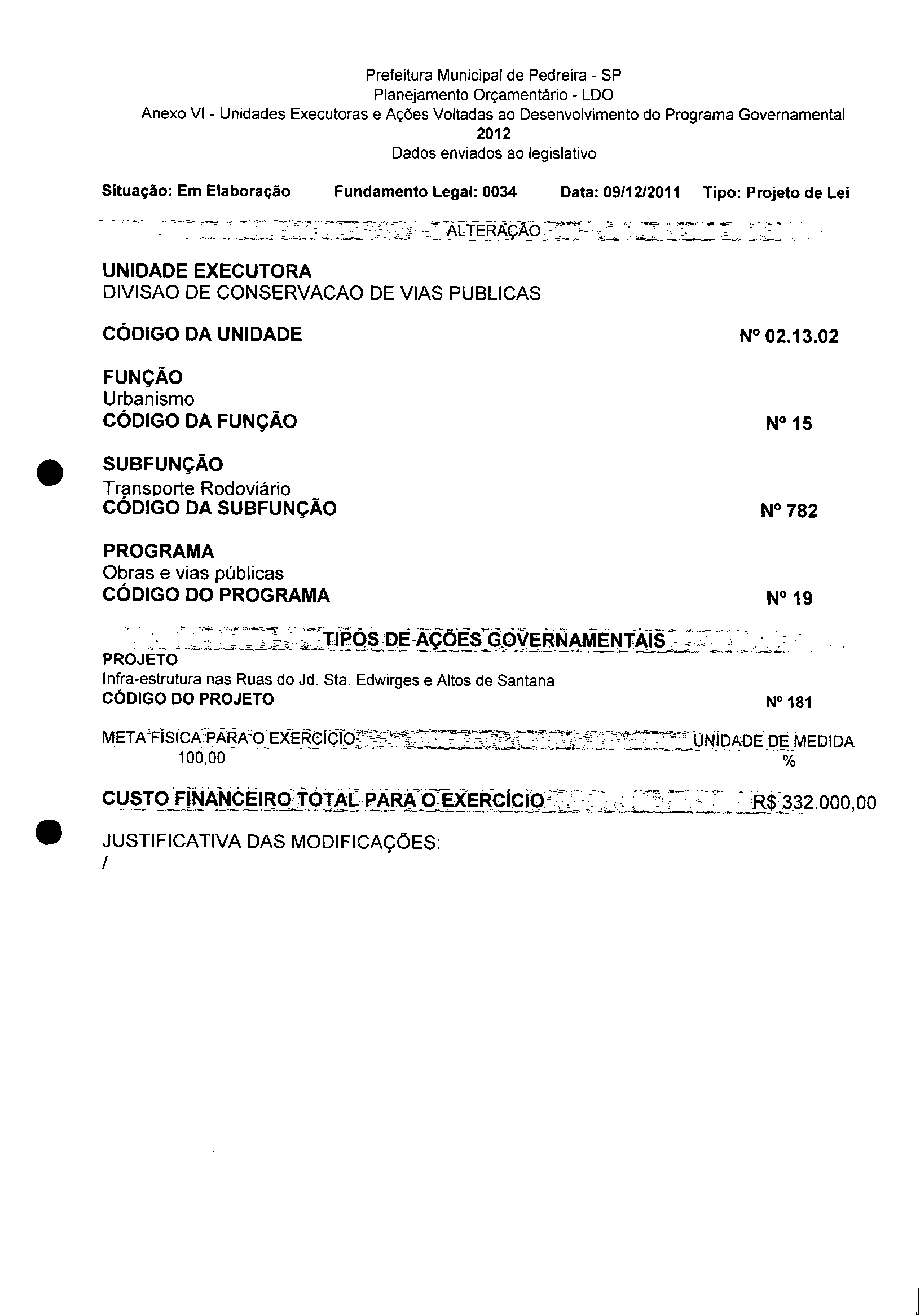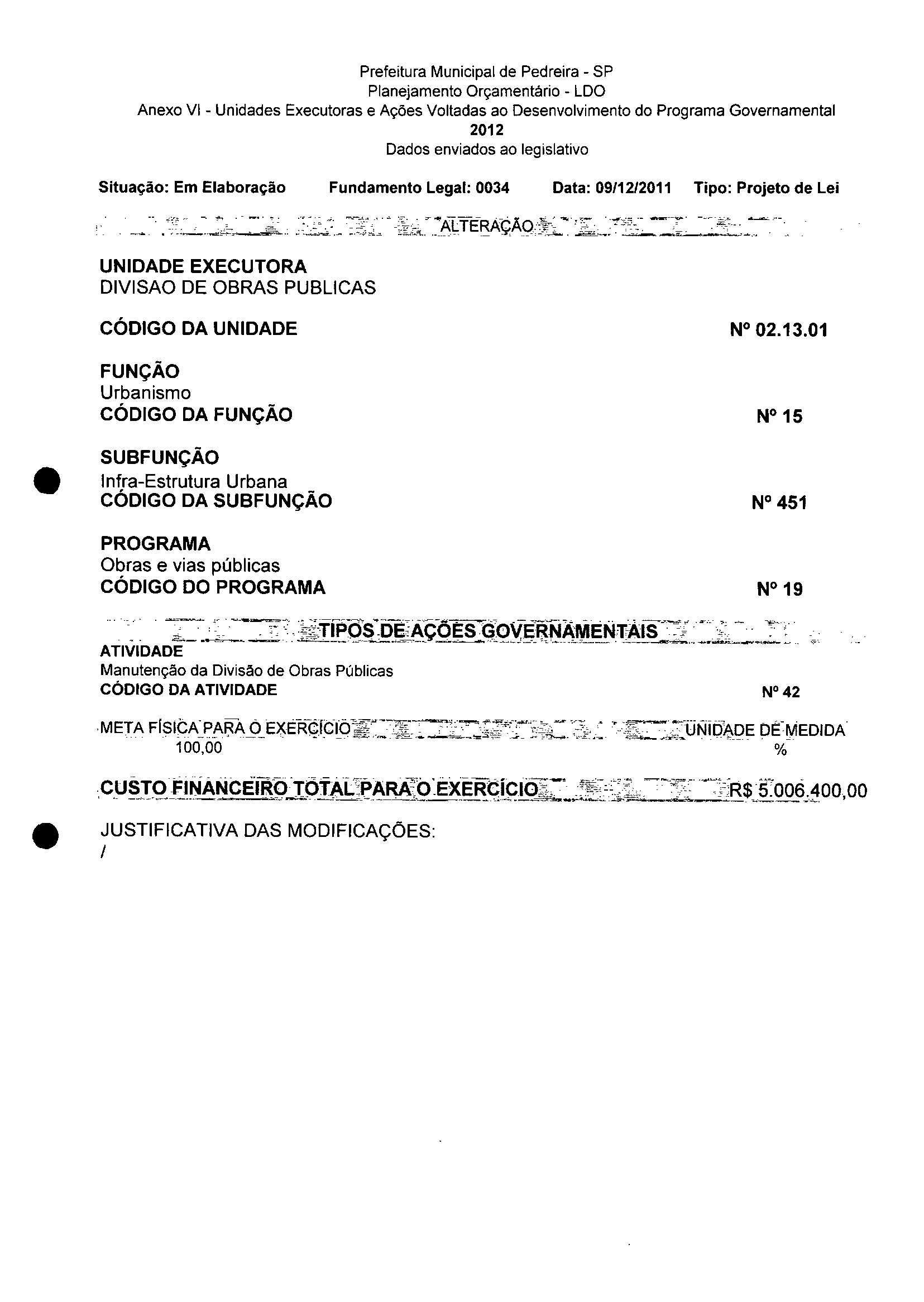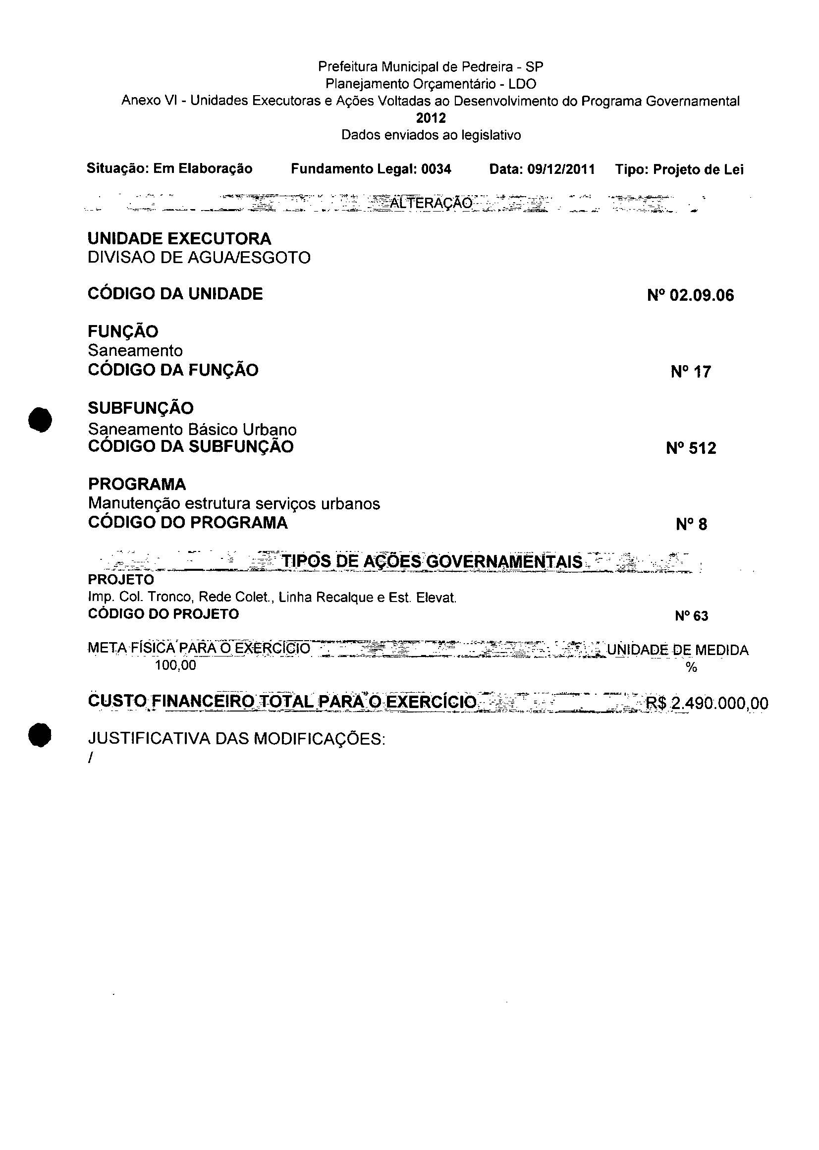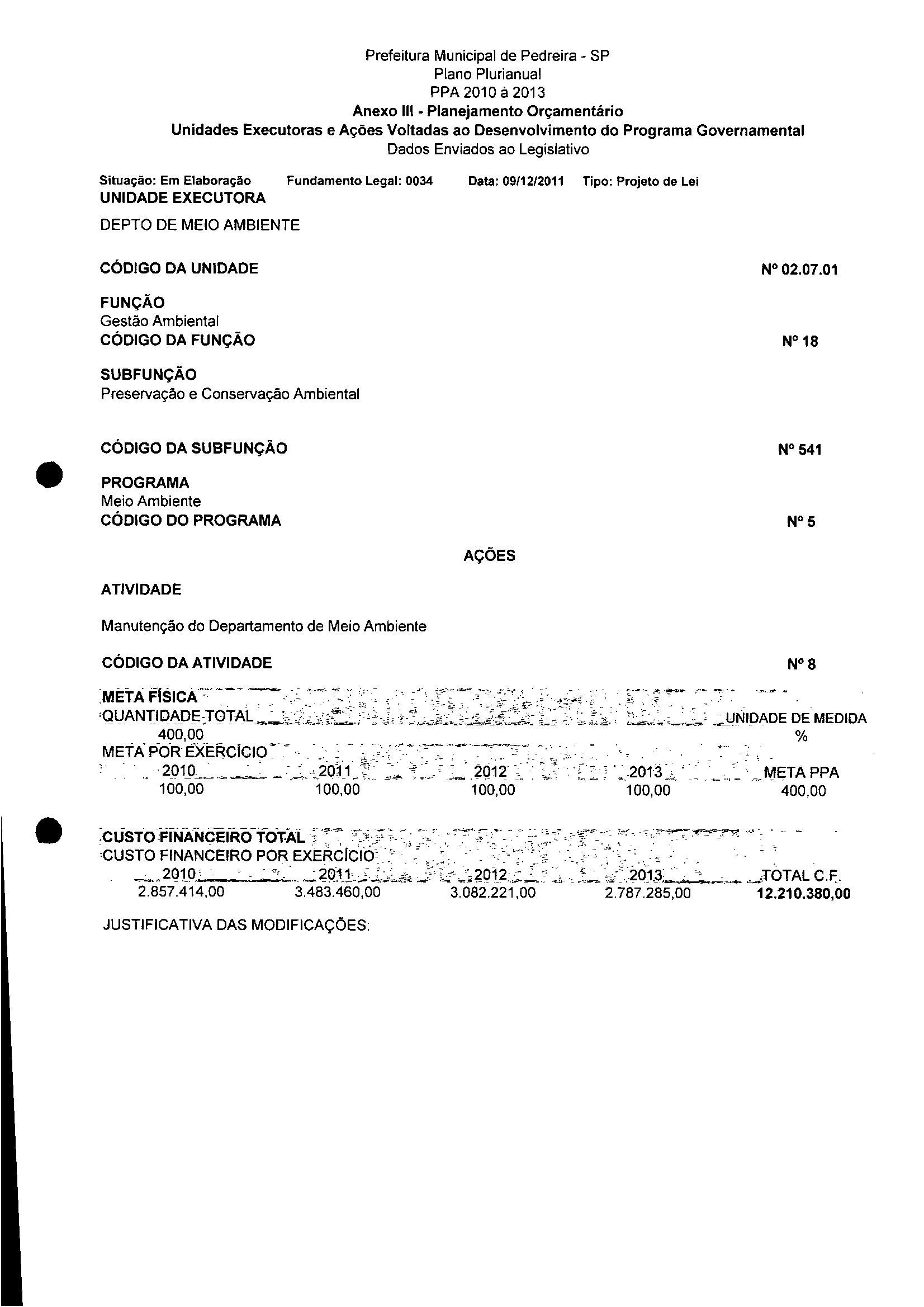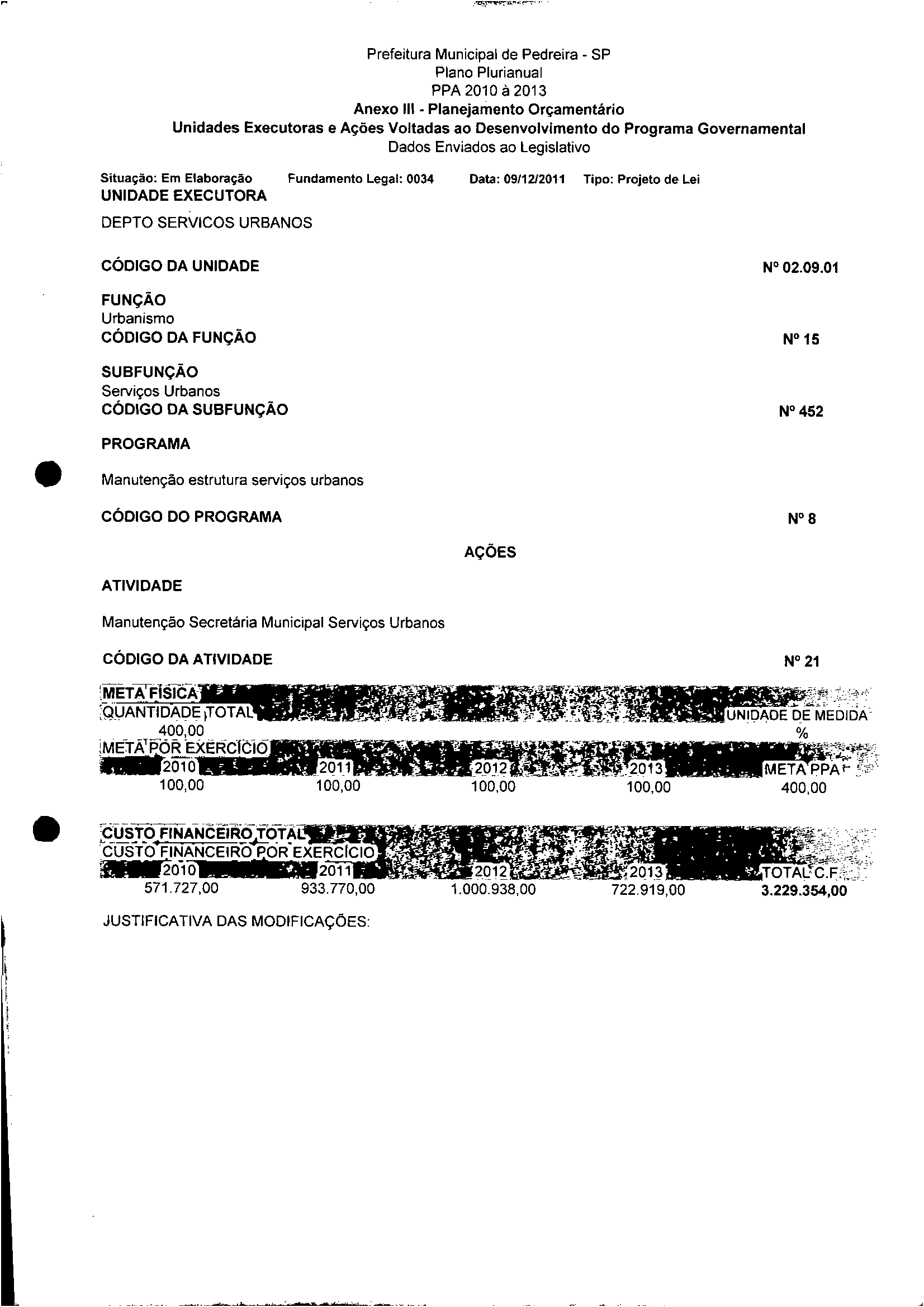 Ementa: Dispõe sobre a alteração dos anexos II e III -da Lei nº 2.977, de 5 de novembro de 2009 -Plano Plurianual para o Quadriênio de 2010/2013 e a alteração dos anexos Ve VI-da Lei nº 3.138, de 27 de junho de 2011 -Lei de Diretrizes Orçamentárias para o exercicio de 2012.