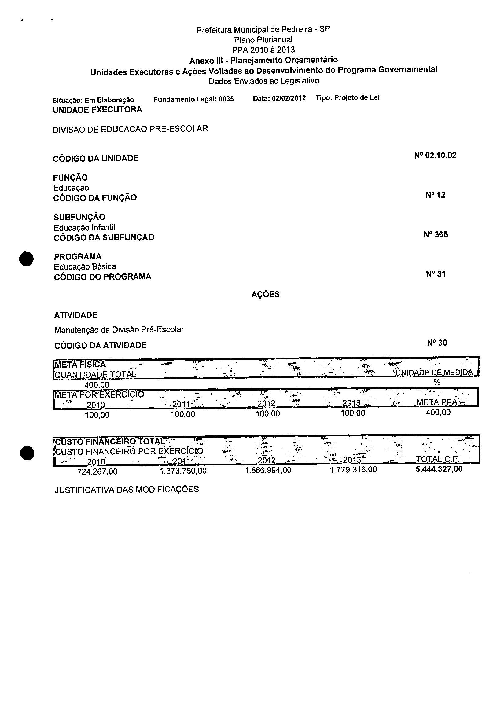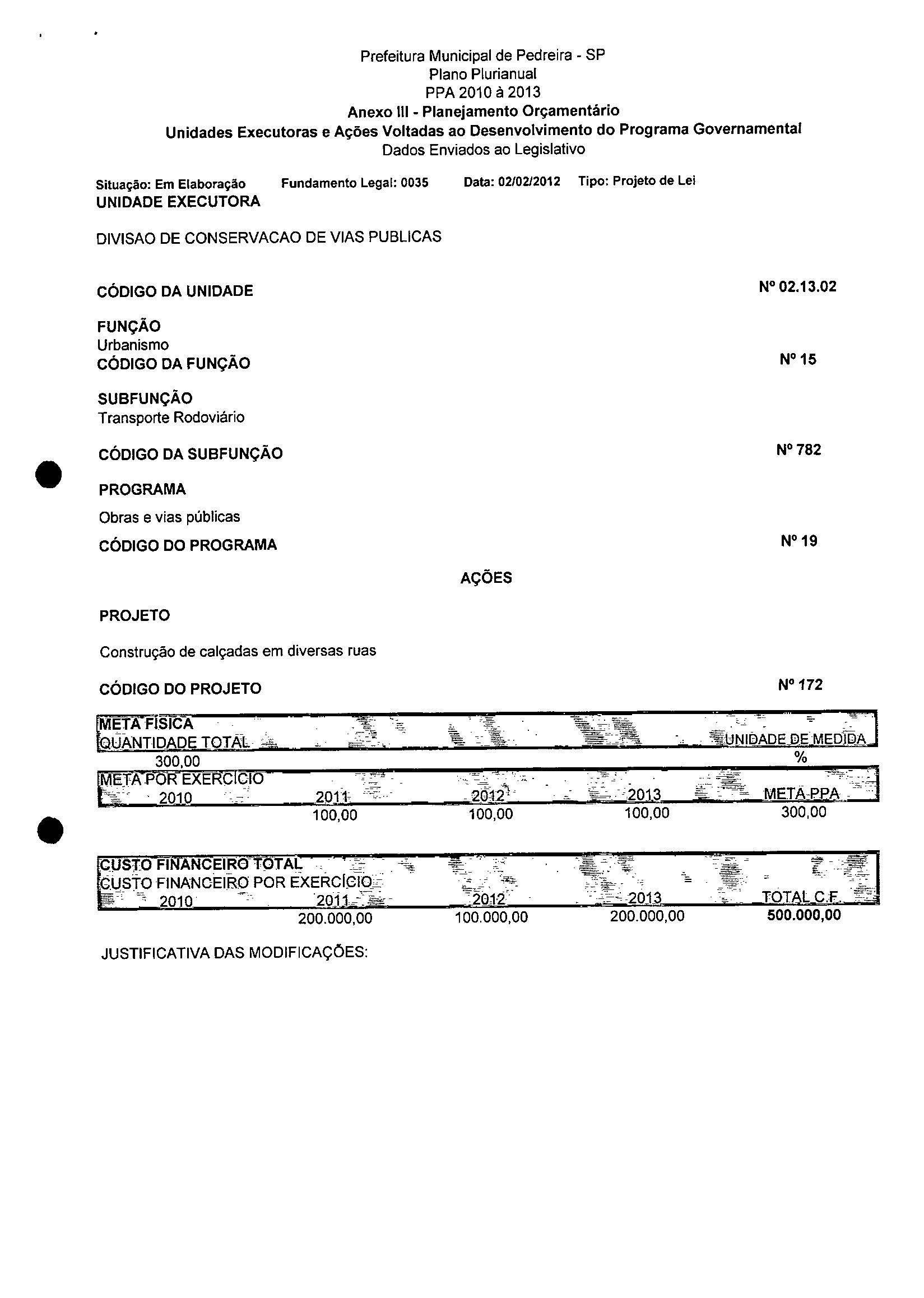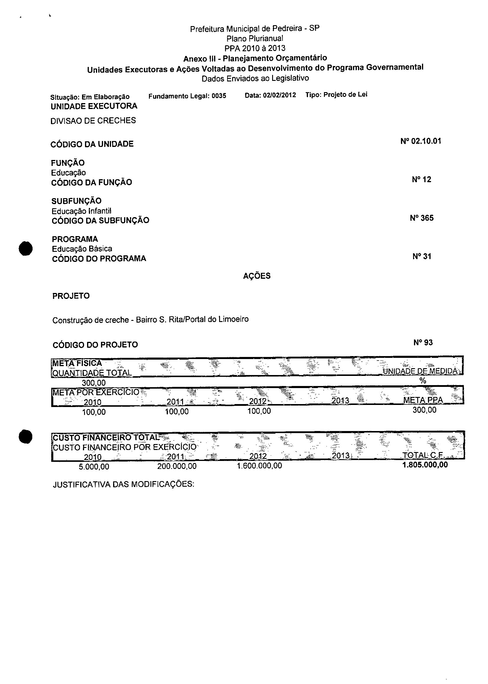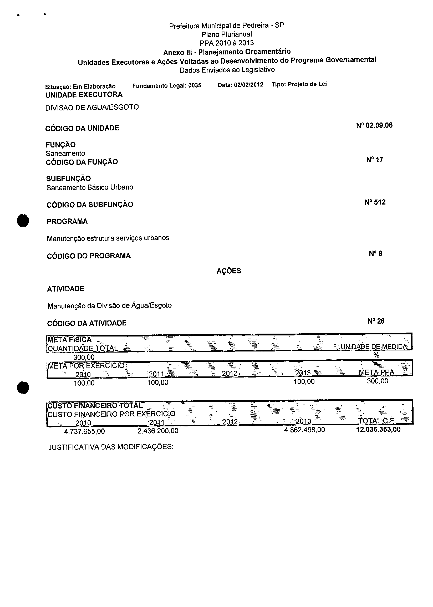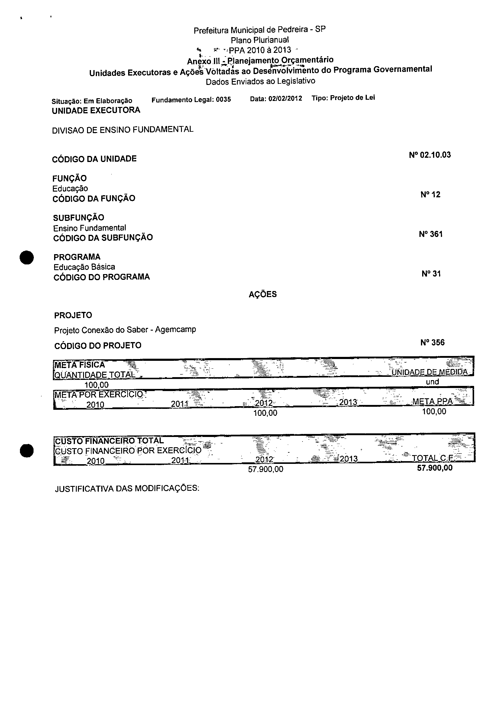 Ementa: Dispõe sobre a alteração dos anexos 1II e III -da Lei nº 2,977, de 5 de novembro de 2009 -Plano Plurianual para o Quadriênio de 2010/2013 e a alteração dos anexos Ve VI -da Lei nº 3.138, de 27 de junho de 2011 -Lei de Diretrizes Orçamentárias para o exercício de 2012.