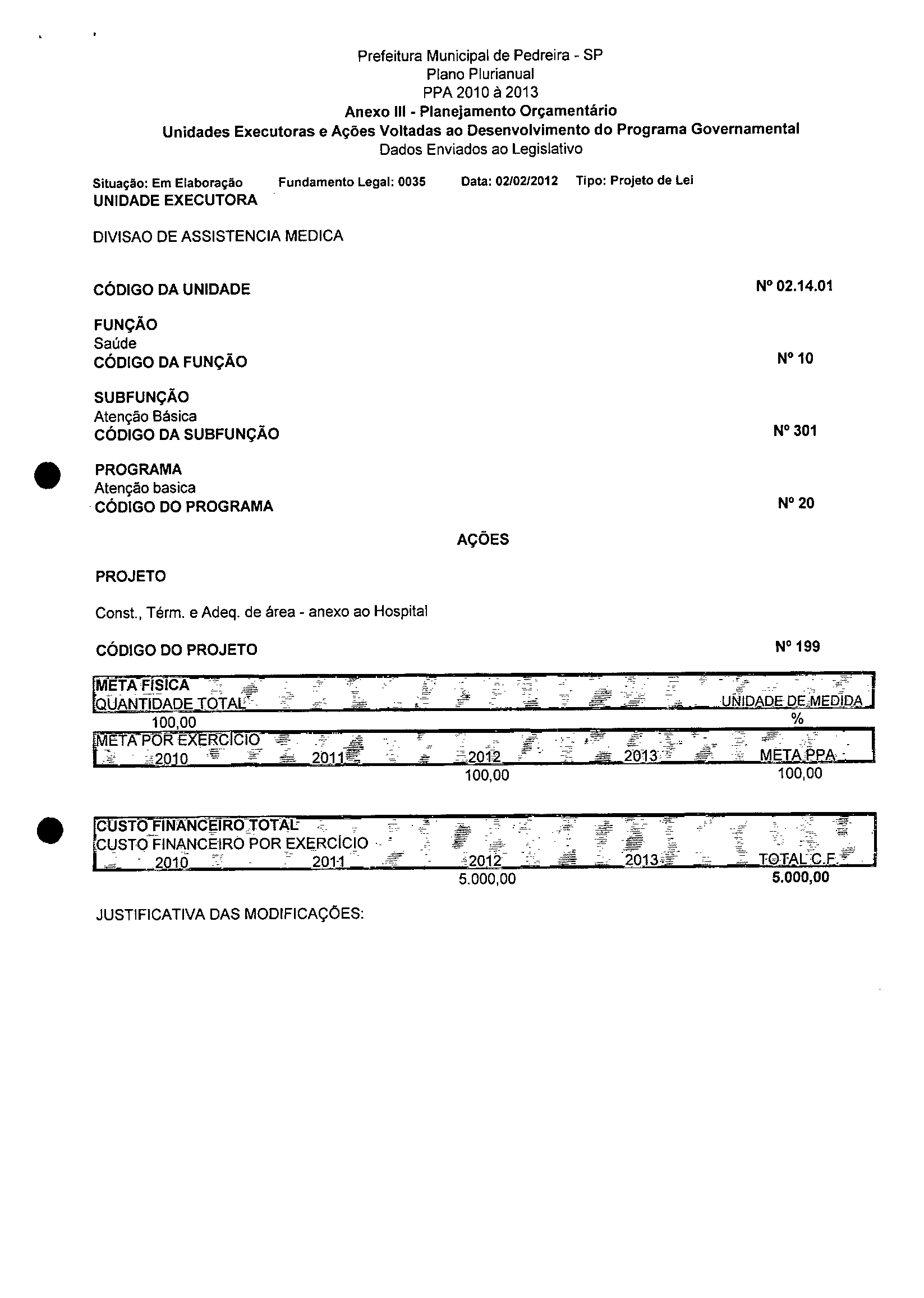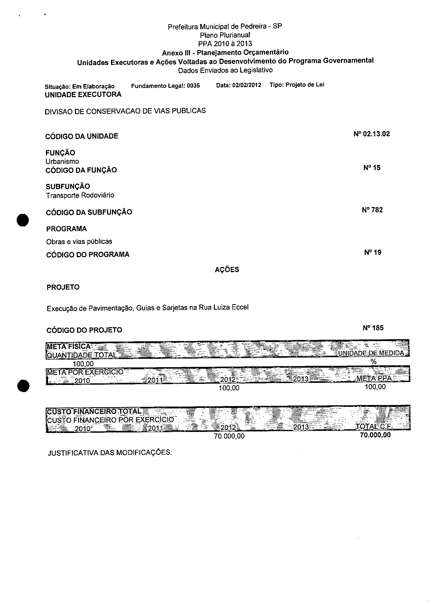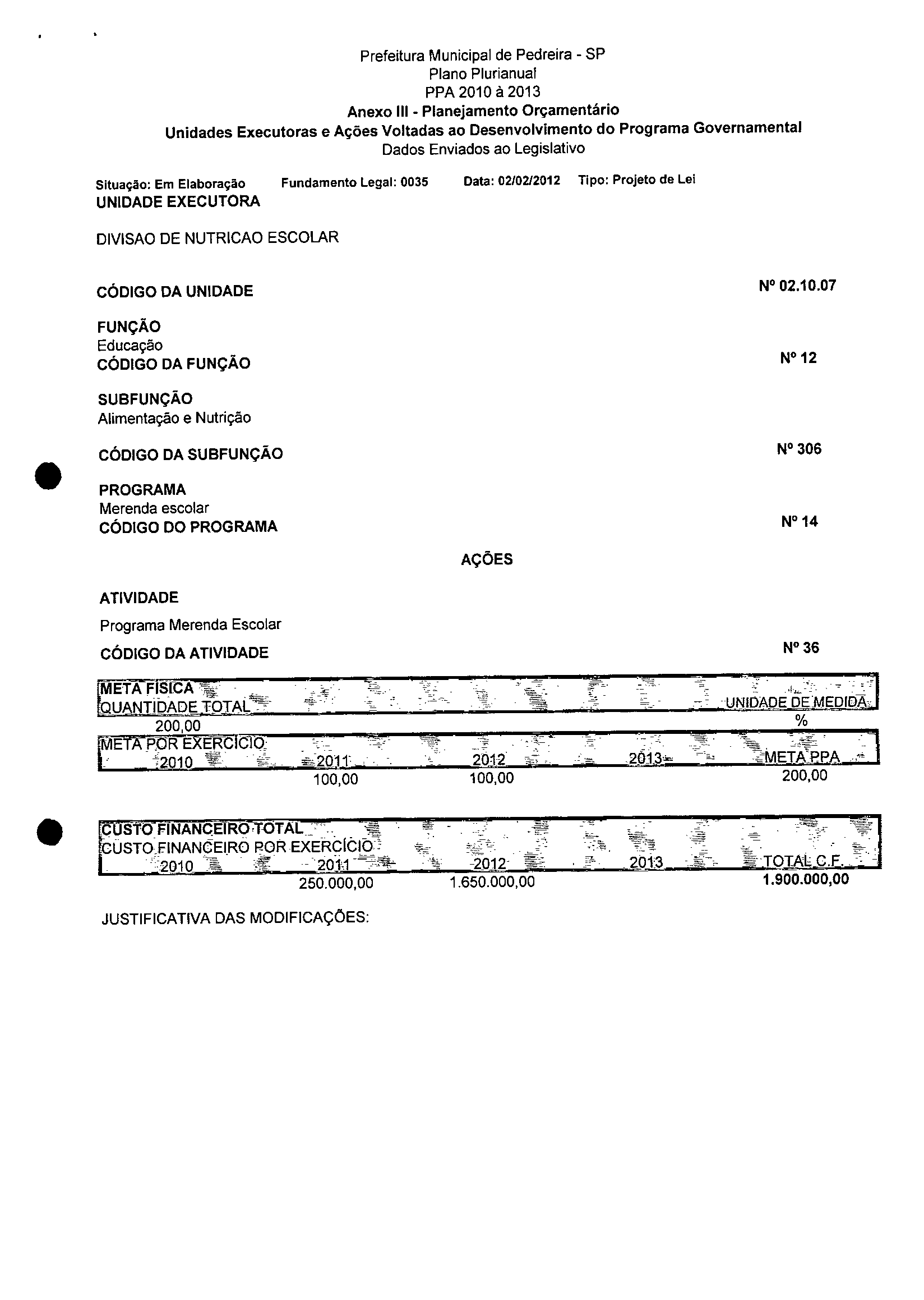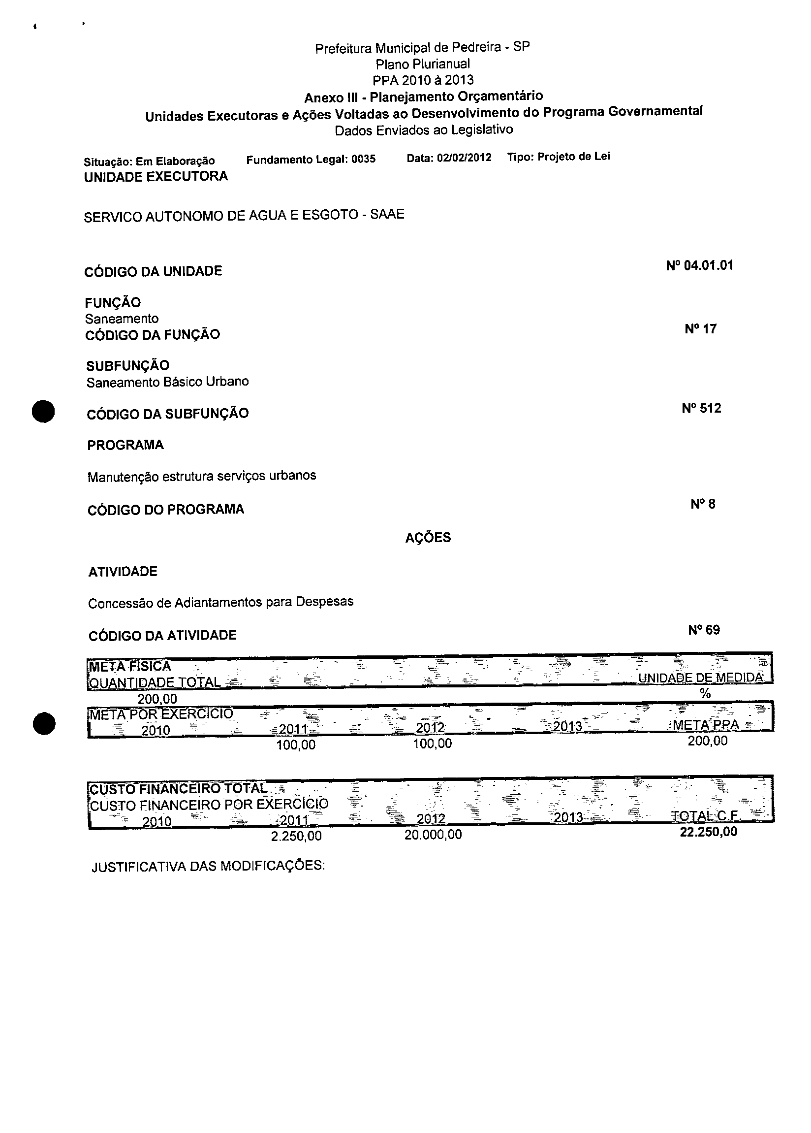 Ementa: Dispõe sobre a alteração dos anexos 1II e III -da Lei nº 2,977, de 5 de novembro de 2009 -Plano Plurianual para o Quadriênio de 2010/2013 e a alteração dos anexos Ve VI -da Lei nº 3.138, de 27 de junho de 2011 -Lei de Diretrizes Orçamentárias para o exercício de 2012.