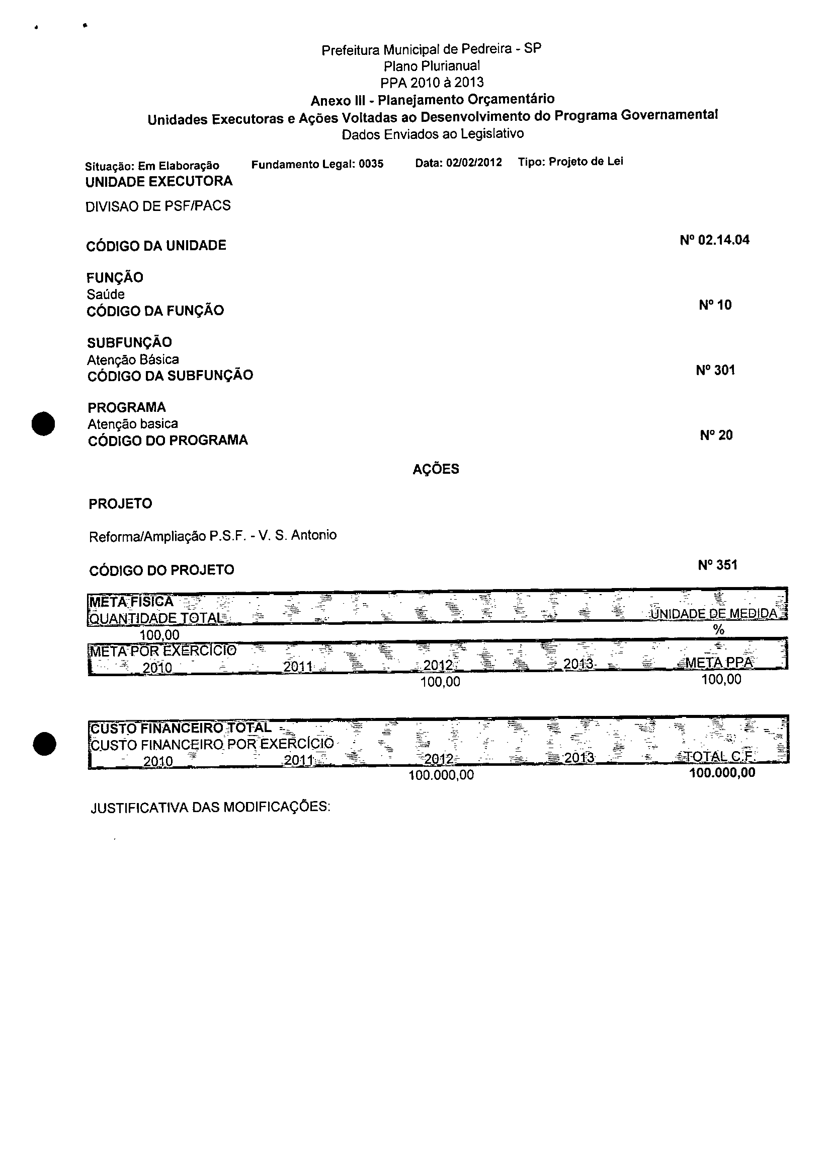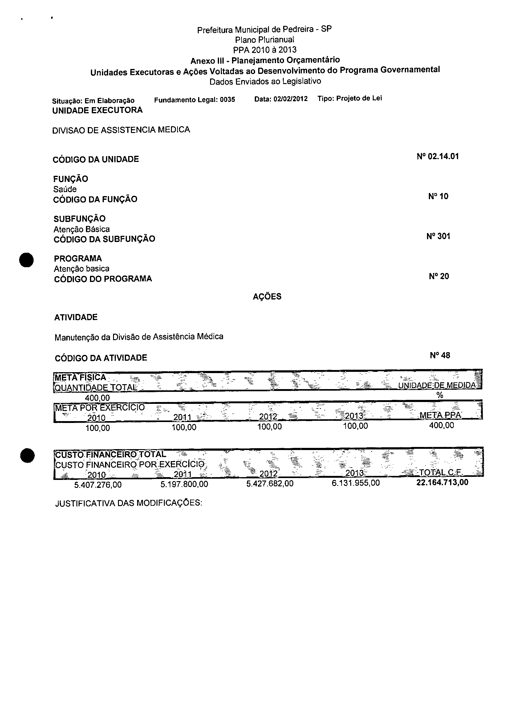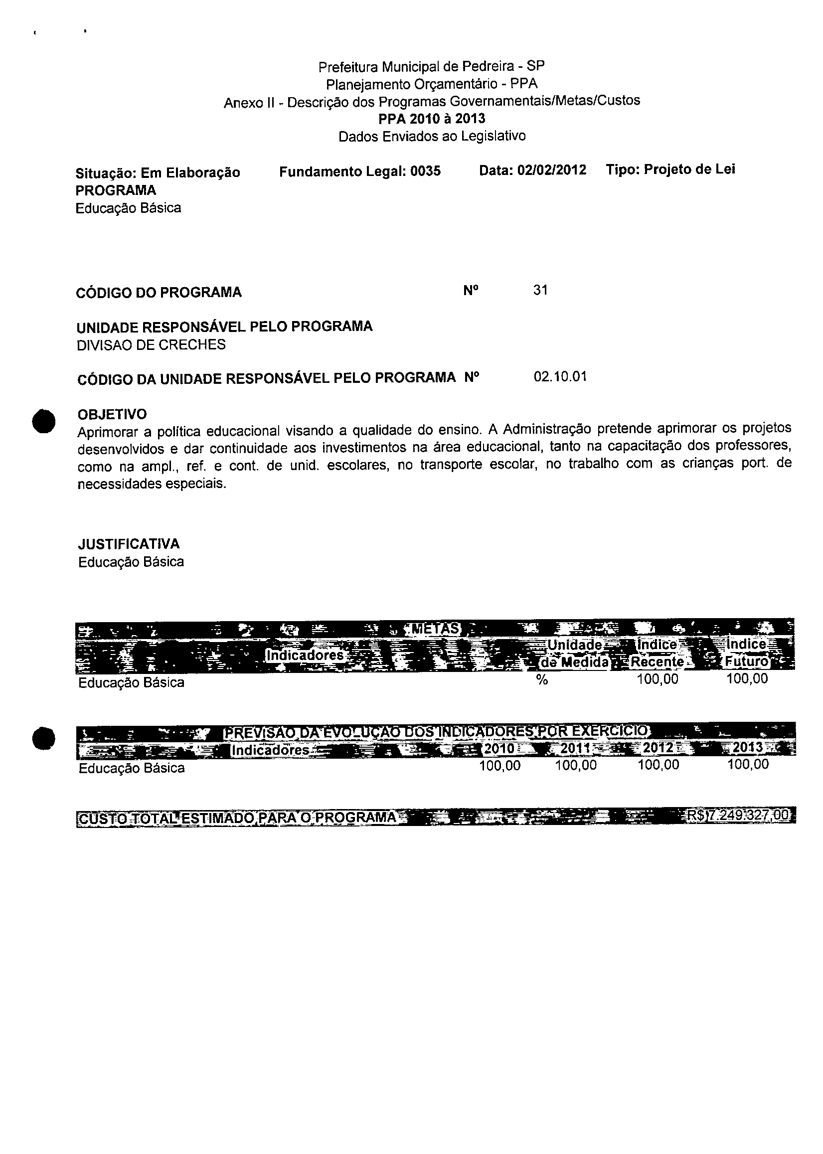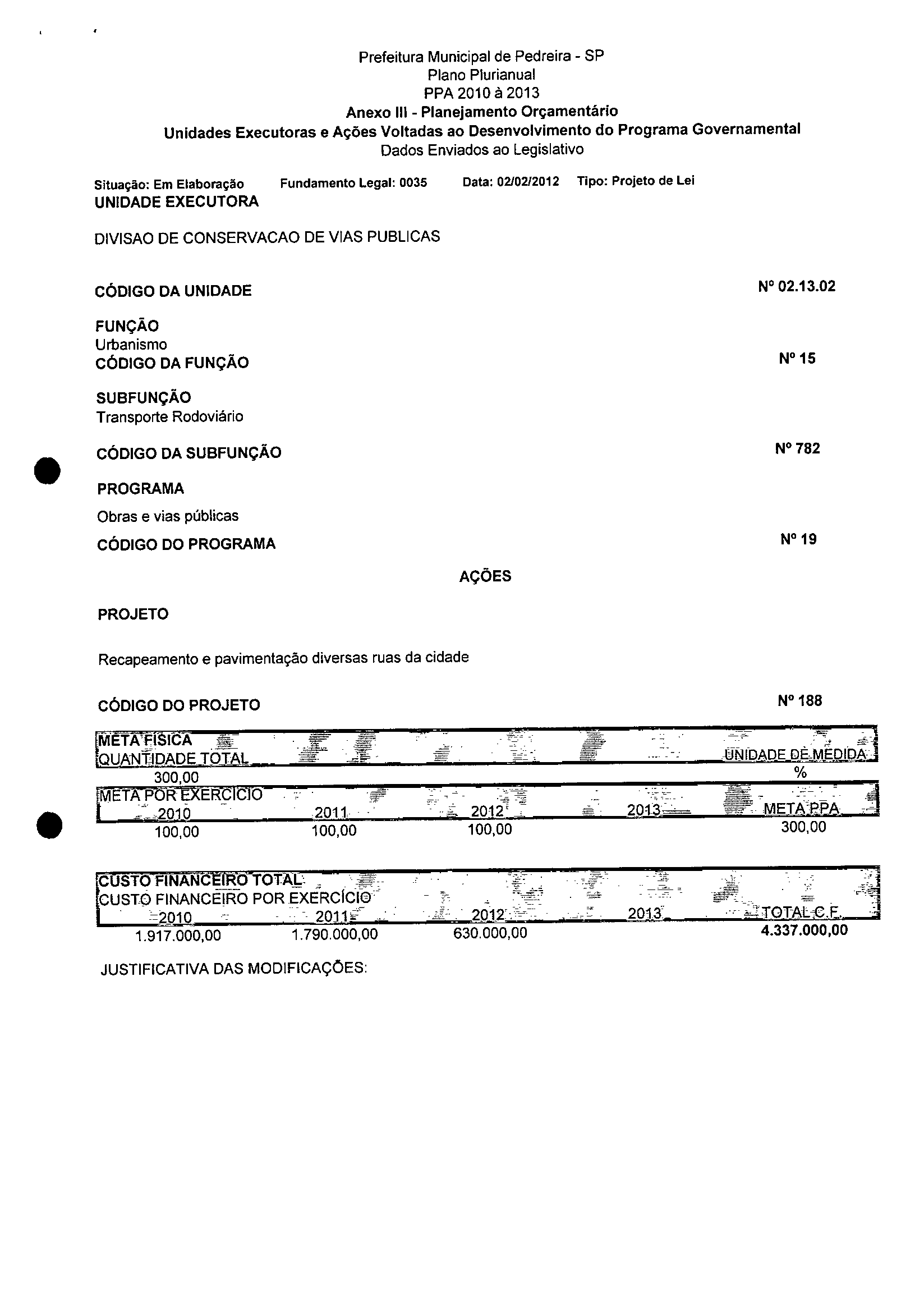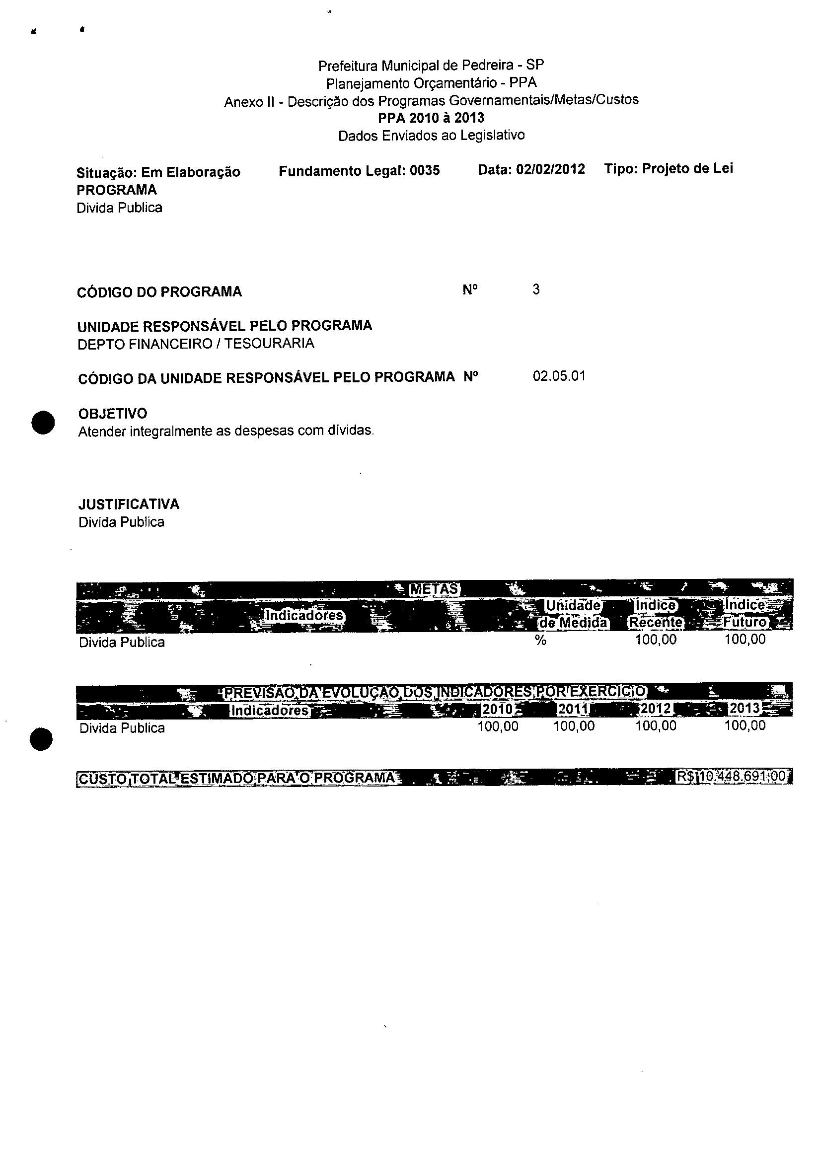 Ementa: Dispõe sobre a alteração dos anexos 1II e III -da Lei nº 2,977, de 5 de novembro de 2009 -Plano Plurianual para o Quadriênio de 2010/2013 e a alteração dos anexos Ve VI -da Lei nº 3.138, de 27 de junho de 2011 -Lei de Diretrizes Orçamentárias para o exercício de 2012.