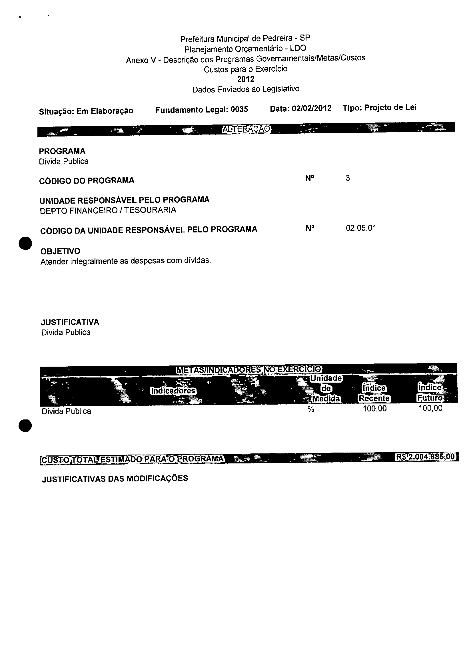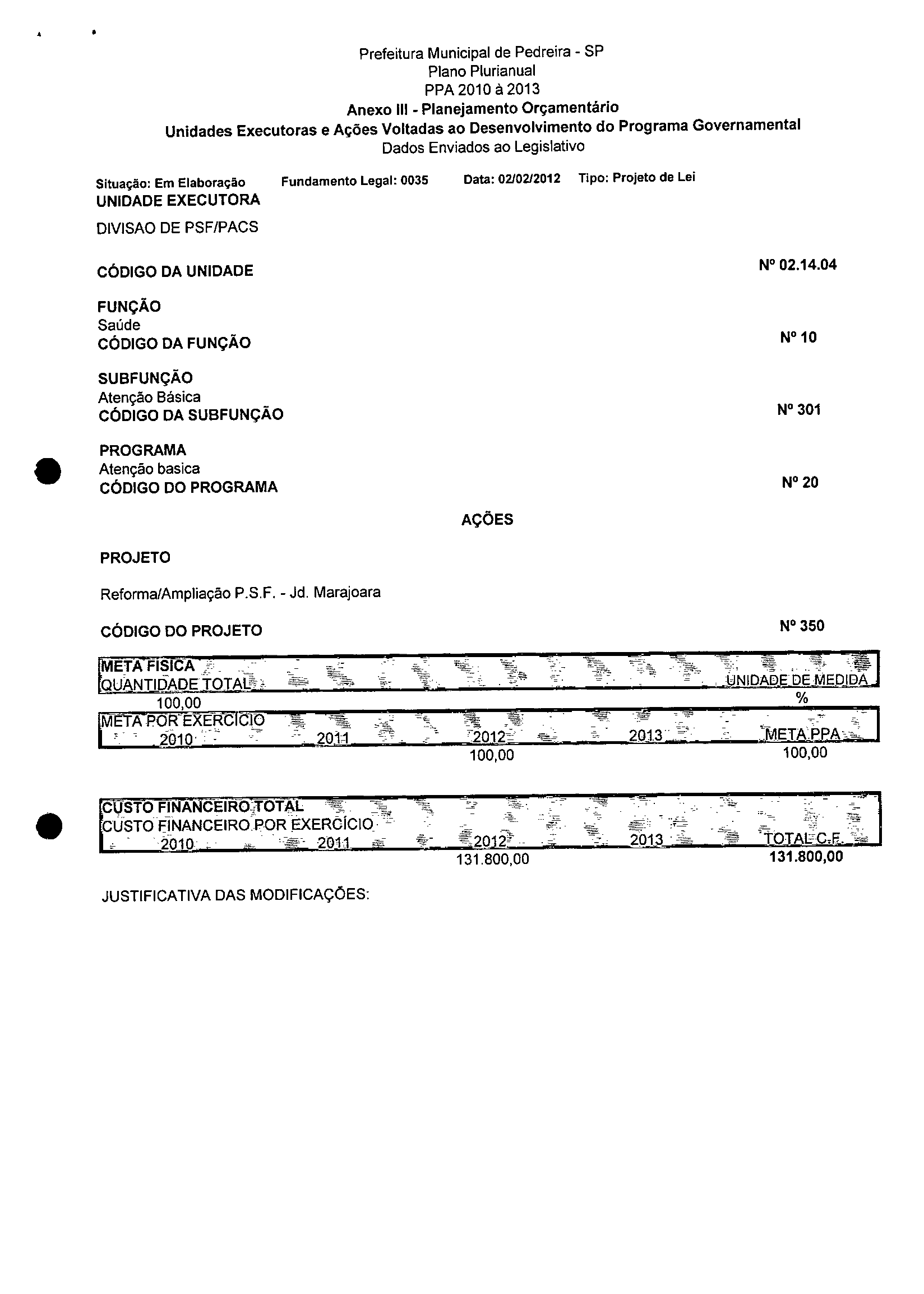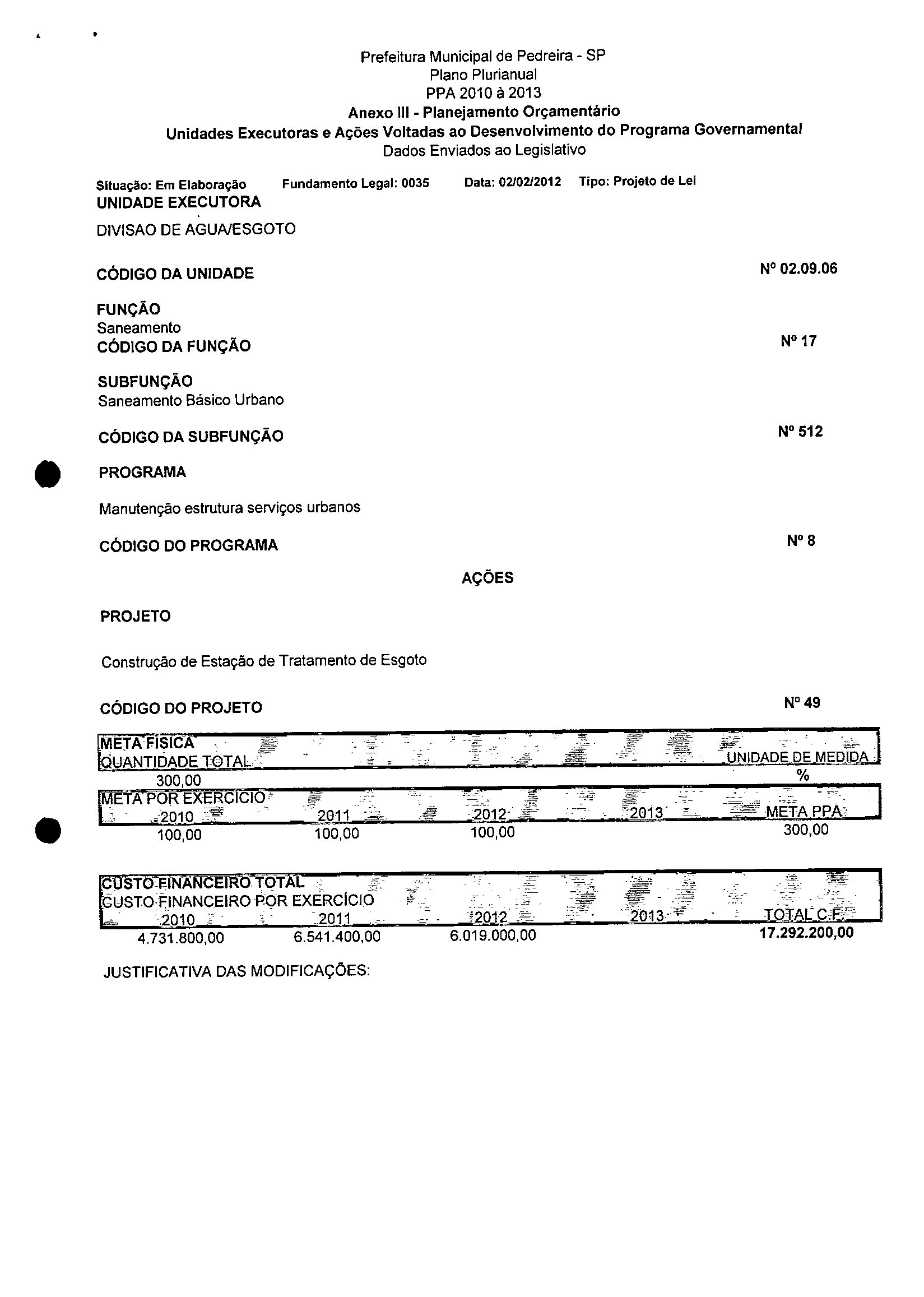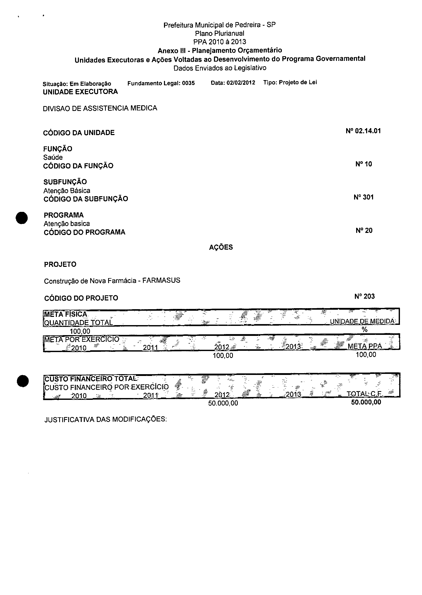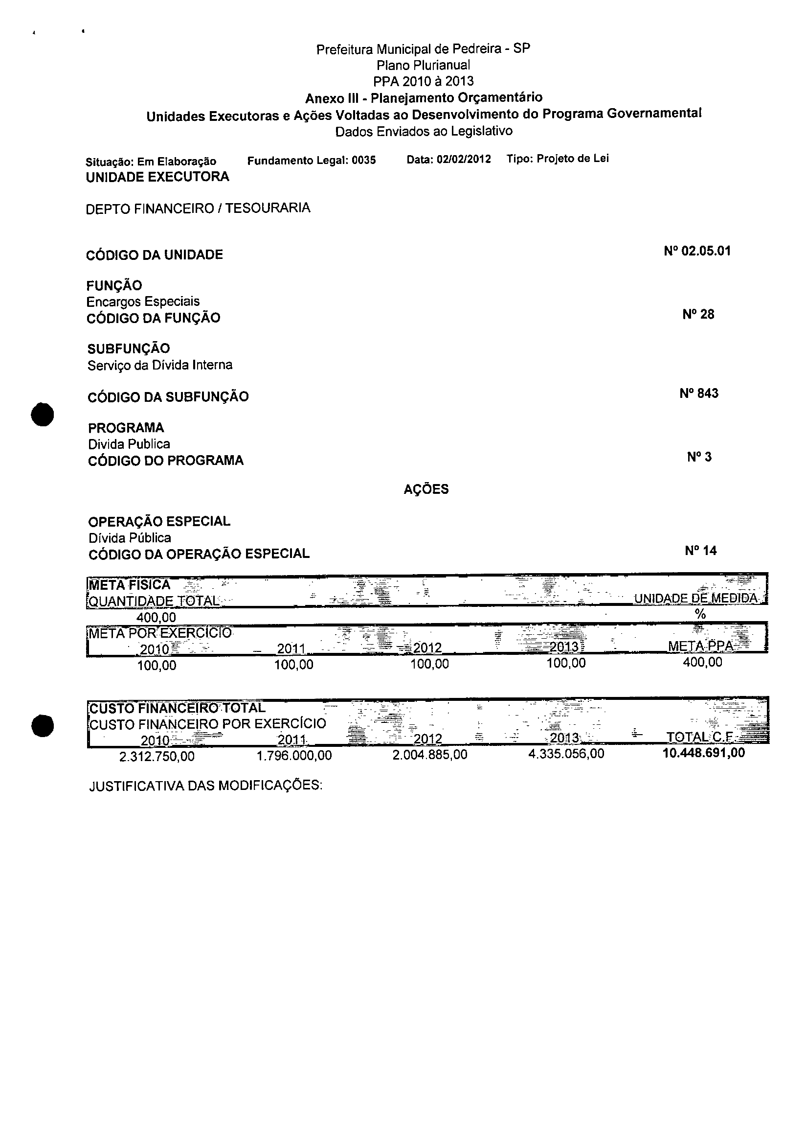 Ementa: Dispõe sobre a alteração dos anexos 1II e III -da Lei nº 2,977, de 5 de novembro de 2009 -Plano Plurianual para o Quadriênio de 2010/2013 e a alteração dos anexos Ve VI -da Lei nº 3.138, de 27 de junho de 2011 -Lei de Diretrizes Orçamentárias para o exercício de 2012.