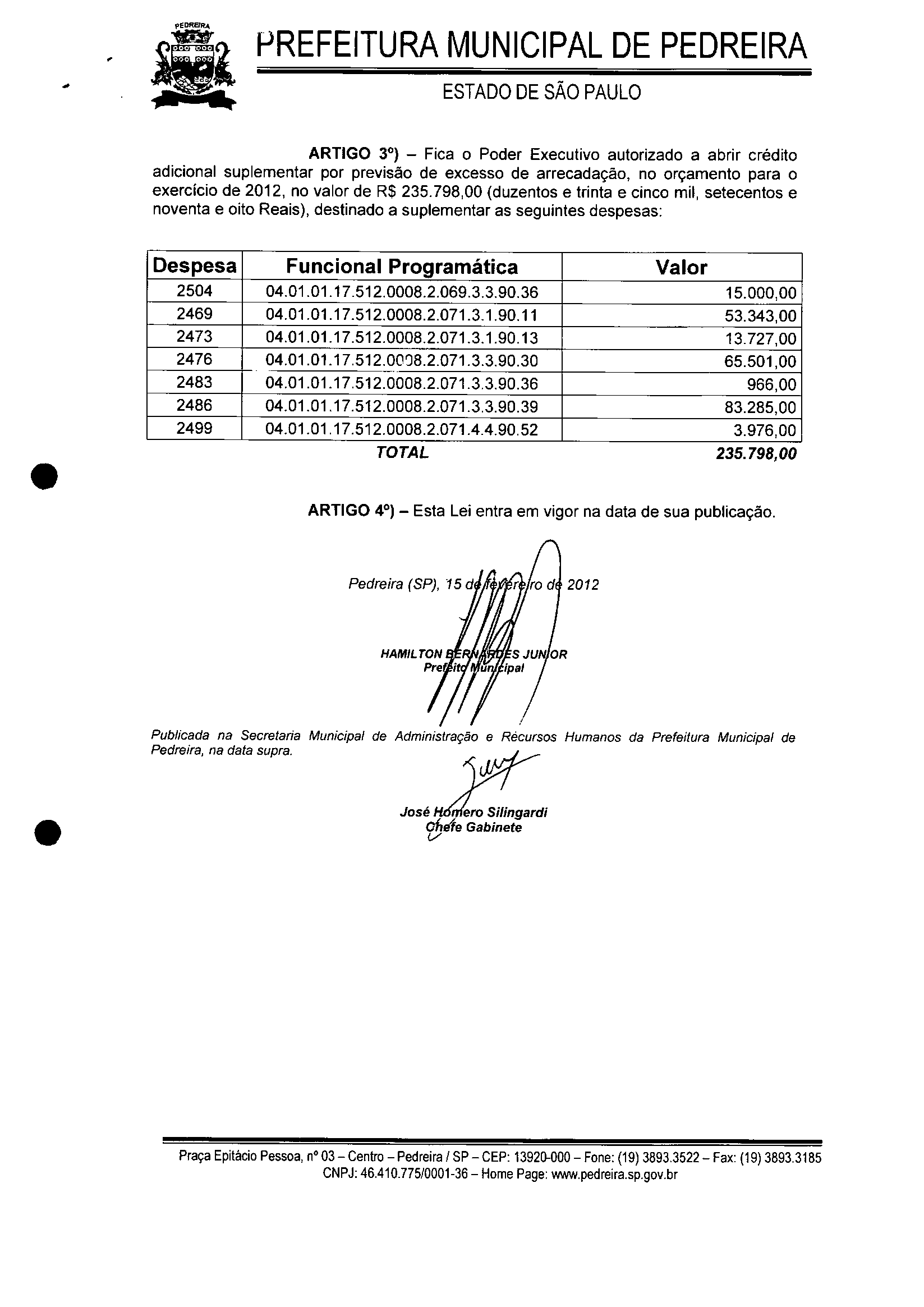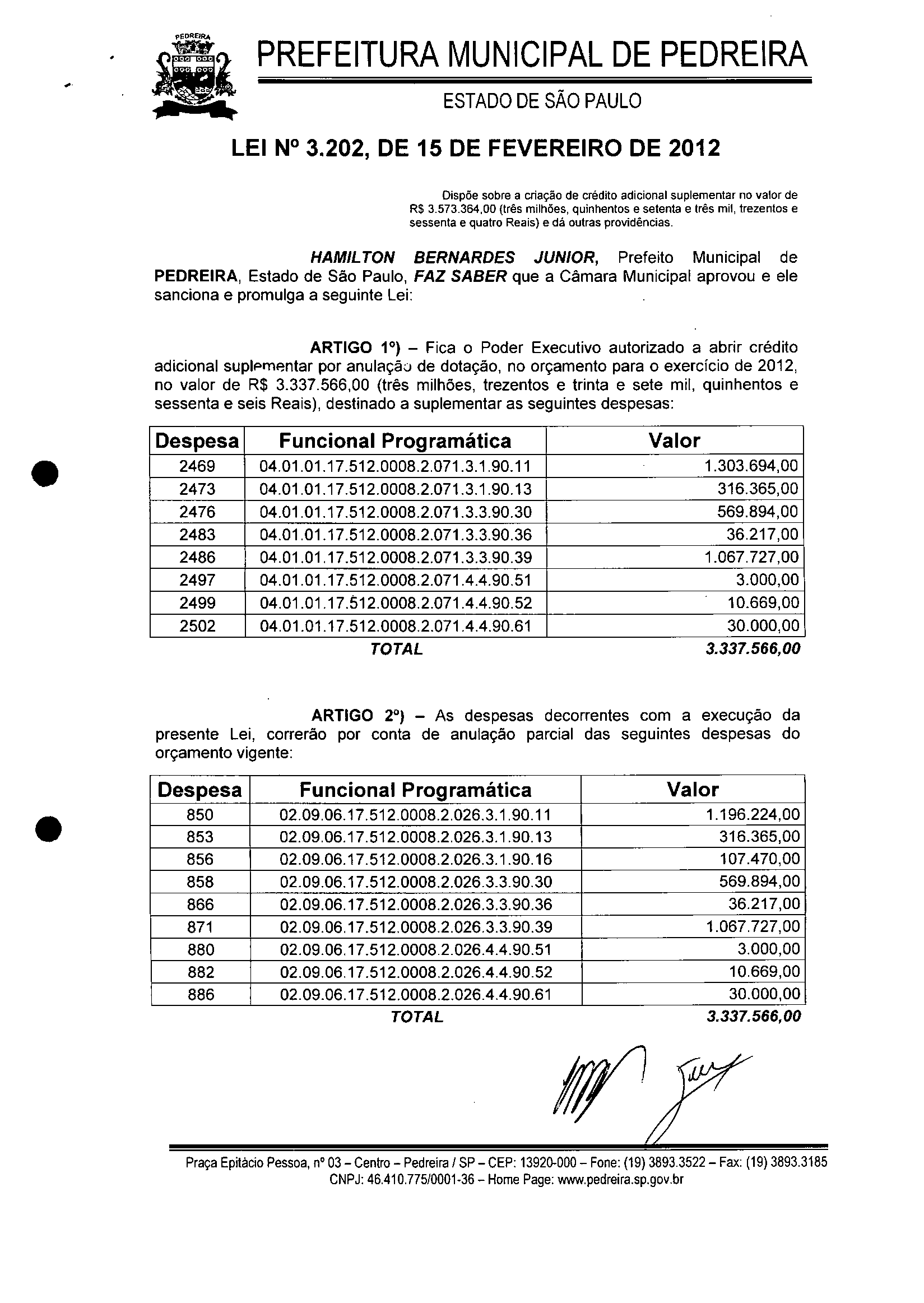 Lei Municipal - N° 3202 de 15/02/2012