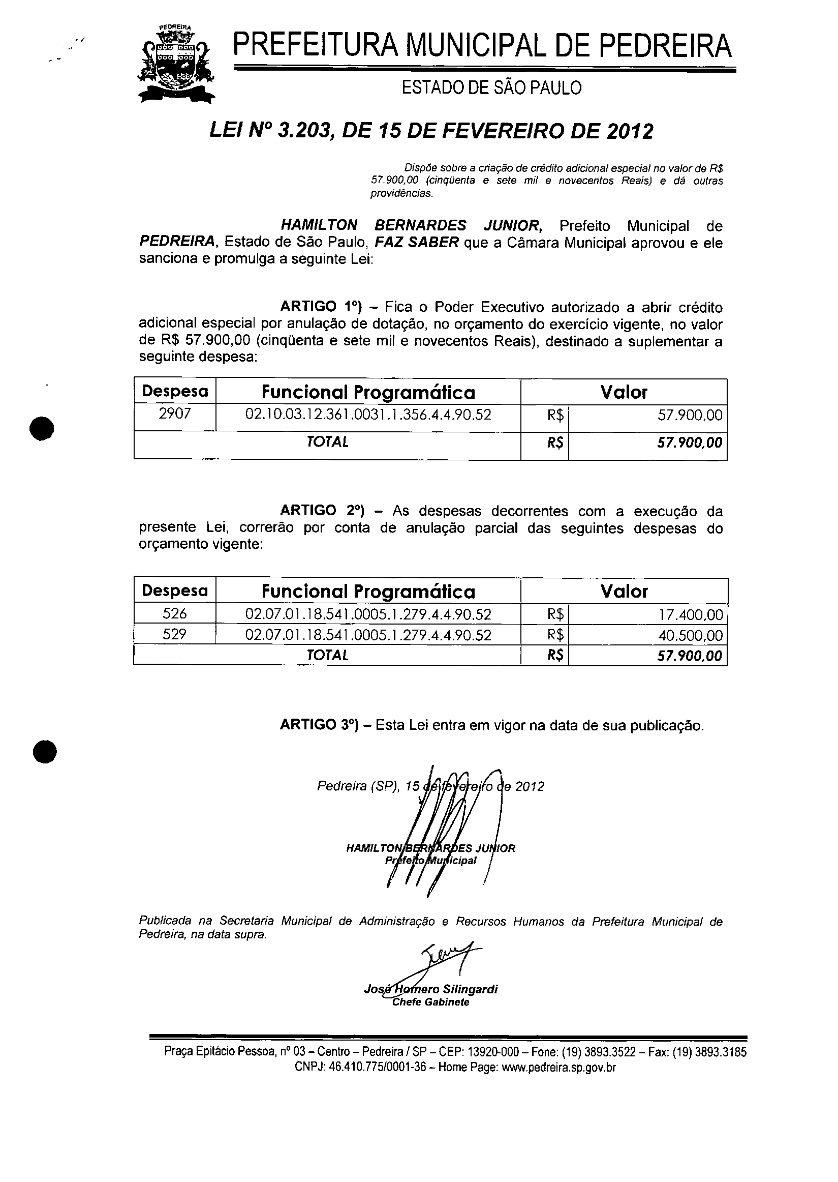Lei Municipal - N° 3203 de 15/02/2012