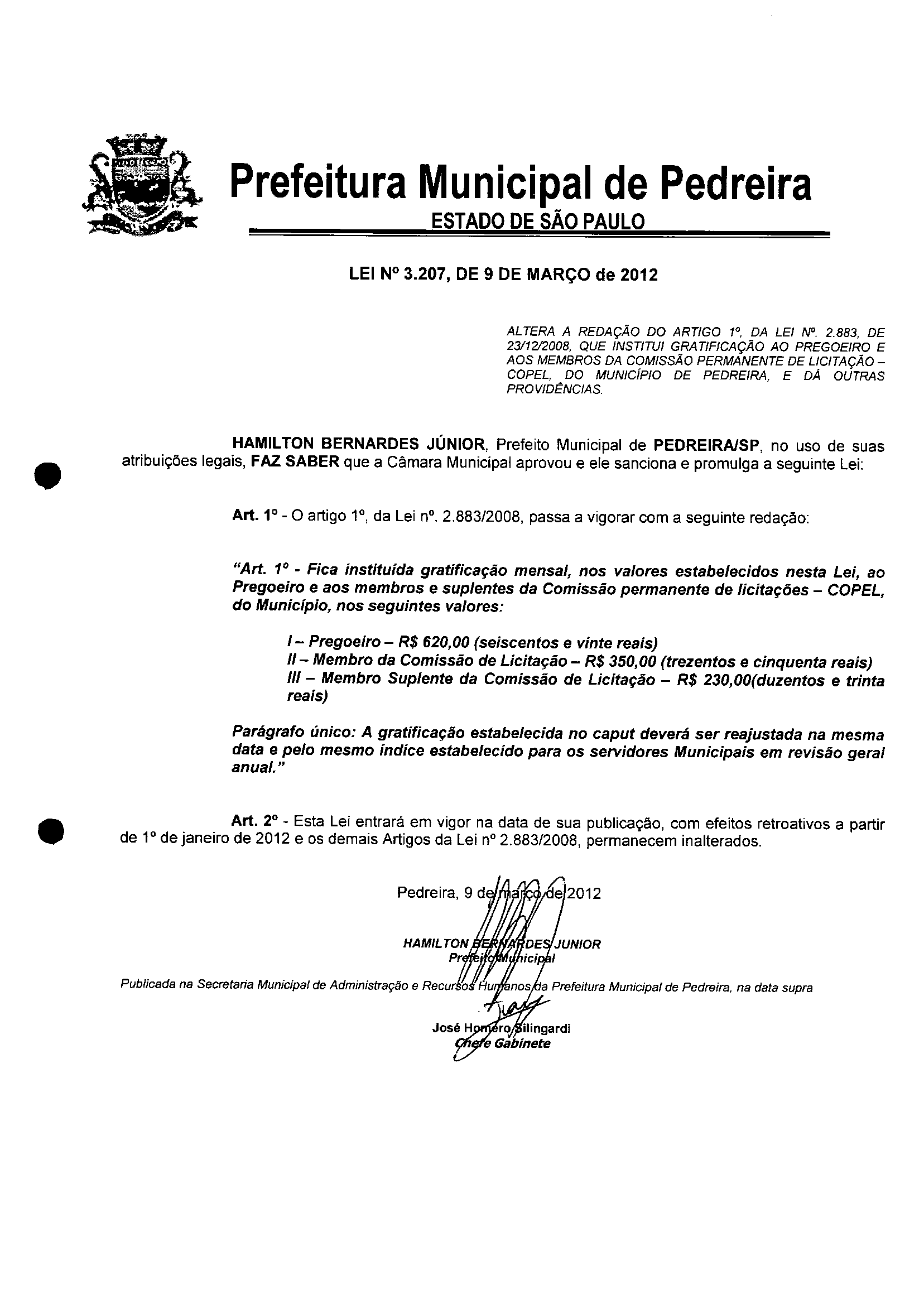 Ementa: AL TERA A REDAÇÃO DO ARTIGO 1º, DA LEI Nº, 2.883, DE 23/12/2008, QUE INSTITUI GRATIFICAÇÃO AO PREGOEIRO E AOS MEMBROS DA COMISSÃO PERMANENTE DE LlCITAÇÃO-COPEL, DO MUNICíPIO DE PEDREIRA, E DÁ OUTRAS PROVIDÊNCIAS.