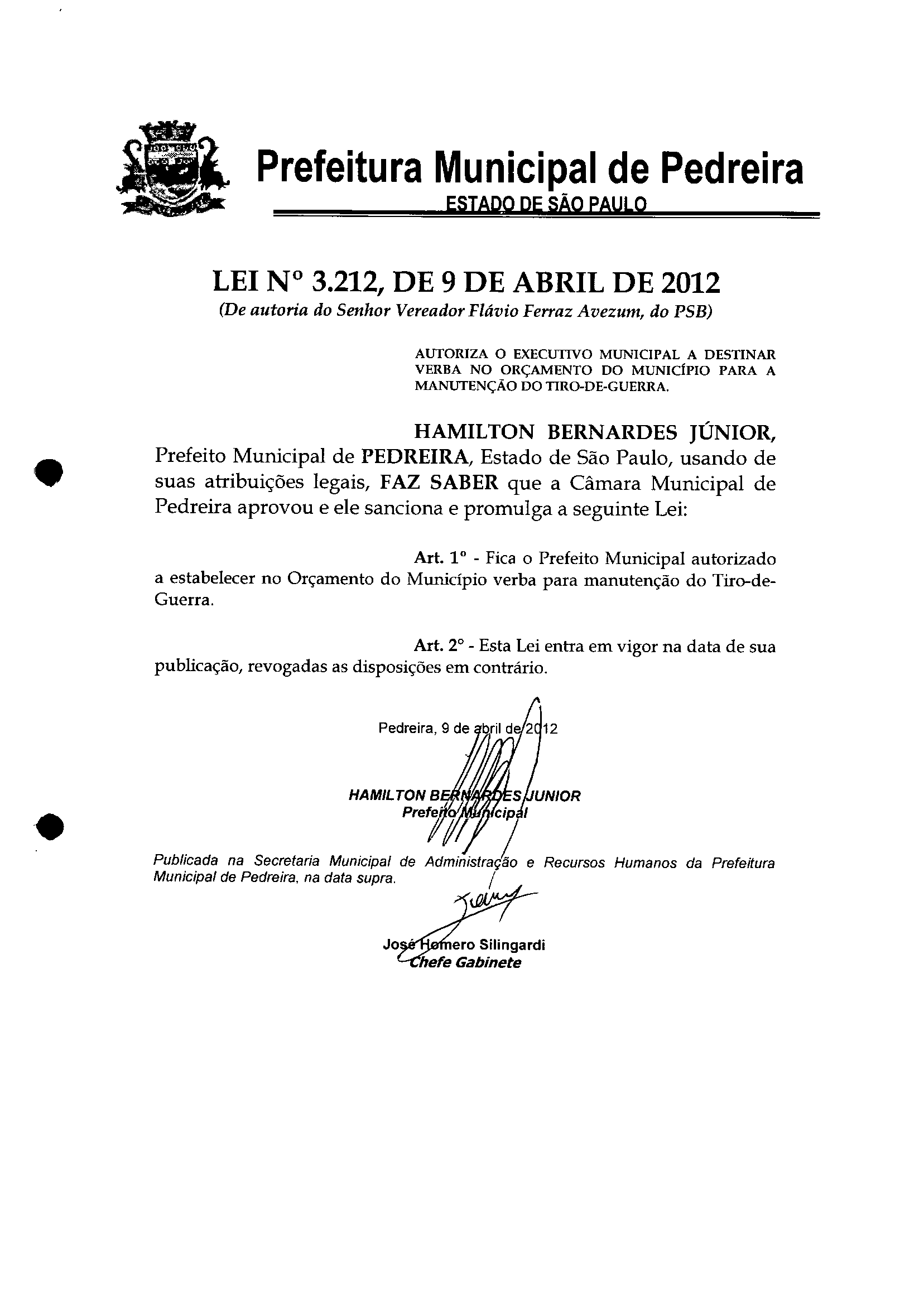 Lei Municipal - N° 3212 de 09/04/2012