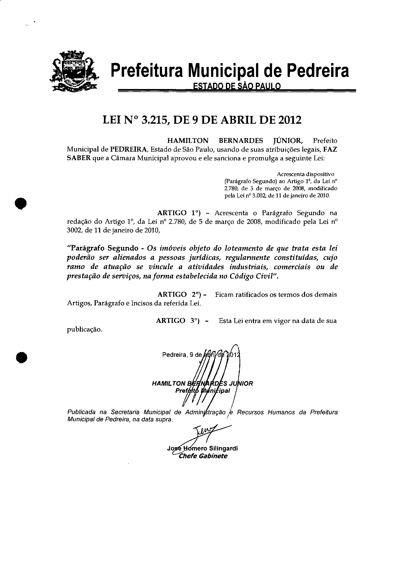 Ementa: Acrescenta dispositivo (parágrafo Segundo) ao Artigo 1°, da Lei nº 2.780, de .5 de março de 2008, modificado pela Lei nº 3.002, de 11 de janeiro de 2010.