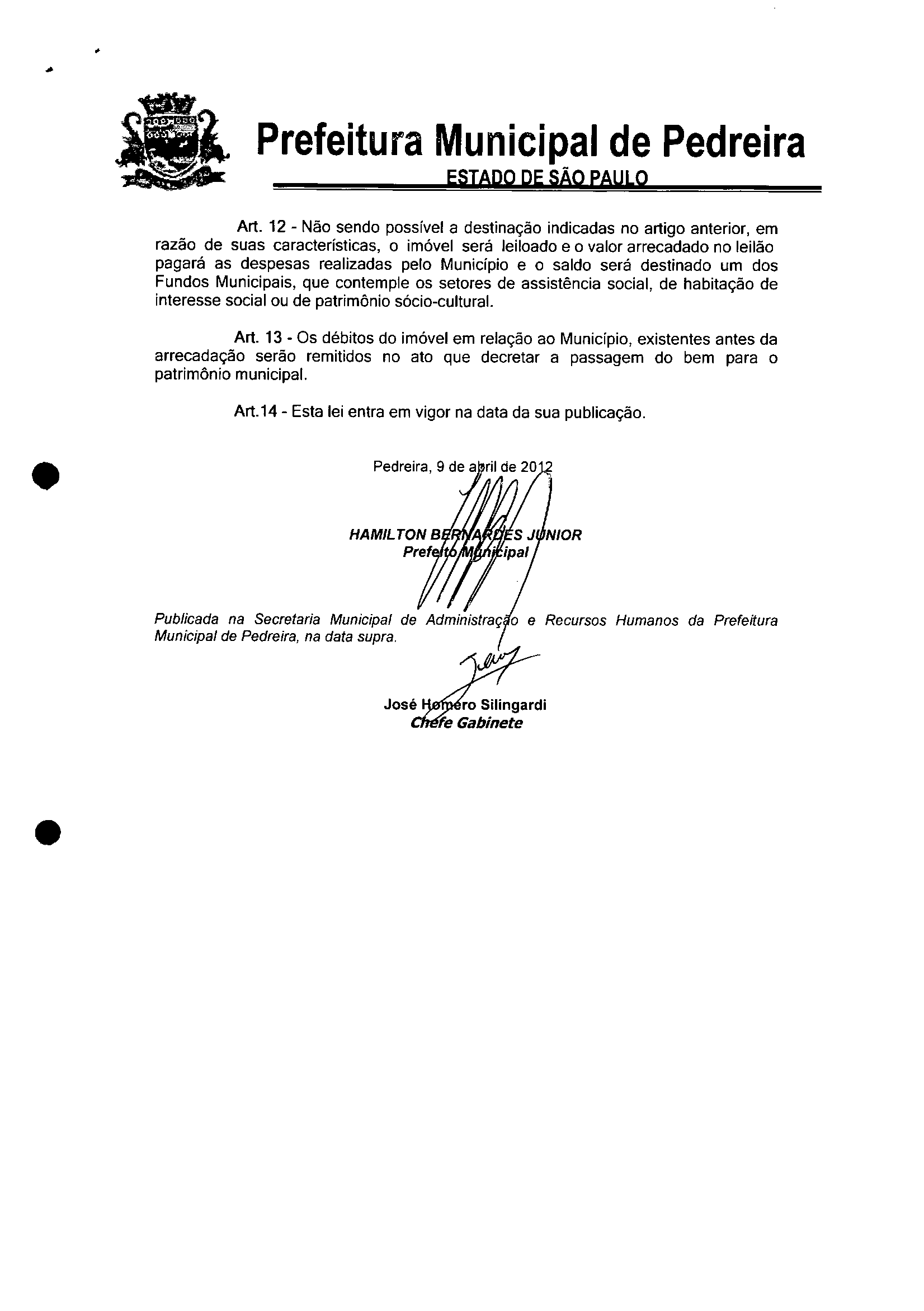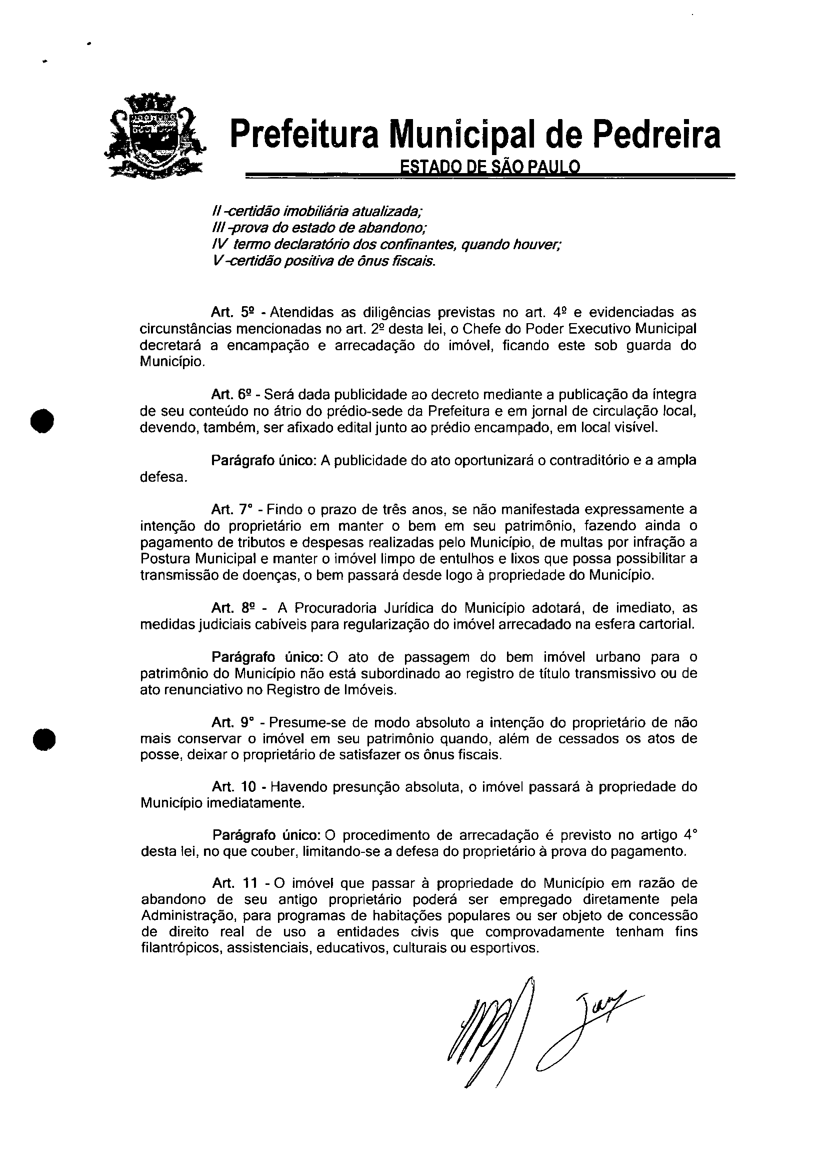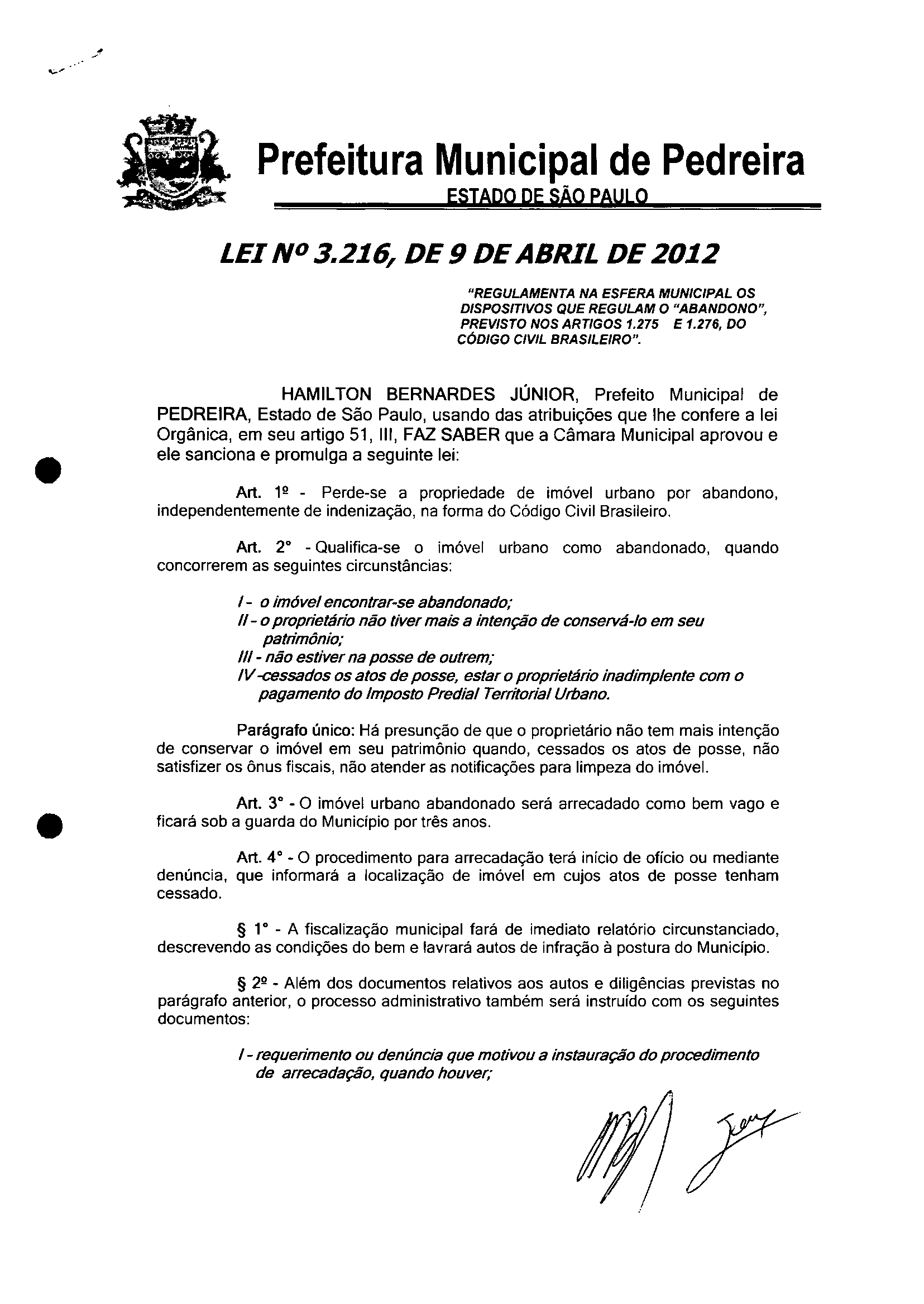 Ementa: "REGULAMENTA NA ESFERA MUNICIPAL OS DISPOSITIVOS QUE REGULAM O "ABANDONO", PREVISTO NOS ARTIGOS 1.275 E 1.276, DO CÓDIGO CIVIL BRASILEIRO".