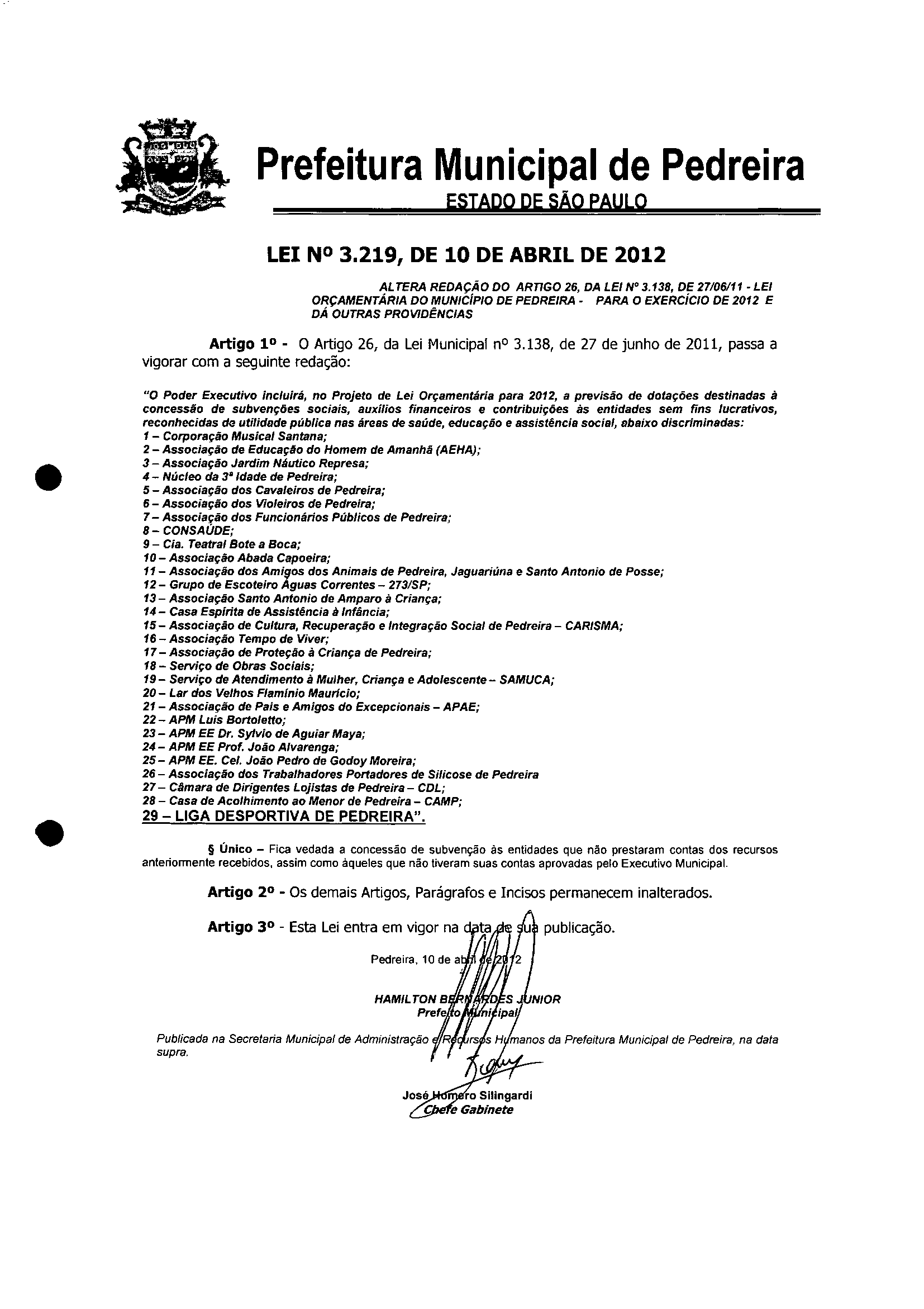 Ementa: AL TERA REDAÇÃO DO ARTIGO 26, DA LEI N° 3,138, DE 27/06111 -LEI ORÇAMENTARIA DO MUNICíPIO DE PEDREIRA - PARA O EXERCíCIO DE 2012 E DA OUTRAS PROVIDÊNCIAS
