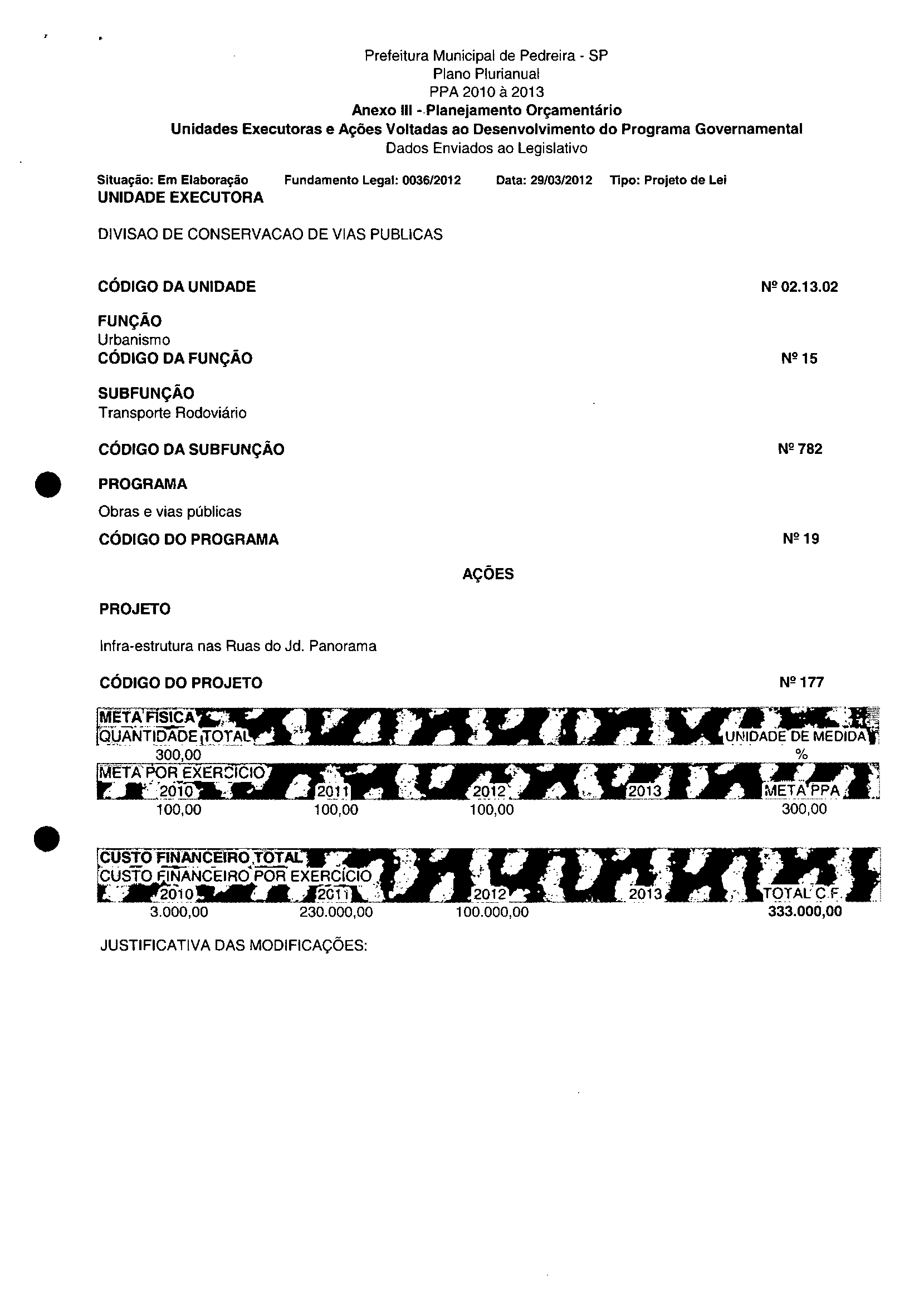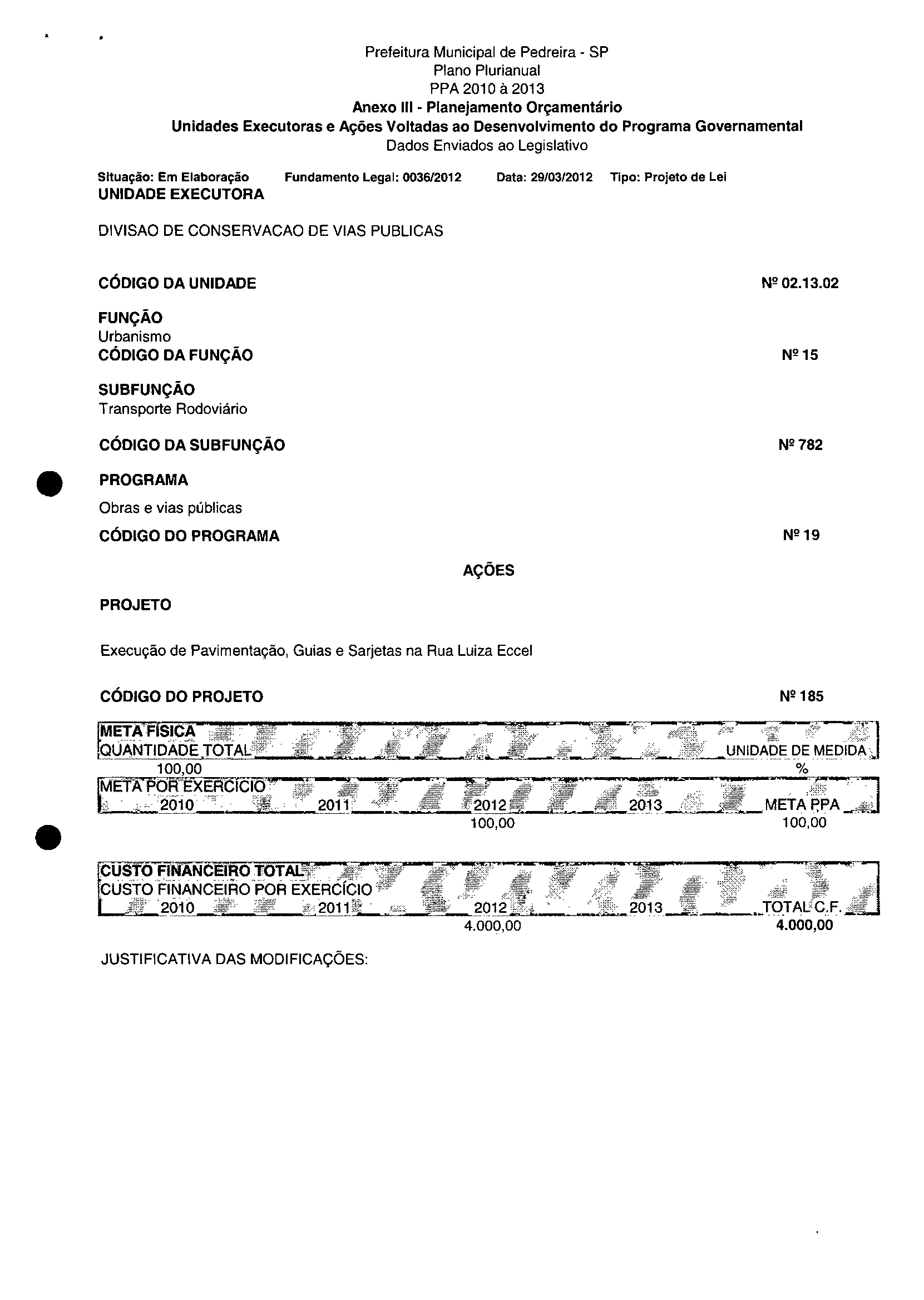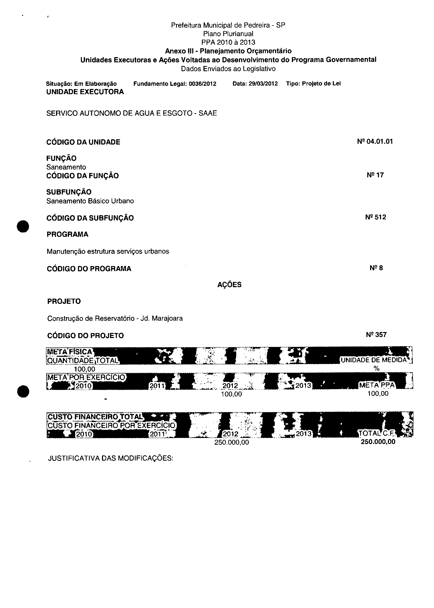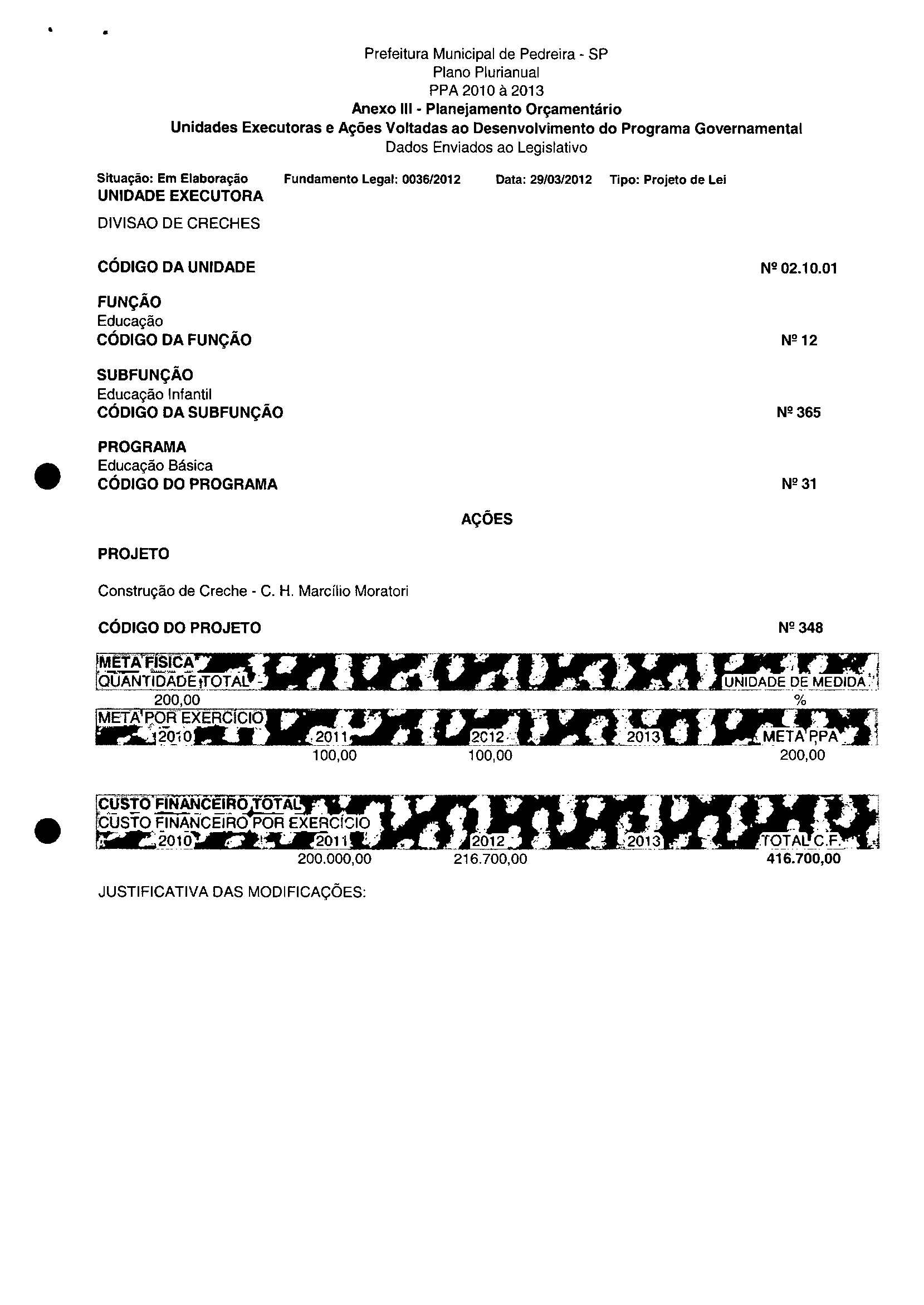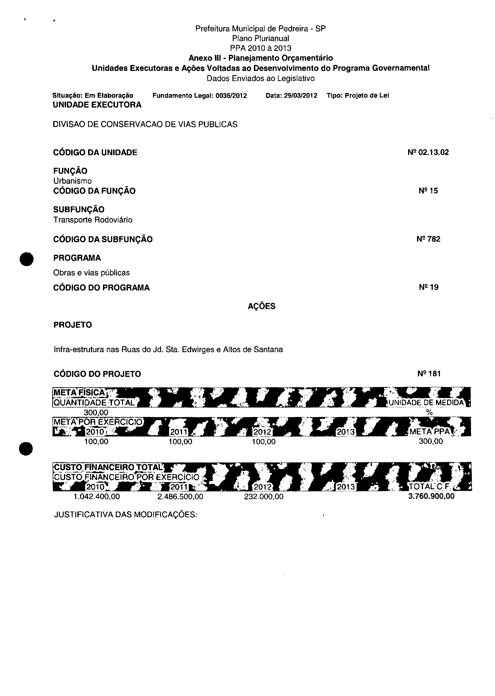 Ementa: Dispõe sobre a alteração dos anexos II e III -da Lei nº 2.977, de 5 de novembro de 2009 -Plano Plurianual para o Quadriénio de 2010/2013 e a alteração dos anexos Ve VI-da Lei nº 3,138, de 27 de junho de 2011 -Lei de Diretrizes Orçamentárias para o exercício de 2012.