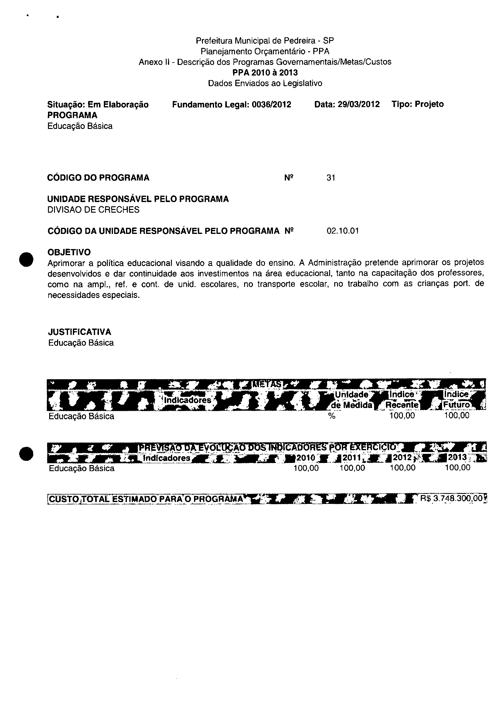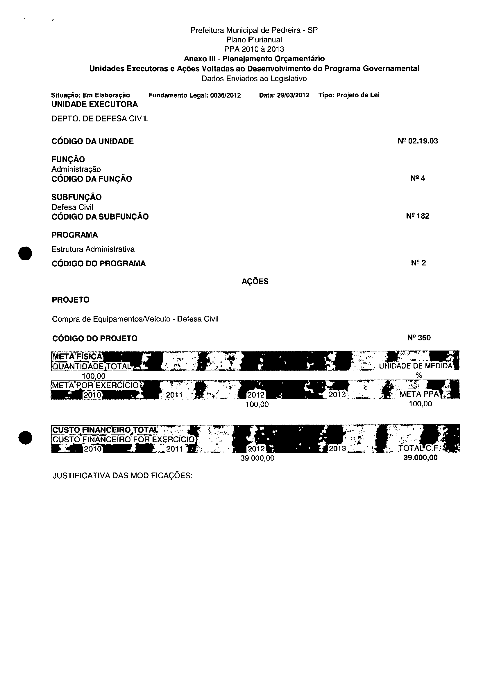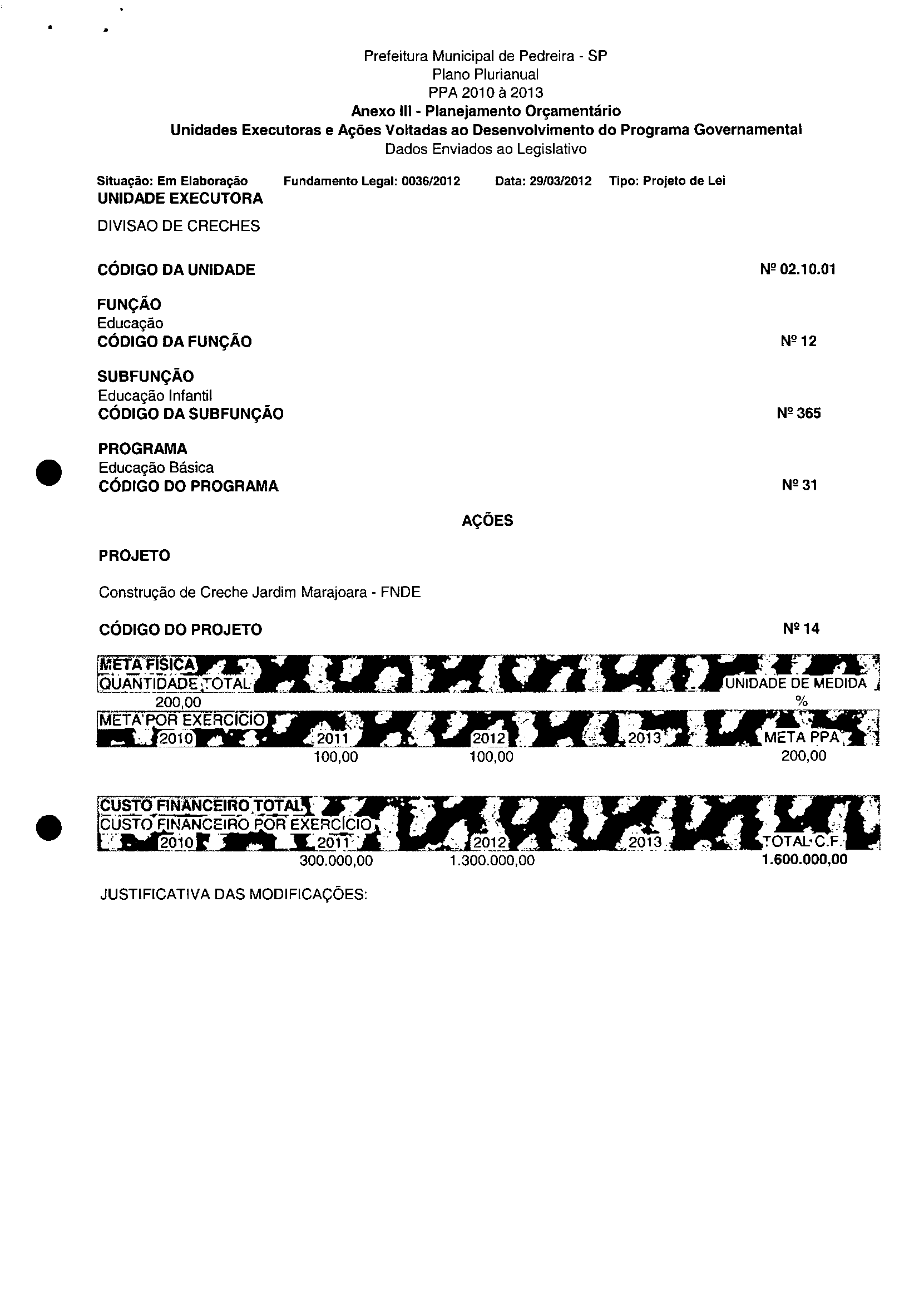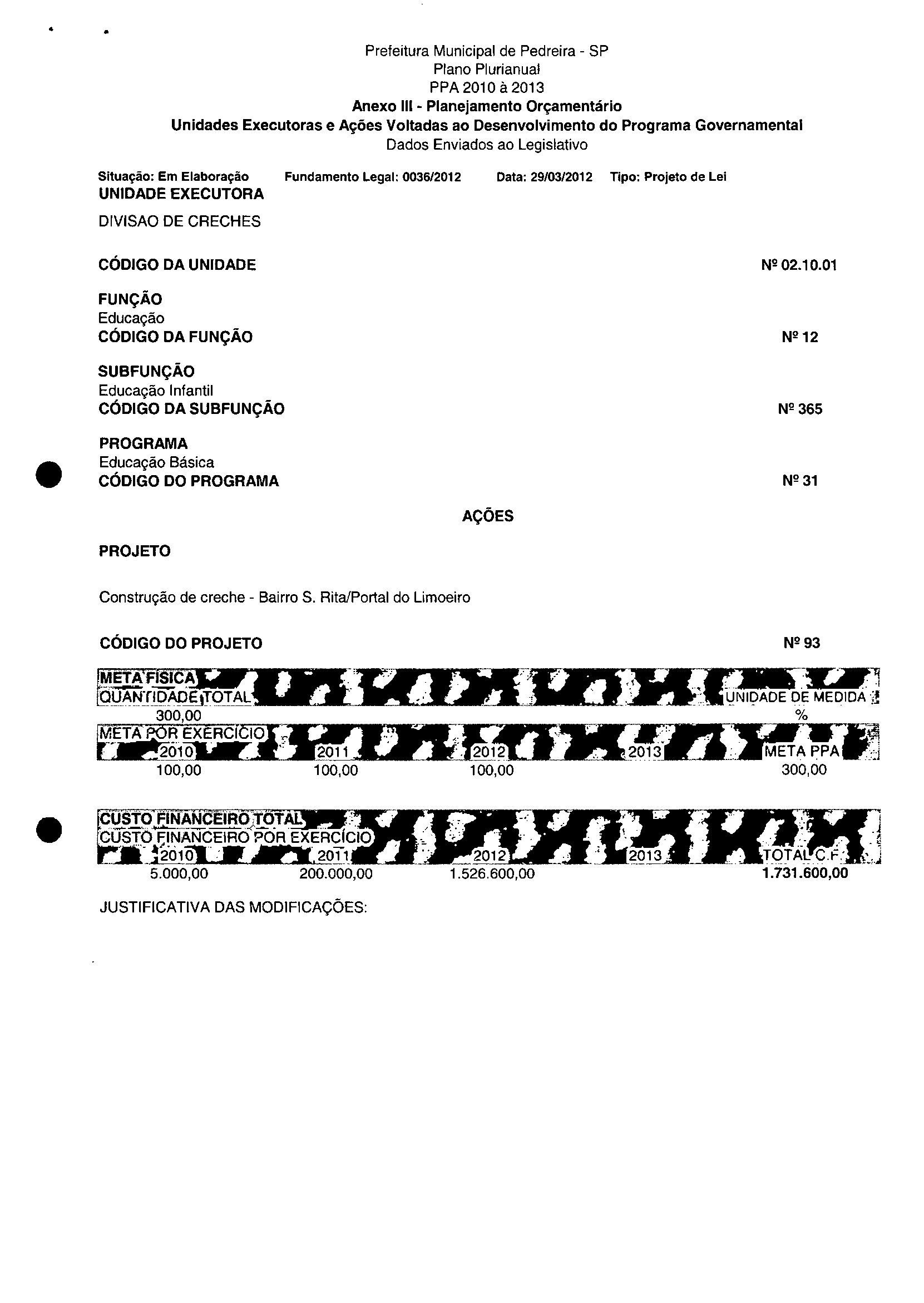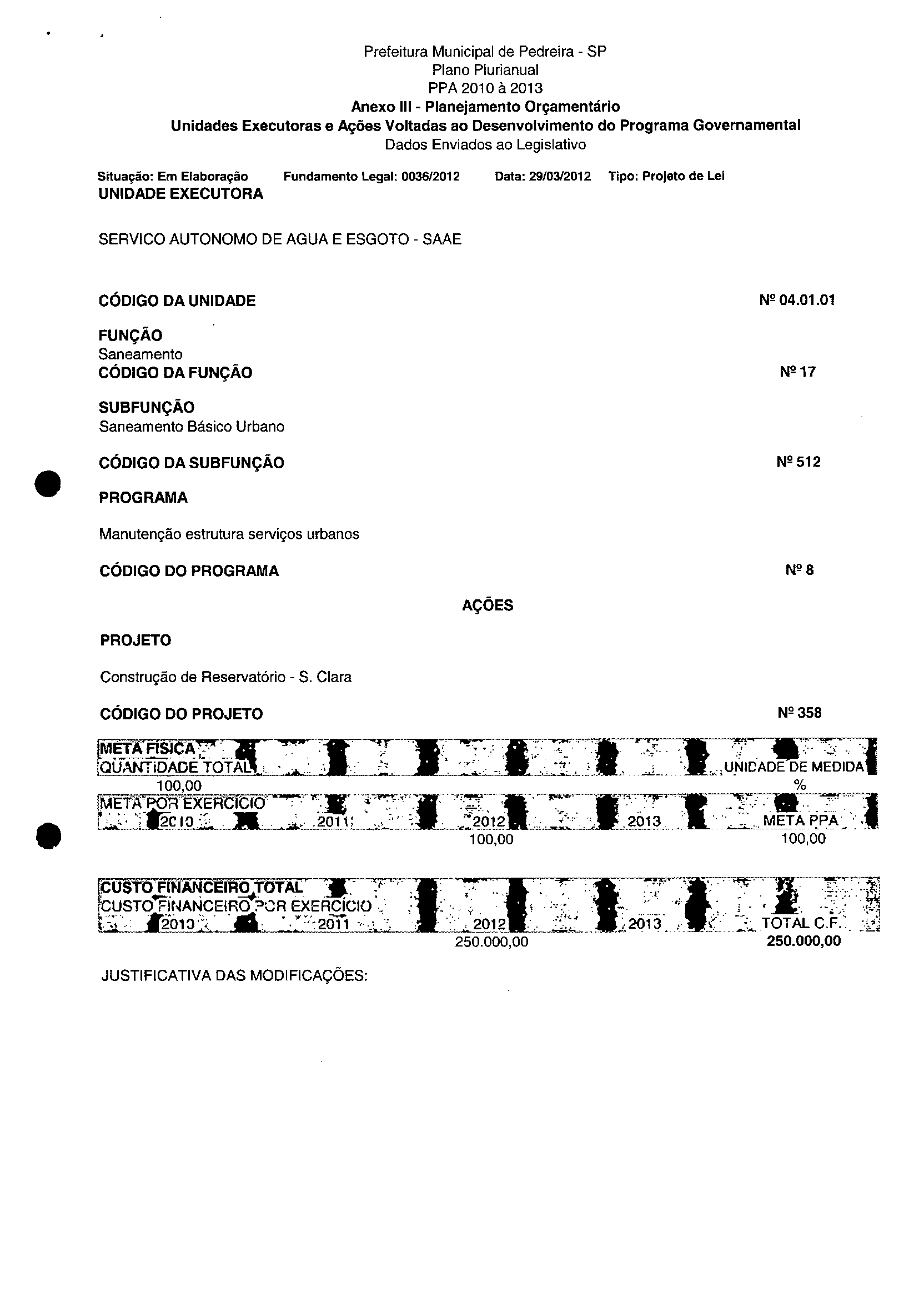 Ementa: Dispõe sobre a alteração dos anexos II e III -da Lei nº 2.977, de 5 de novembro de 2009 -Plano Plurianual para o Quadriénio de 2010/2013 e a alteração dos anexos Ve VI-da Lei nº 3,138, de 27 de junho de 2011 -Lei de Diretrizes Orçamentárias para o exercício de 2012.