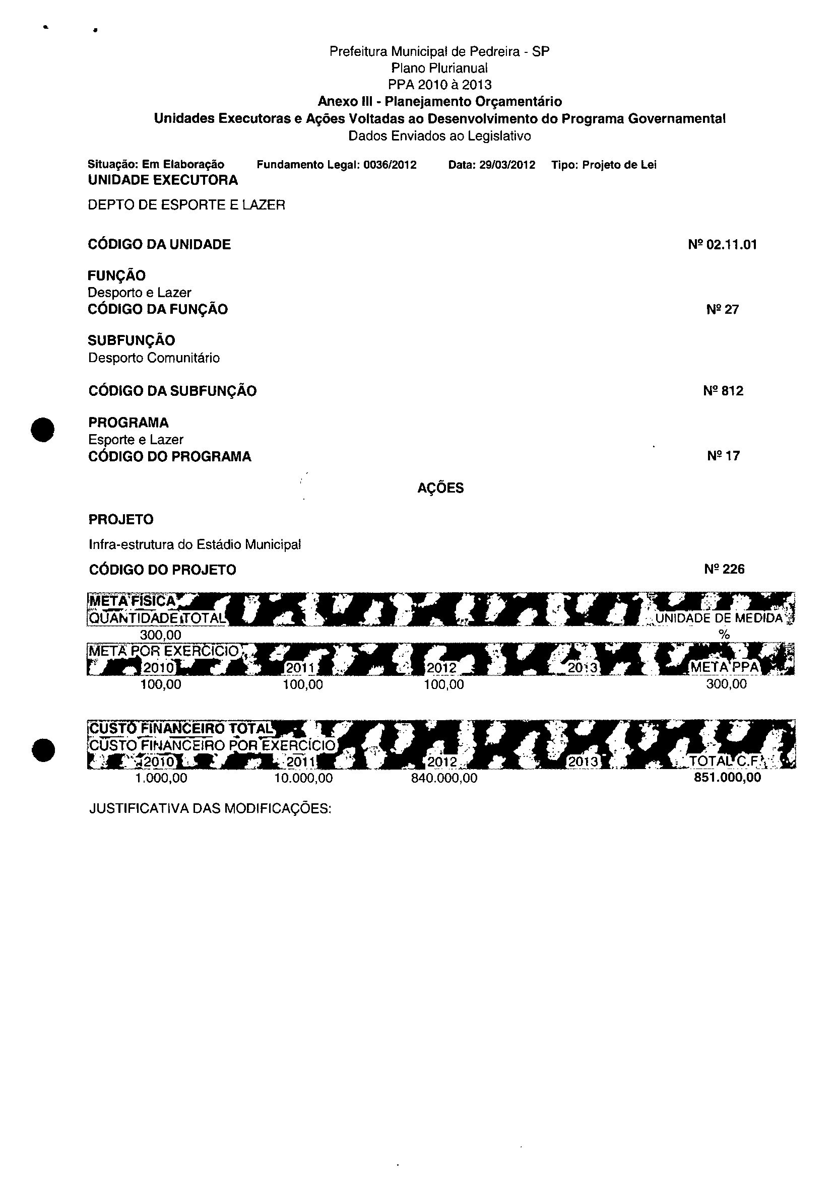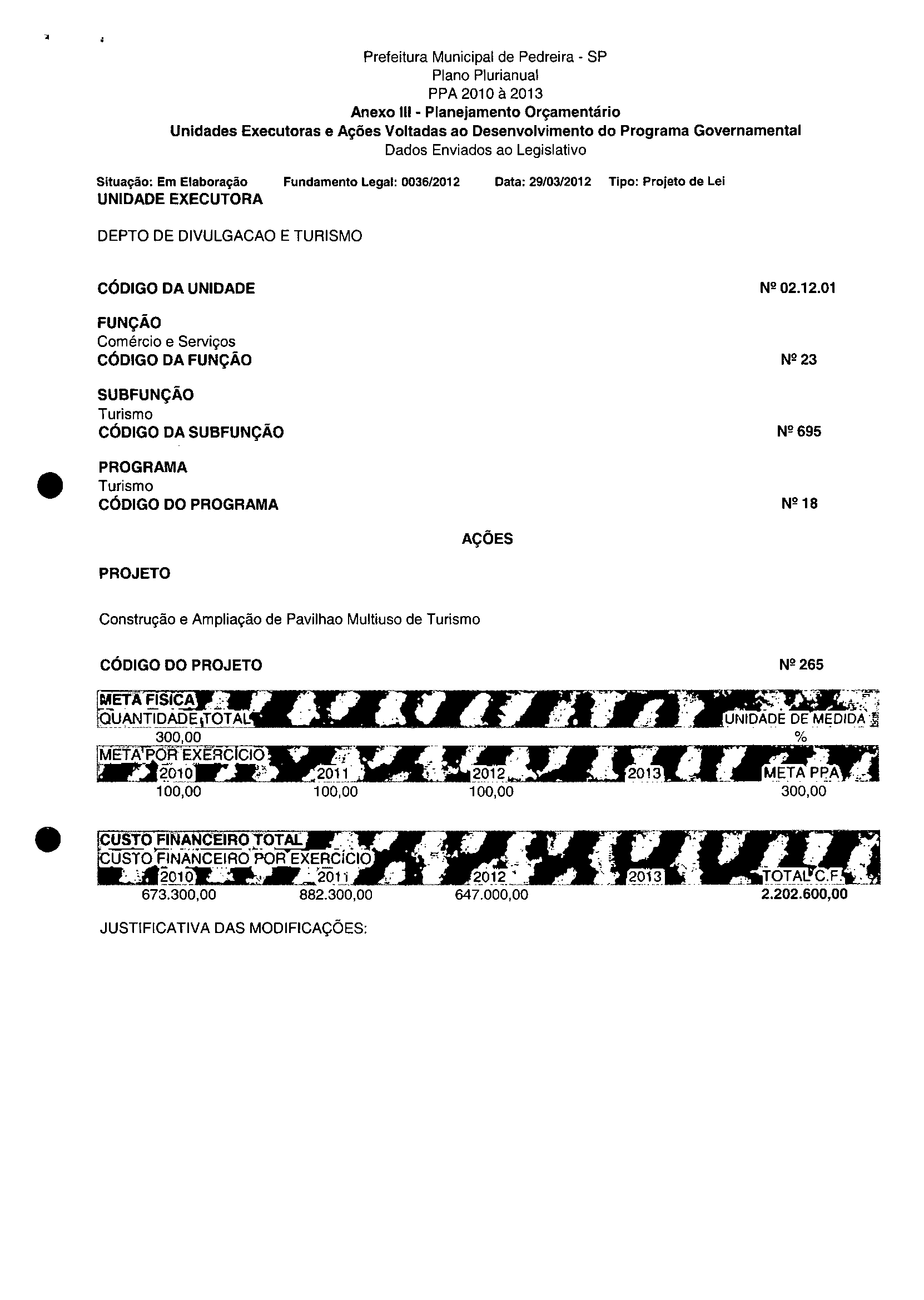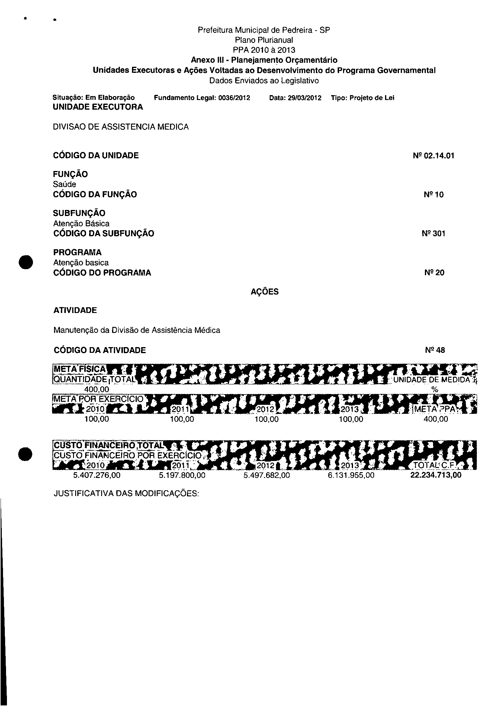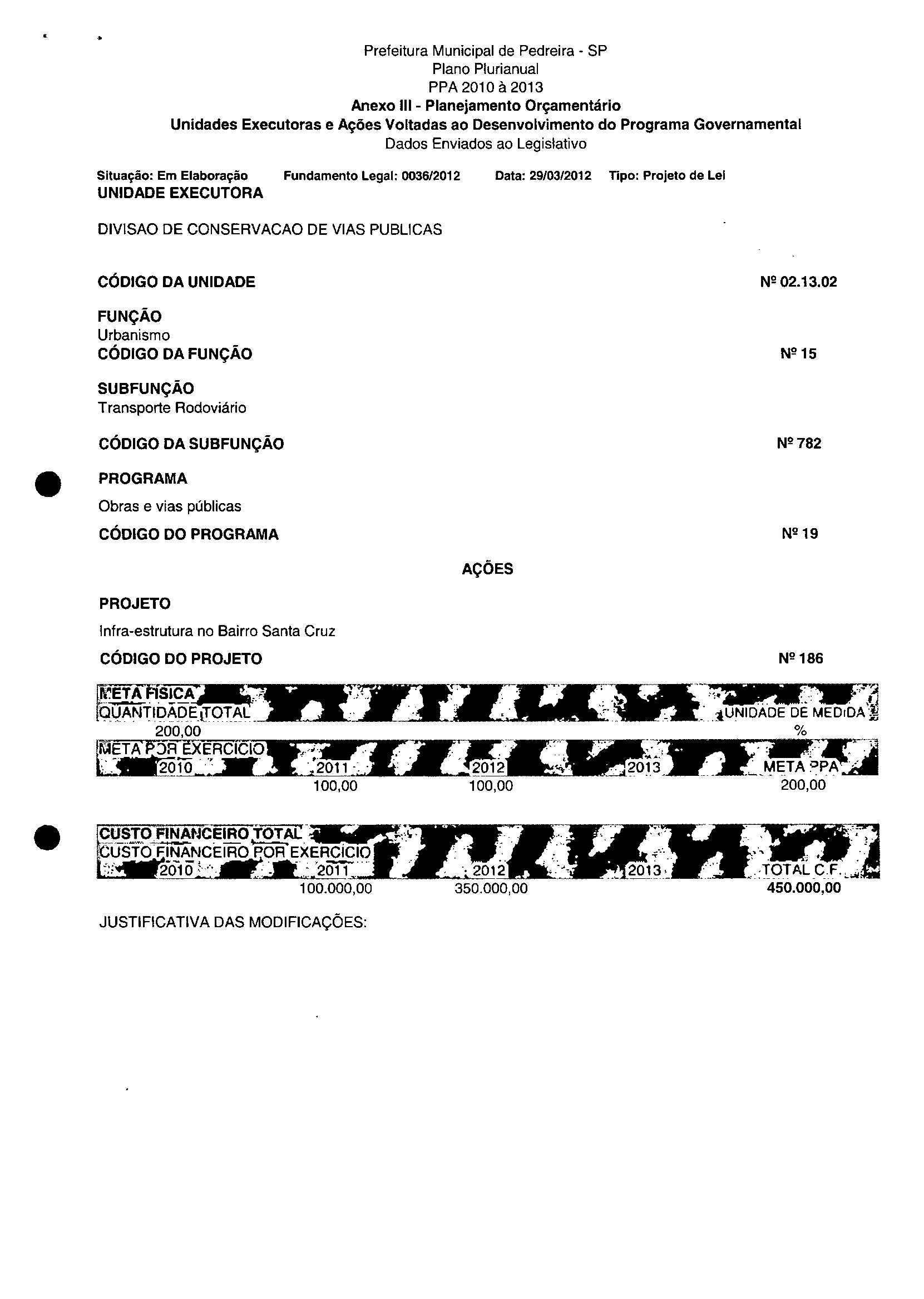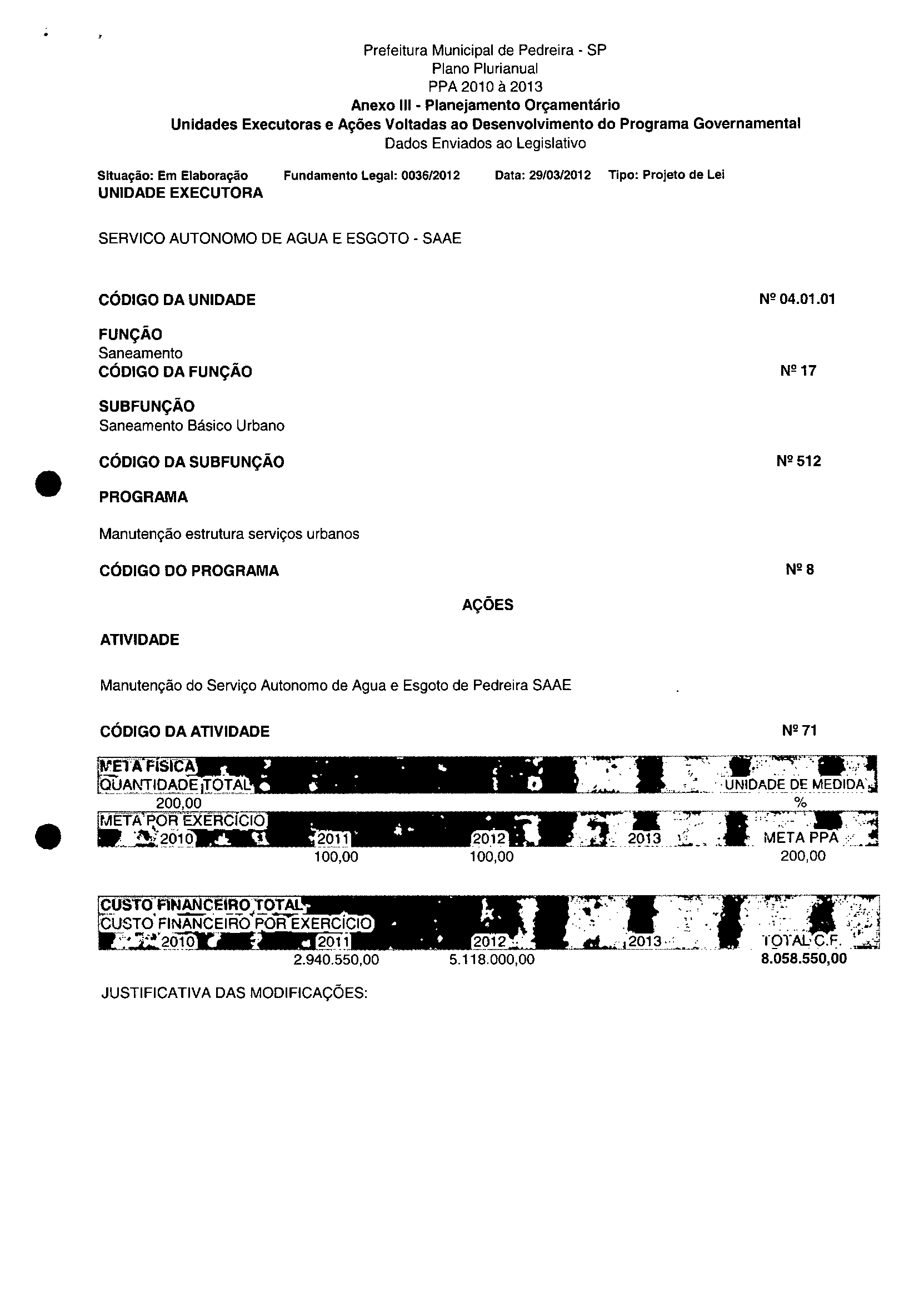 Ementa: Dispõe sobre a alteração dos anexos II e III -da Lei nº 2.977, de 5 de novembro de 2009 -Plano Plurianual para o Quadriénio de 2010/2013 e a alteração dos anexos Ve VI-da Lei nº 3,138, de 27 de junho de 2011 -Lei de Diretrizes Orçamentárias para o exercício de 2012.
