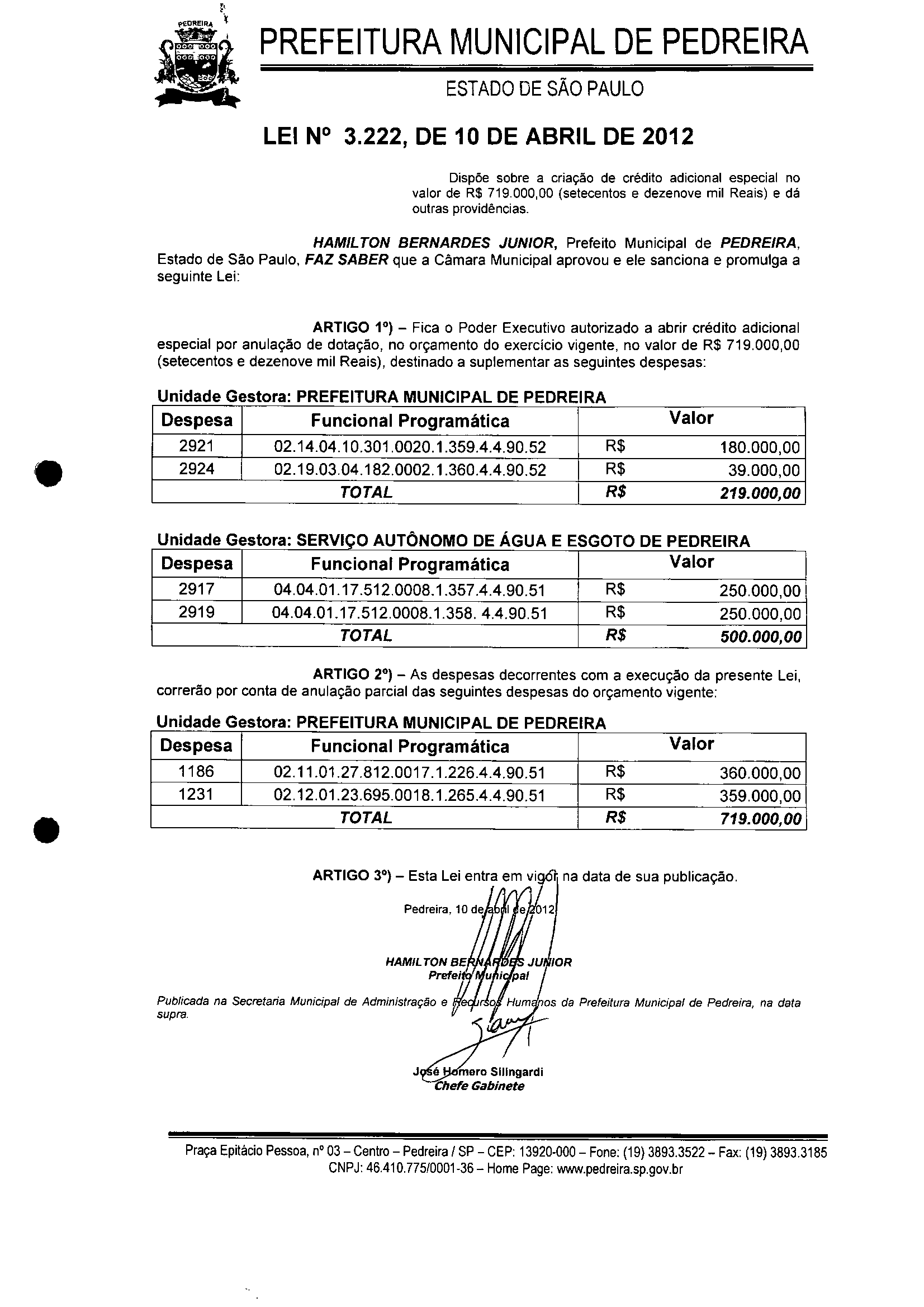 Lei Municipal - N° 3222 de 10/04/2012