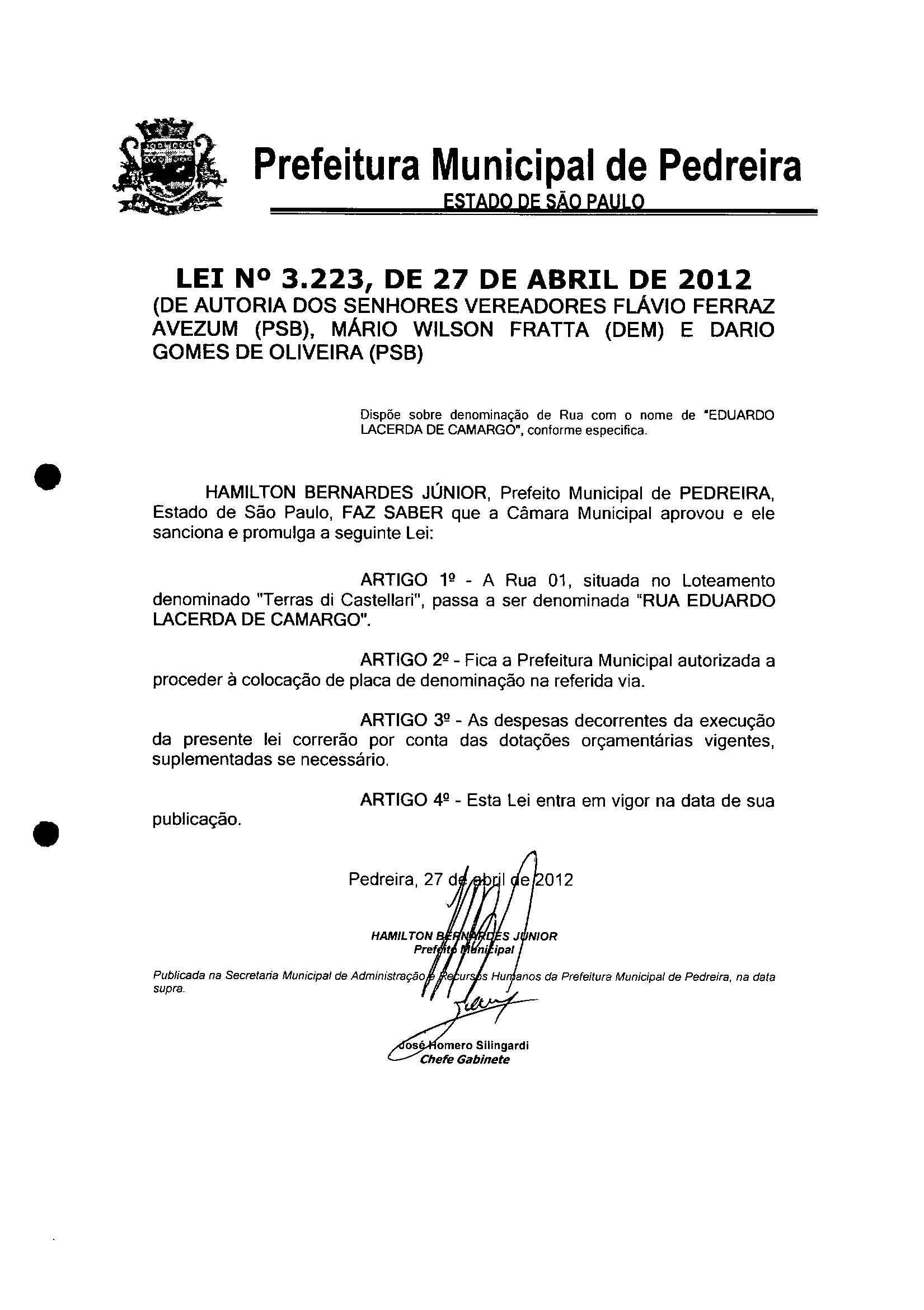 Lei Municipal - N° 3223 de 27/04/2012