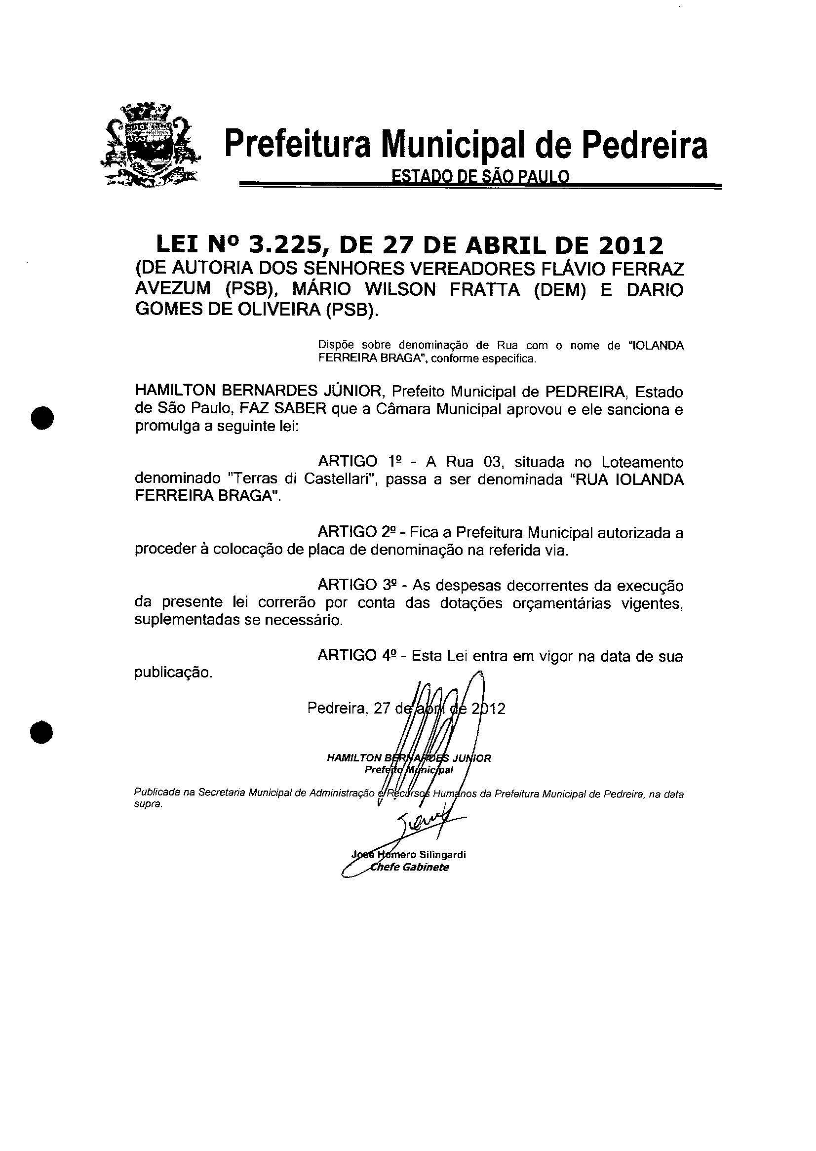 Ementa: Dispõe sobre denominação de Rua com o nome de "IOLANDA FERREIRA BRAGA". conforme especifica.