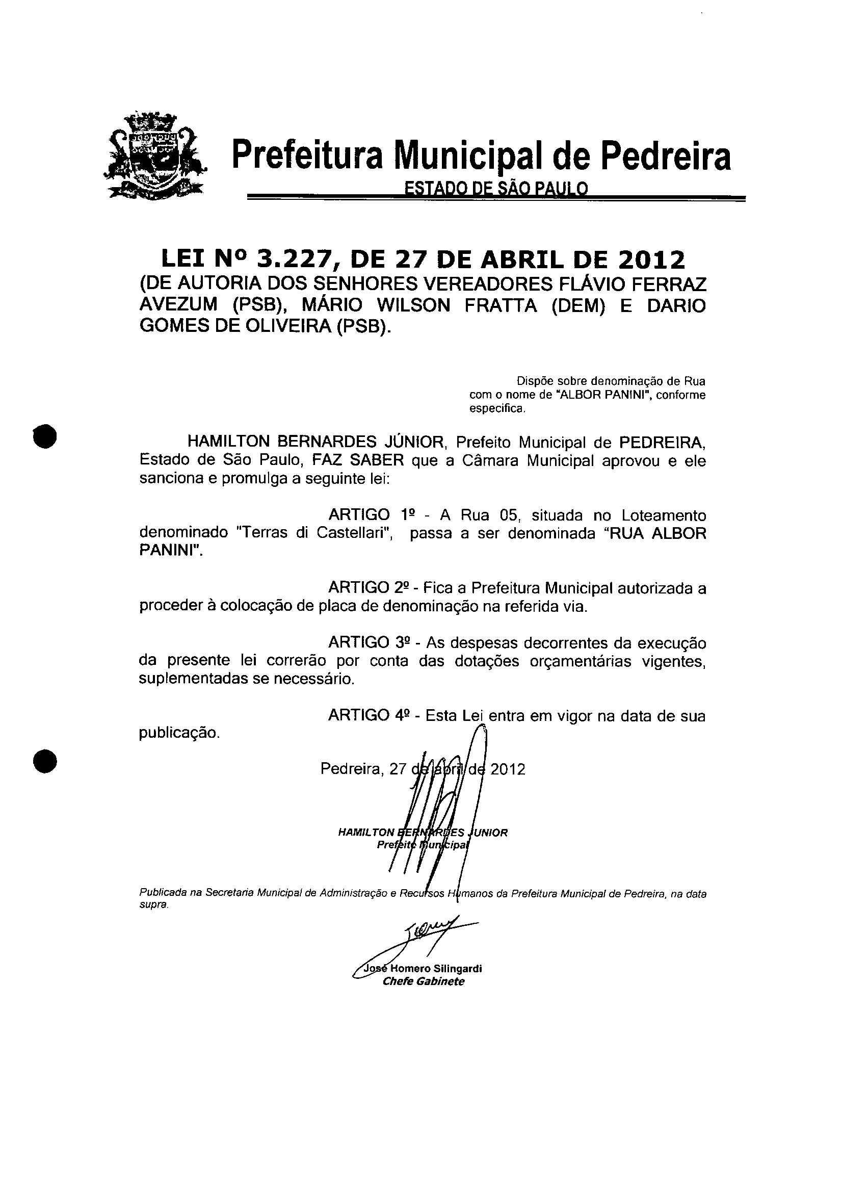 Ementa: Dispõe sobre denominação de Rua com o nome de "ALBOR PANINl", conforme especifica.