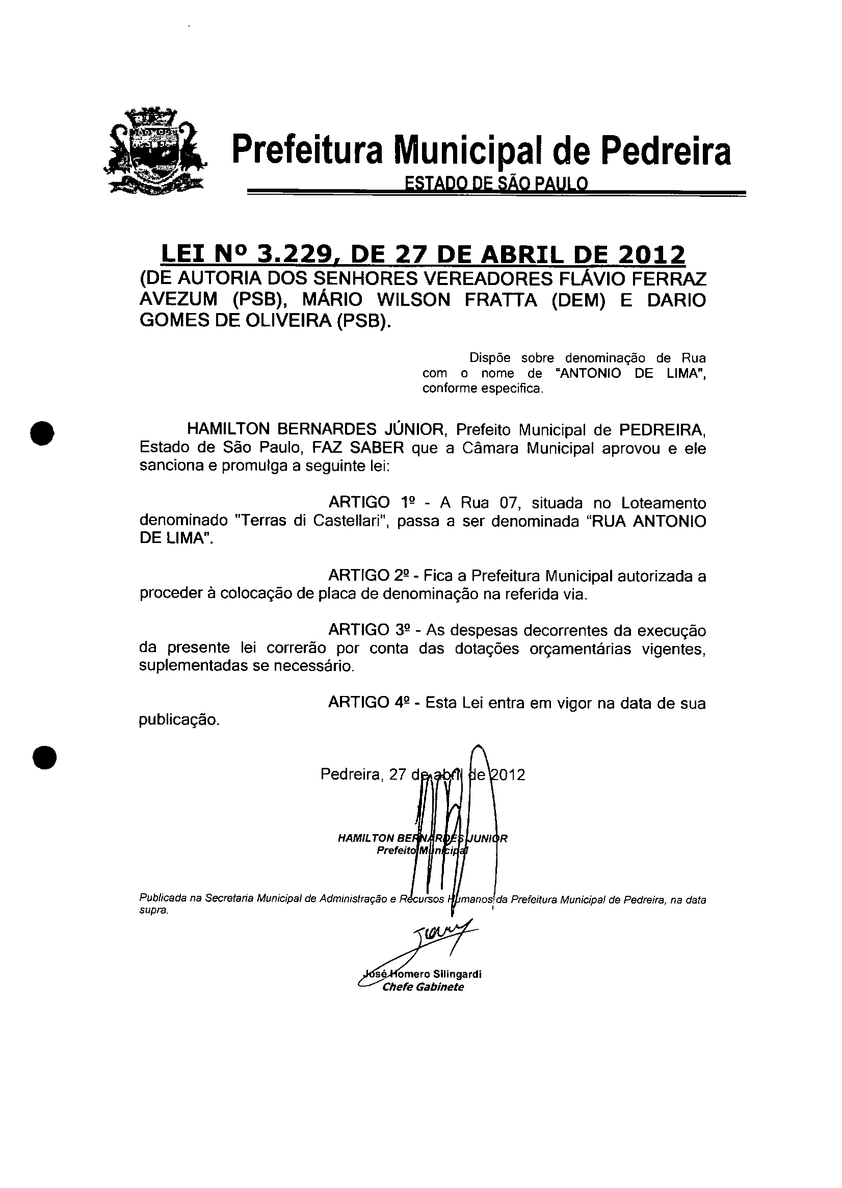 Lei Municipal - N° 3229 de 27/04/2012