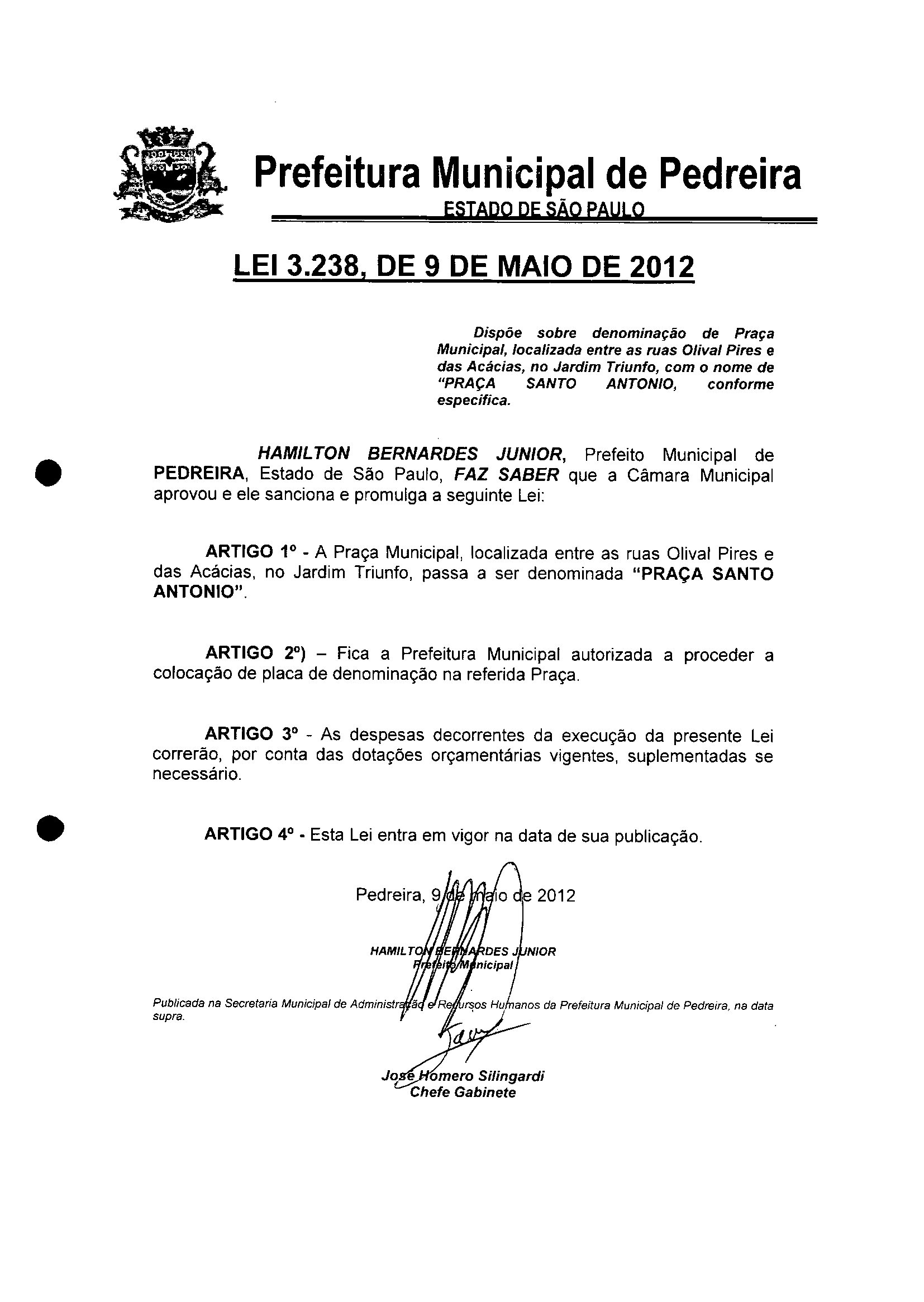 Ementa: Dispõe sobre denominação de Praça Municipal, localizada entre as ruas Olival Pires e das Acácias, no Jardim Triunfo, com o nome de "PRAÇA SANTO ANTONIO, conforme especifica.