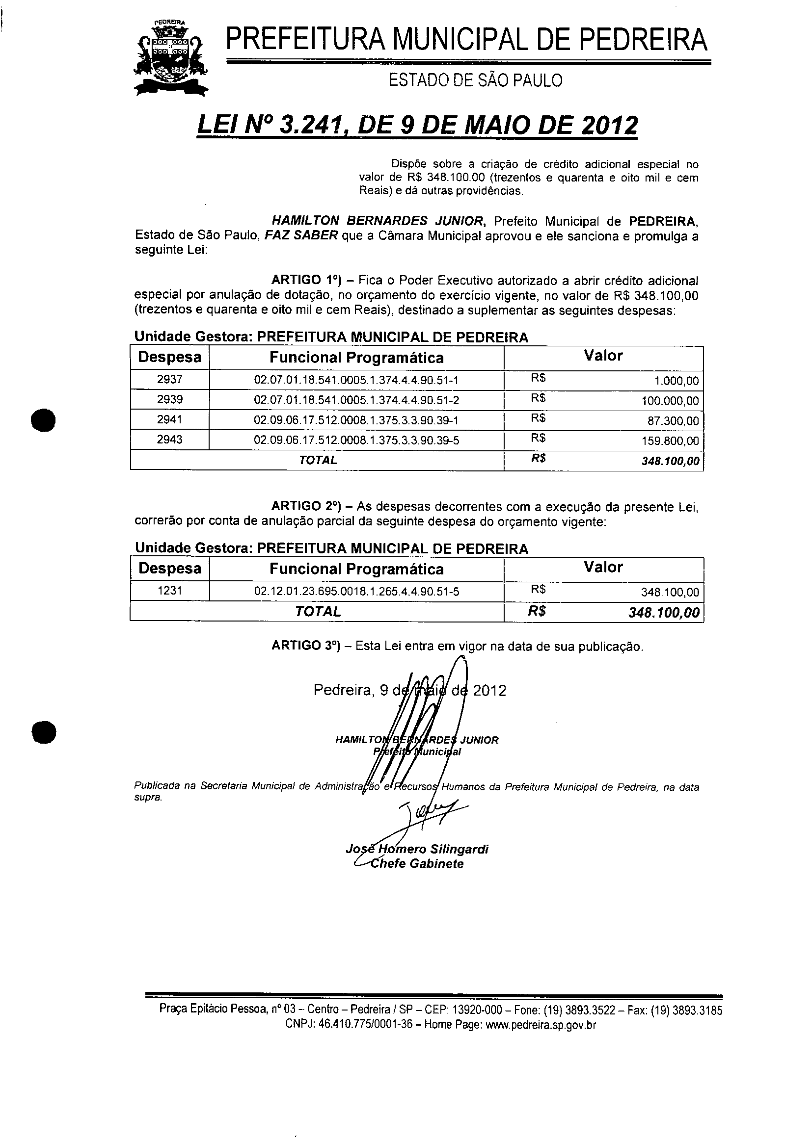 Lei Municipal - N° 3241 de 09/05/2012