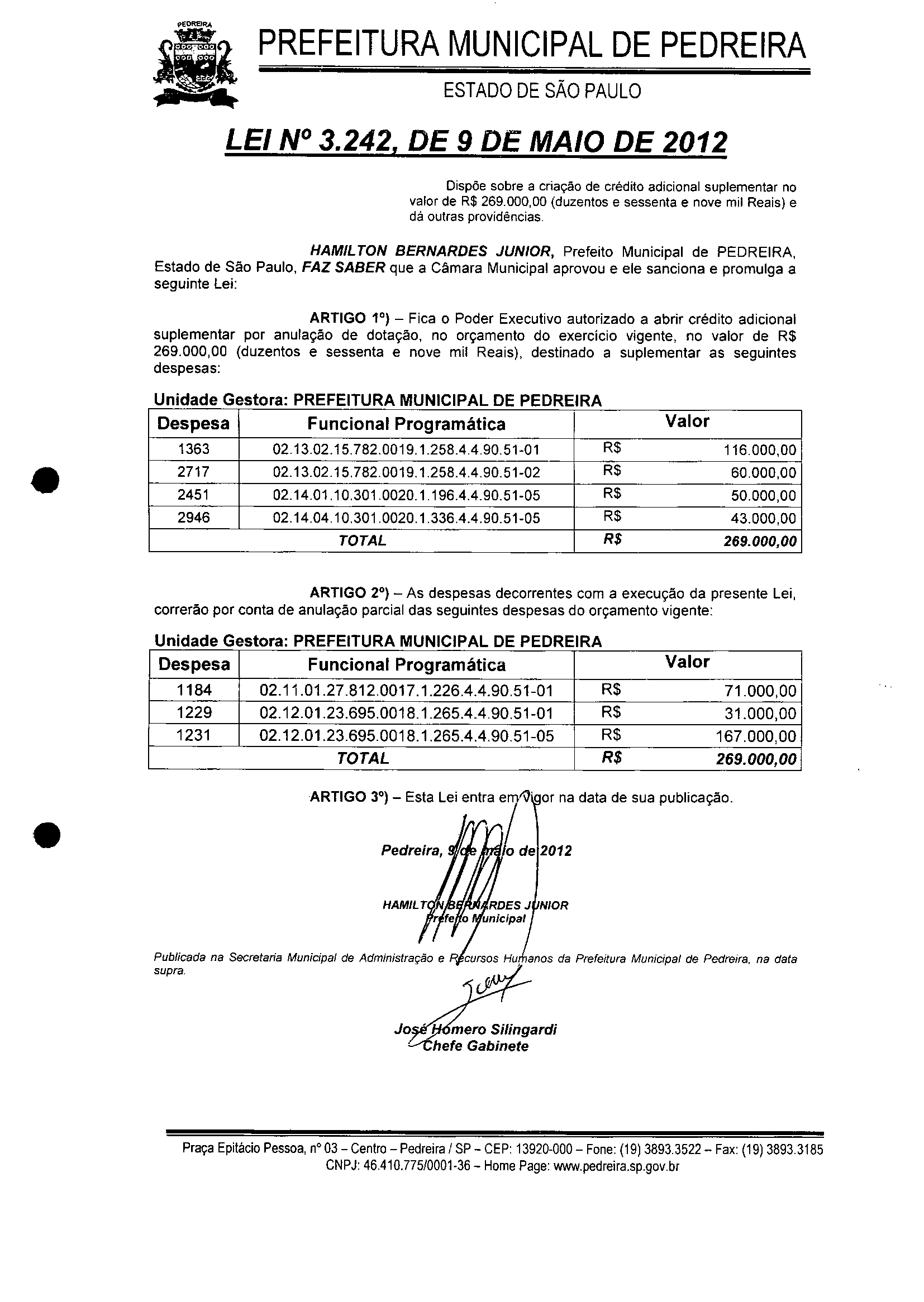 Ementa: Dispõe sobre a criação de crédito adicional suplementar no valor de R$ 269.000,00 (duzentos e sessenta e nove mil Reais) e dá outras providências.