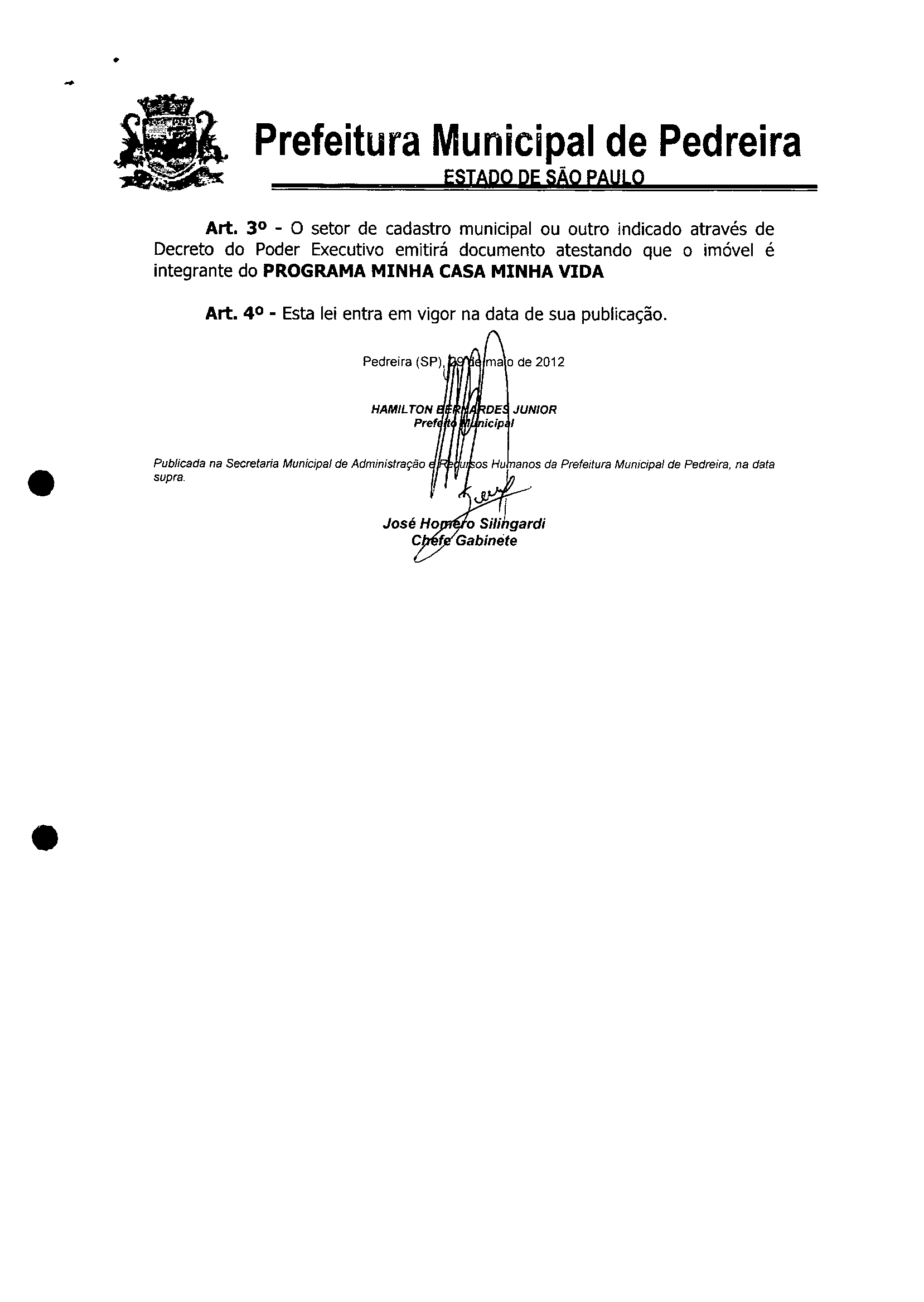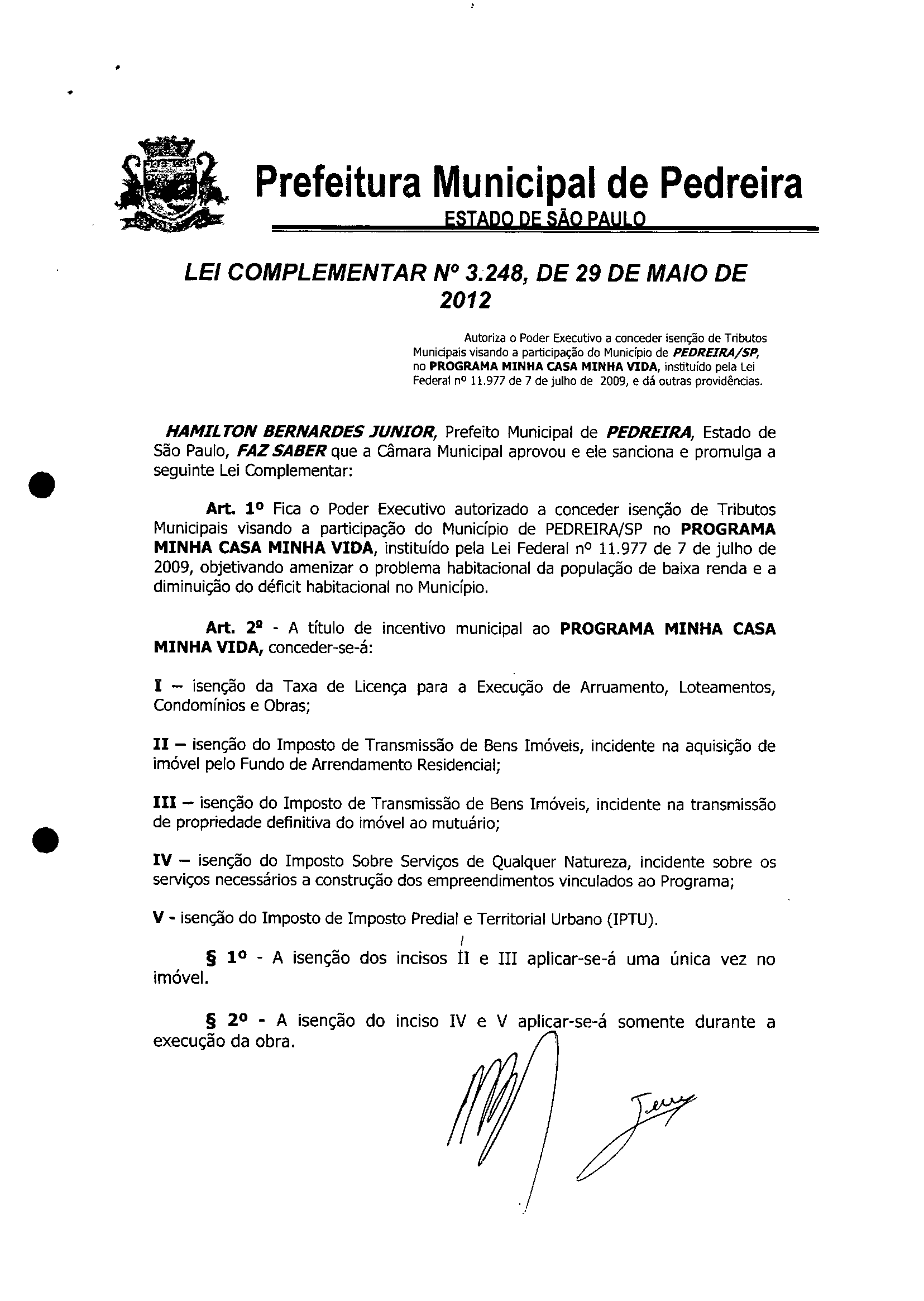 Ementa: Autoriza o Poder Executivo a conceder isenção de Tributos Munidpais visando a participação do Município de PEDREIRA/SP, no PROGRAMA MINHA CASA MINHA VIDA, instituído pela Lei Federal nº 11.977 de 7 de julho de 2009, e dá outras providências.