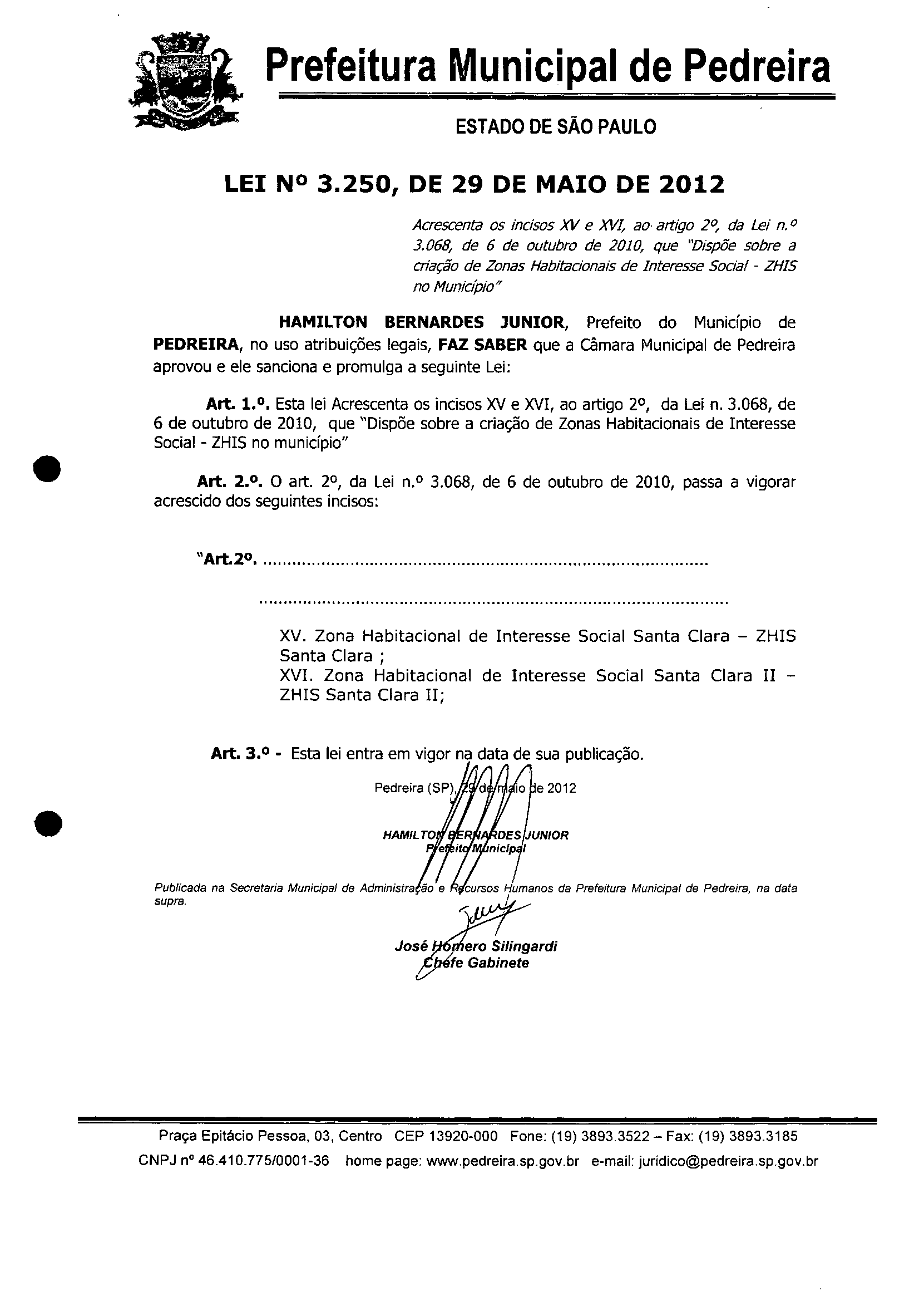 Ementa: Acrescenta os incisos XV e XVI; ao• artigo 2º, da Lei nº 3.068, de 6 de outubro de 2010, que ''Dispõe sobre a criação de Zonas Habitacionais de Interesse Social -ZHIS no Municipio"