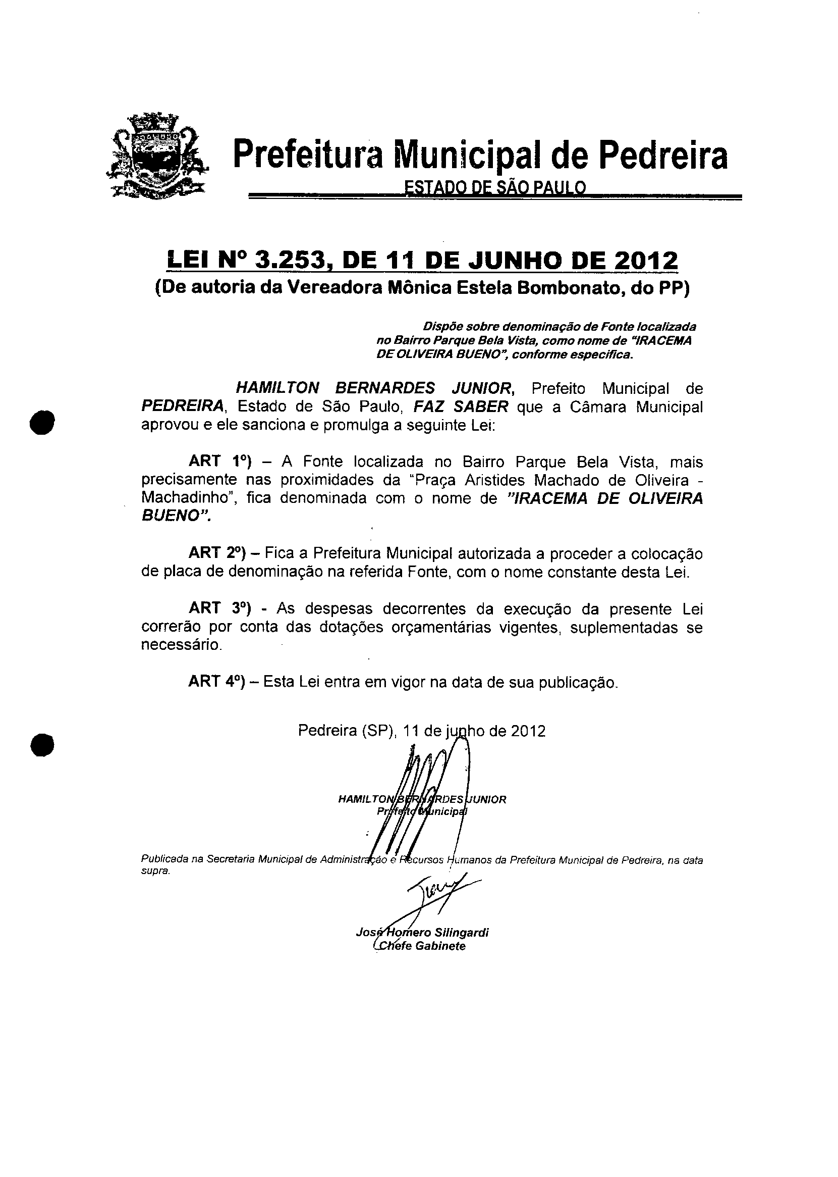 Lei Municipal - N° 3253 de 11/06/2012